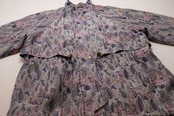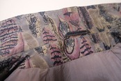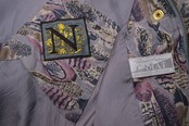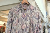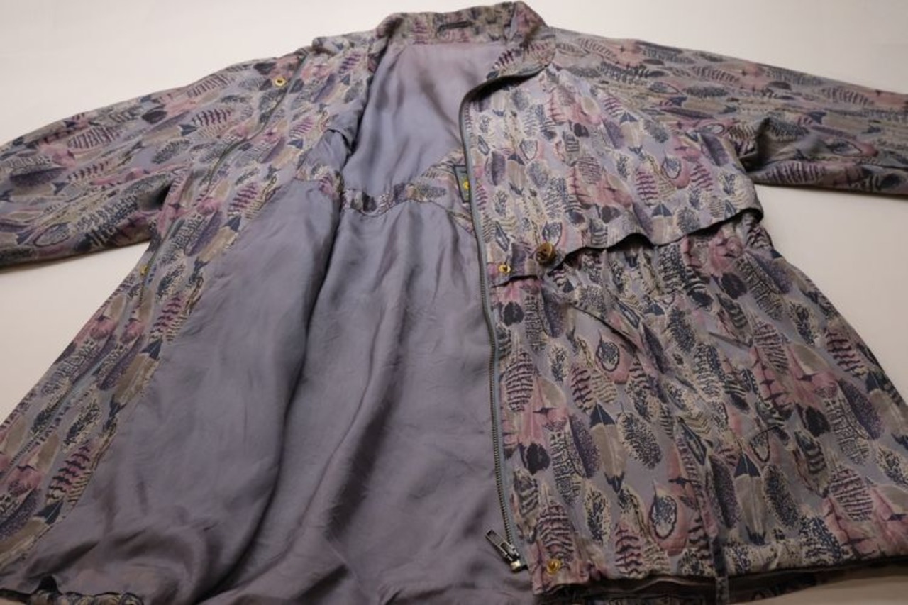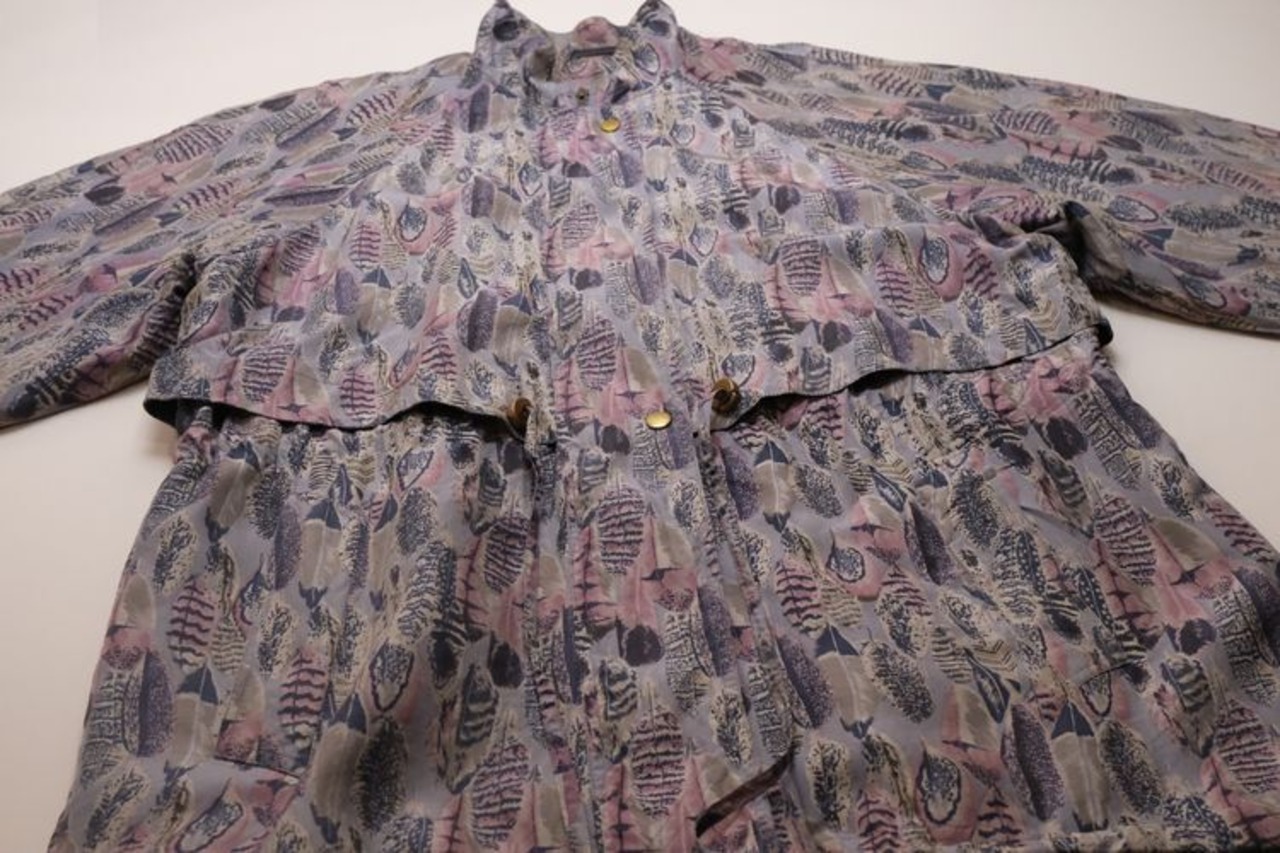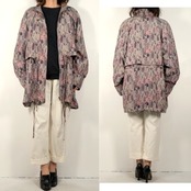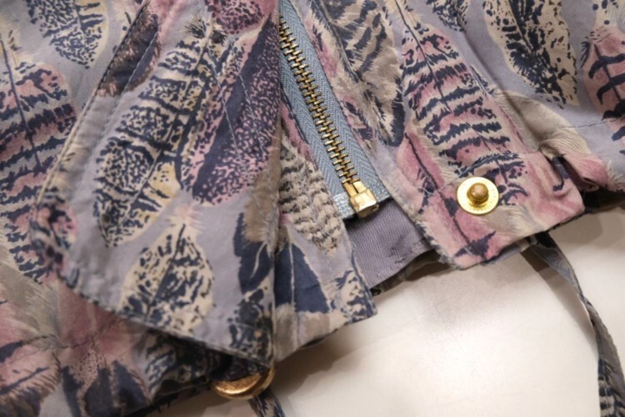 80年代フェザープリント柄のシルクジャケット。ウエストと裾にあしらわれた長いドローストリングが特徴的な、デザイン性の高いブルゾンジャケットです。ラグラン切り替えのバルーンスリーブに長いカフス、ハイネック、ウエストヨークが特徴のデザイン。ウエストと裾の紐で好みのシルエットを作ることができます。裏地付きの100%シルク生地はたいへん軽い素材感ながら保温性にも優れ、ロングシーズンお楽しみいただけます。コンディションとして多少の着用感があり、襟ぐりや裏地に変色、一番下のスナップボタンの欠損など見られますのでUSED品とご確認の上ご検討ください。淡い色みに溶け込むフェザーのテキスタイルも雰囲気良く、さらりと羽織るだけで人と違ったスタイリングが完成します。