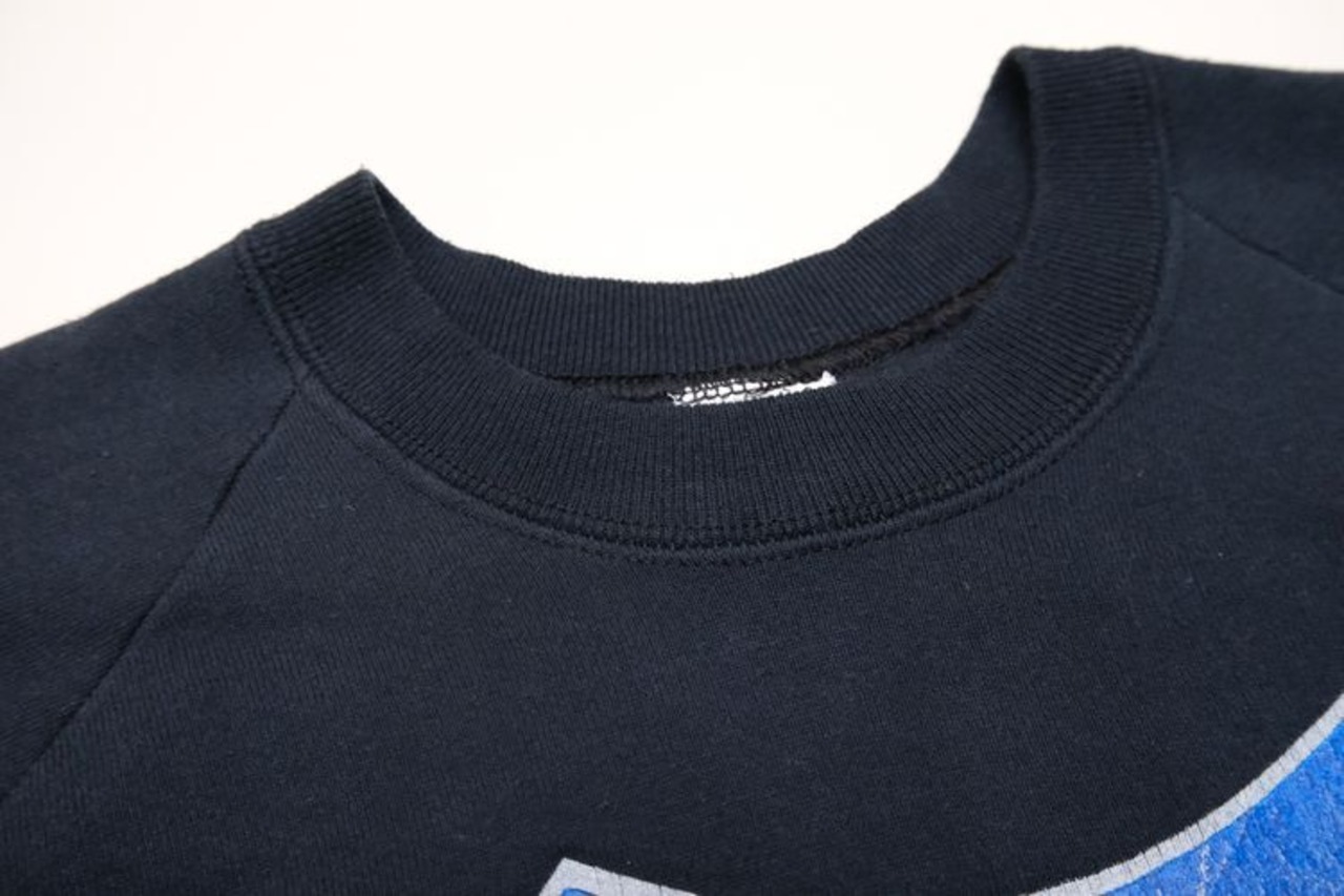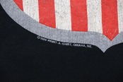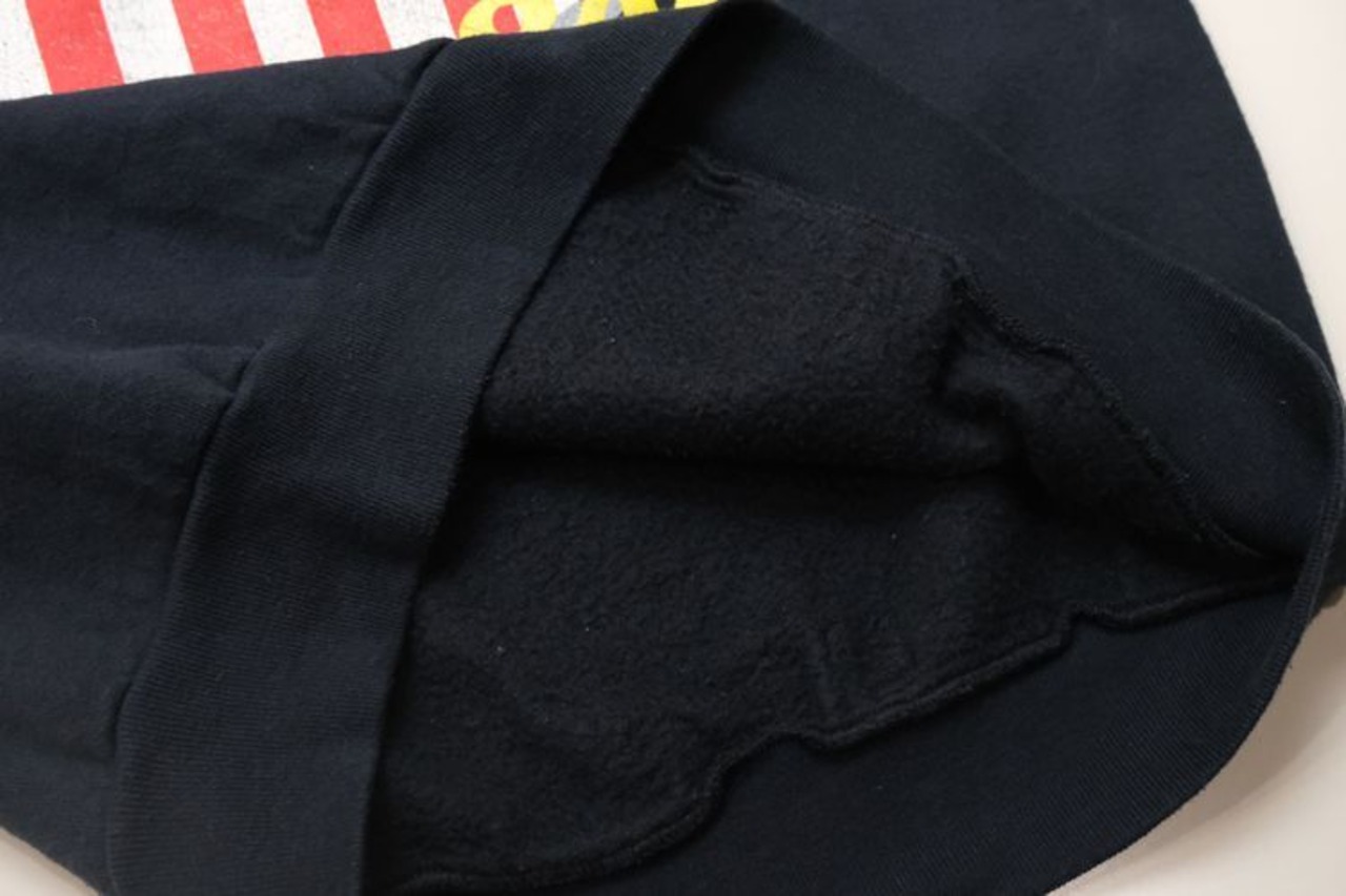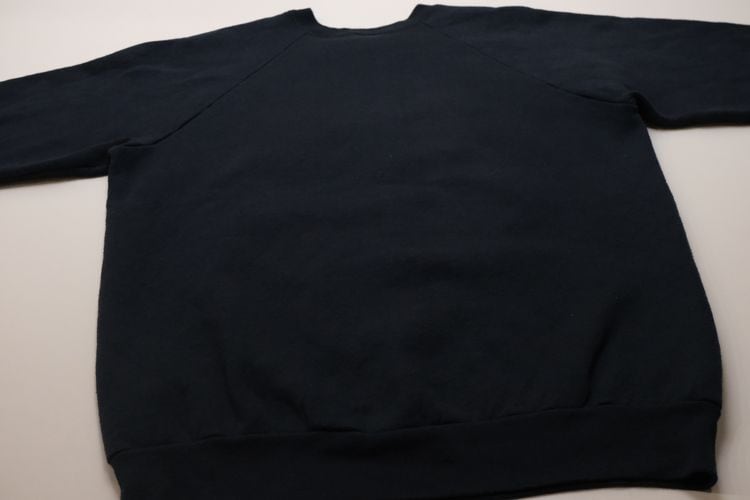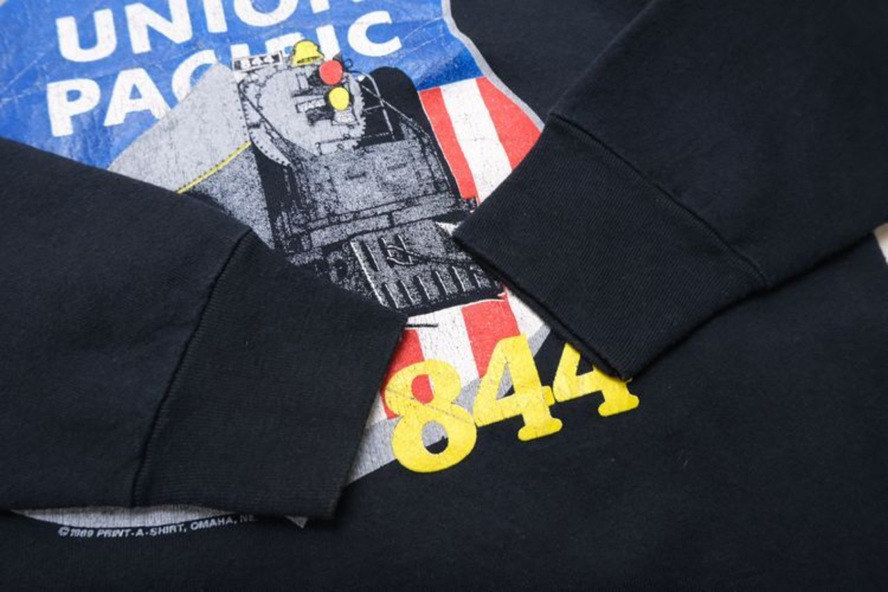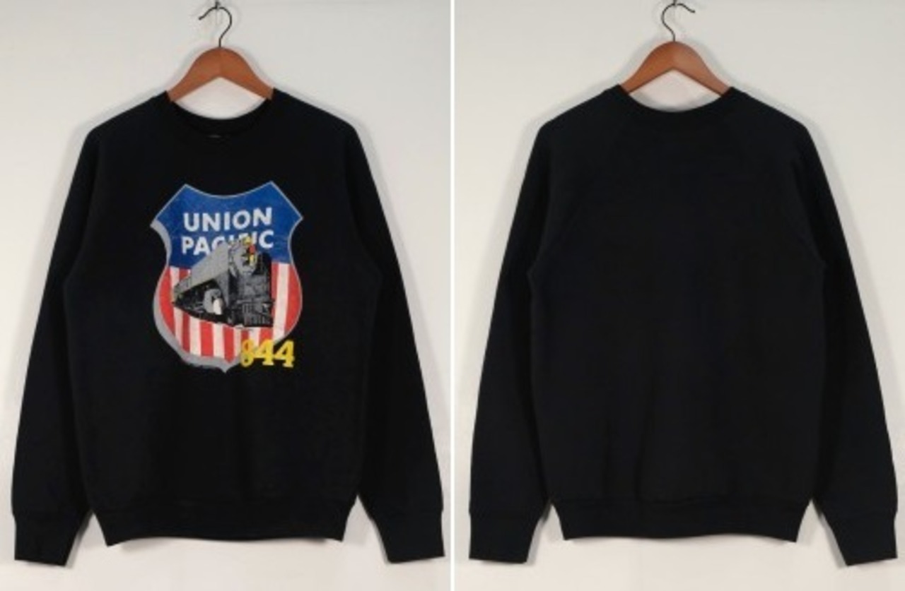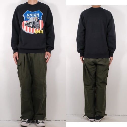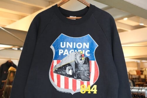1851年にケンタッキー州ボーリンググリーンで創業された老舗カジュアルウェア・ブランド"FRUIT OF THE LOOM"から80年代のアメリカ製スウェット。程よい厚さでやわらかな肌触りのコットン×ポリエステル(50/50)混紡素材を使用し、着用と経年によりフェードしたブラックの色味に1点ものらしい風合いの良さを感じるアイテムです。細身ですっきりとした見た目を生むラグラン・スリーブ、フロントにはアメリカの大手鉄道会社"UNION PACIFIC"ロゴと1944年にユニオン・パシフィック鉄道最後の蒸気機関車として登場した"844"を組み合わせたプリントがたいへん個性的な仕上がりとなっています。着用の上で問題となるダメージや汚れはございませんが、全体的に色褪せや毛羽立ち、プリントにクラックのあるUSEDコンディションですので、この1点ものらしい風合いの良さを好まれる方におすすめ致します。幅広いボトムスにさらっと合わせるだけでコーディネートの主役となる存在感があり、表記"L"ですが小ぶりなサイズ感のため男性に限らず女性にもおすすめです。