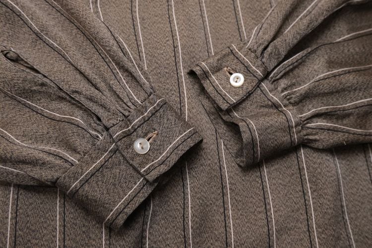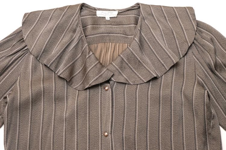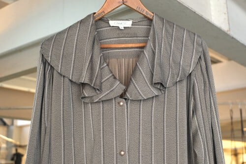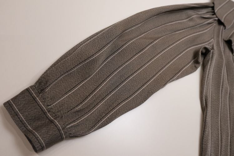 80年代イタリア製シルクサテンのラフルカラーブラウス。クールさも感じるドレッシーなデザインと、それを引き立てる仕立ての美しさが際立つ一品です。ヨークの縁に細かくギャザーを寄せたゆったりシルエット。パフスリーブと大きなラペルが特徴のデザインに、パールボタンが華やかさを添えています。シルクサテン生地はしっかりと厚みがあり、美しい光沢とのびやかなドレープ感が魅力です。全てのパーツが柄合わせされ、繊細な素材を用いながら歪みのない仕立て、きめ細かな縫製や細部の始末からも作りの良さがうかがえます。とくに目立ったダメージはございませんが、多少の着用感が見られますのであくまでUSED品とご理解の上ご検討ください。フォーマルの装いにも、テイストの異なるカジュアルなボトムスなど合わせドレスダウンした着こなしも素敵ですね。