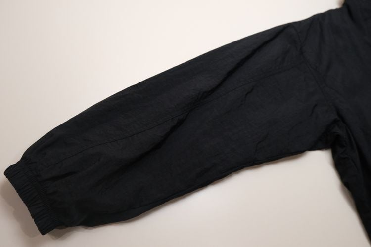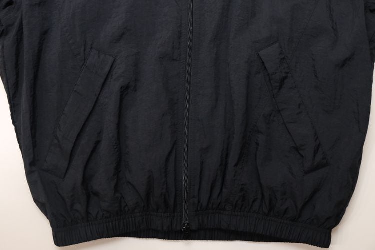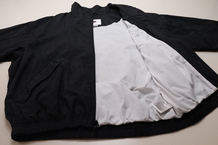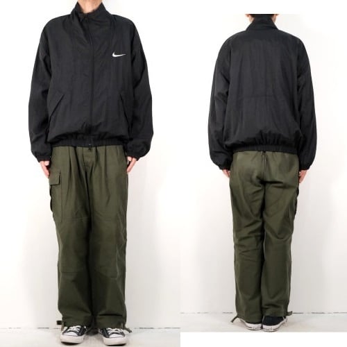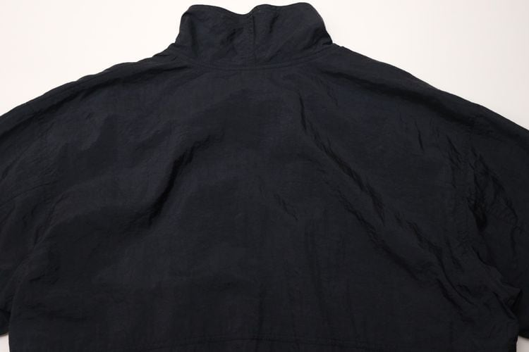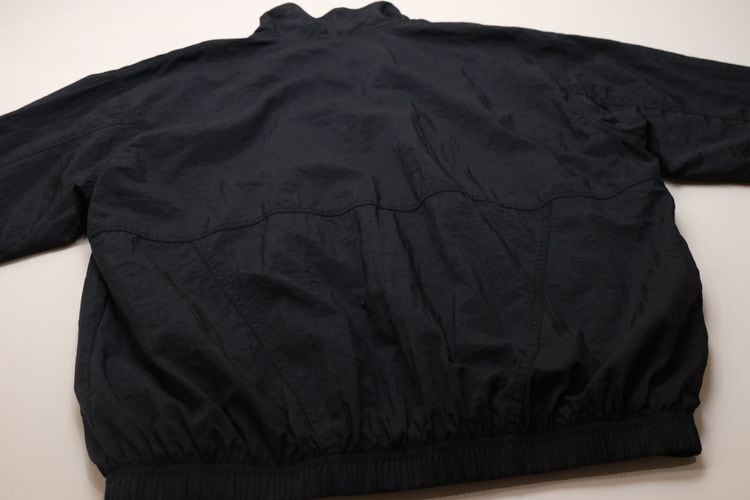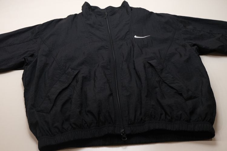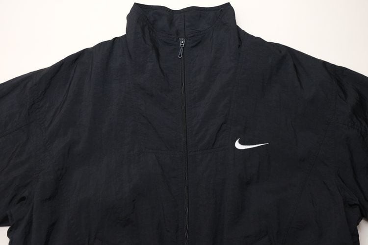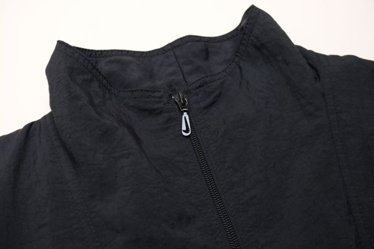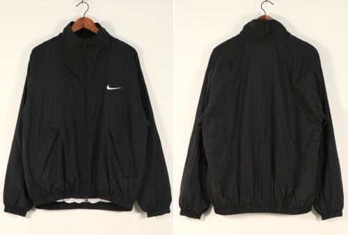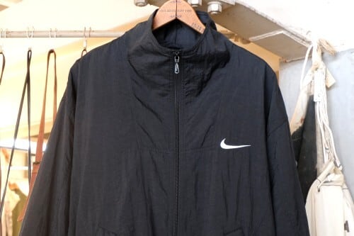 1964年にオレゴン州で創業された世界最大のスポーツ・ブランド"NIKE"から90年代頃と思われるジャケット。シワ加工が施された薄手でシャリッとした100%ナイロンを使用し、単色ブラックのシンプルでスマートな佇まいに魅力のあるアイテムです。ゆとりのあるオフショルダーのボリュームあるシルエット、オリジナルのスライダーが付くジップアップ・フロント、スラッシュ・ポケット、ボディ・ライニングにポリエステル×コットン(65/35)混紡素材、スリーブ・ライニングにポリエステルが張られ、左胸に刺繍で入るホワイトの"SWOOSH"ロゴが控えめながらも存在感のあるアクセントとなっています。着用の上で問題となるダメージや汚れはございませんが、全体的に着用感のあるUSED品ですのでご理解の上ご検討ください。軽く羽織れる薄手のアウターですのでトップ1枚では少し肌寒い季節や夜間の気温が低いときに重宝し、こちらのジャケットは表記"YOUTH/L"の小ぶりなサイズのため男性に限らず女性にもおすすです。