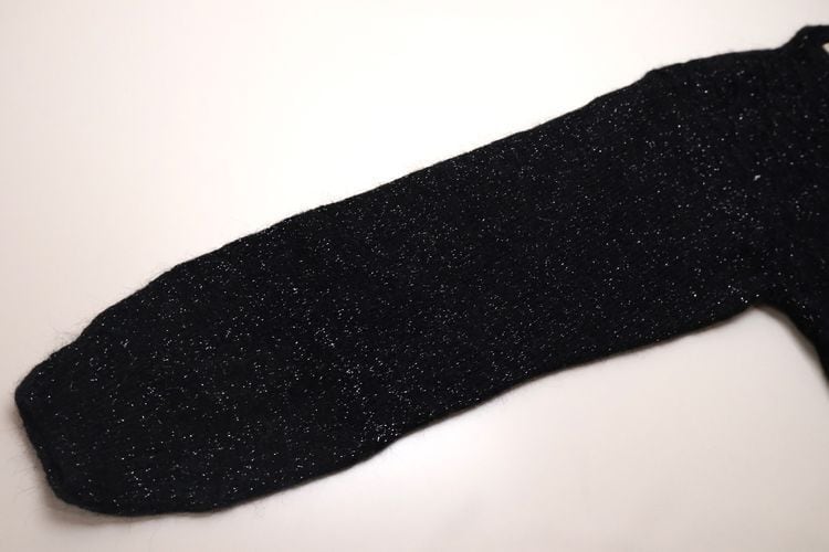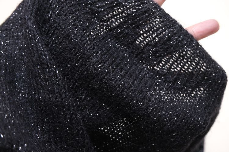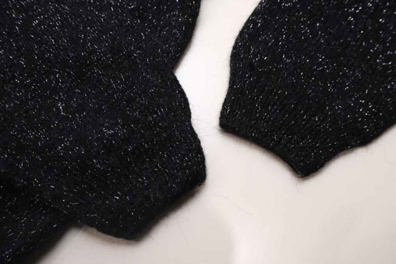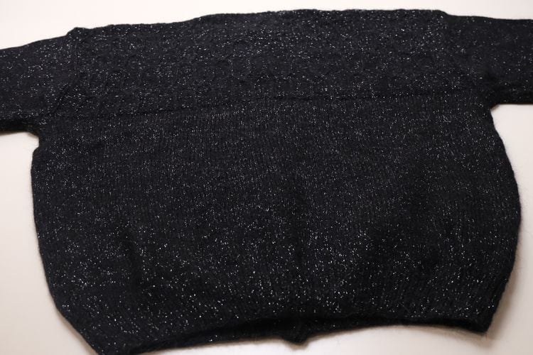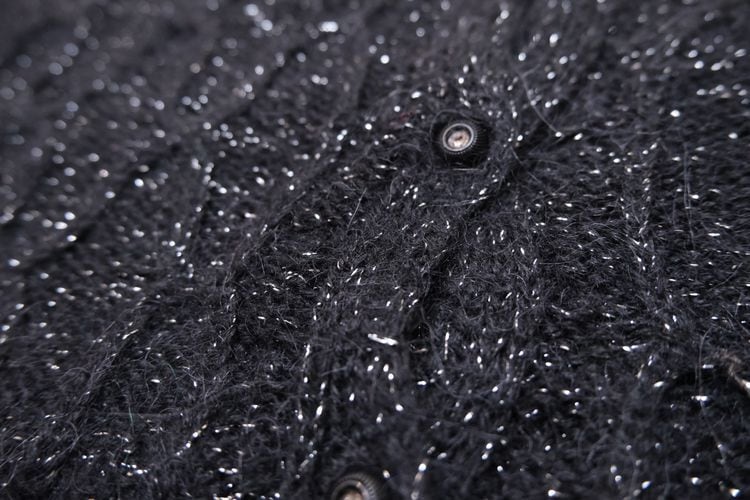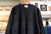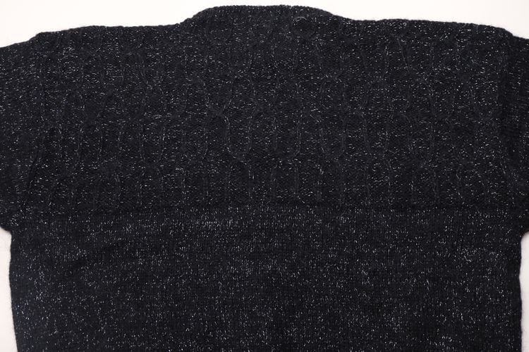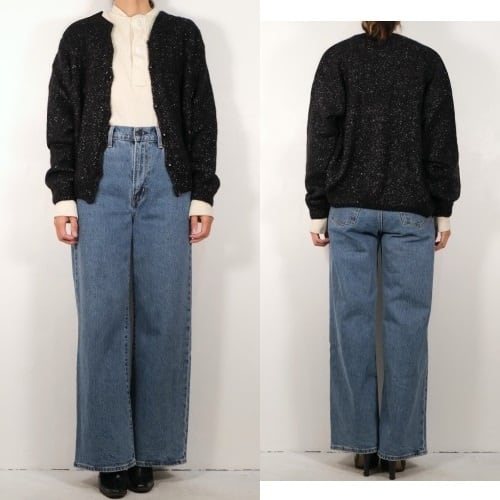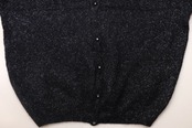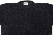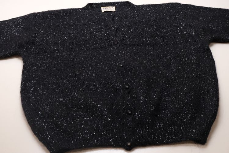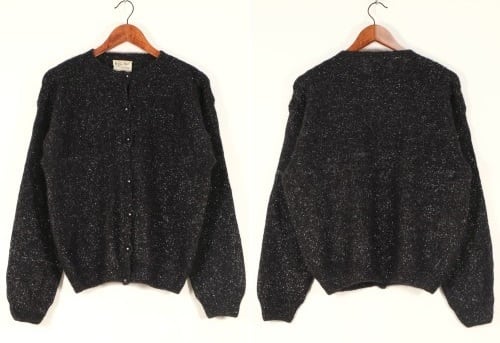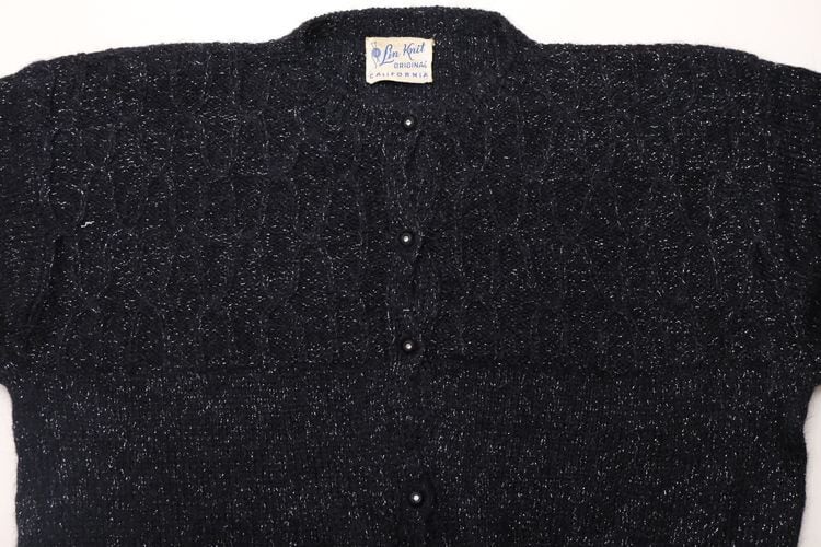 50年代ブラック色モヘアのクルーネックカーディガン。シルバーの糸が混じった毛糸を用いた、ドレッシーな印象のミドルゲージニットカーディガンです。まあるいシルエットに締まった裾と袖口、ボタンを留めると裾がウエストラインにフィットします。前後のヨークにはアールデコ調の幾何学的な模様編みが施された珍しいデザイン、ラインストーンがあしらわれた小粒のデコラティブボタンはアメリカンヴィンテージならではのディテールとなっています。毛足の長いモヘアの混じるニットはふわりとした柔らかさに加えコシの強さがあるヴィンテージならではの風合いに優れ、空気を含ませ緩く編み上げられており、軽く締め付け感のない着心地も魅力です。コンディションは良く、とくに目立ったダメージは見られません。メタリックカラーがモダンな印象で、モードやスポーツミックスなどの意外性のある着こなしにもよく合いそうです。