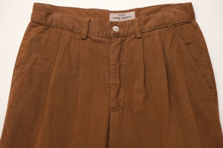 1981年にカリフォルニア州ロサンゼルスで設立された"GUESS"から、創業者である"GEORGES MARCIANO"が手掛けていた初期モデルのみに見られる"GUESS by GEORGES MARCIANO"タグの付く80年代初期頃のアメリカ製パンツ。起毛の施されたやや厚手でやわらかな肌触りのモールスキン(100%コットン)を使用し、赤みがかったブラウンのやわらかな色味とモールスキンらしい毛羽立った独特な表情に魅力のあるアイテムです。腰回りにゆとりのあるツータック、裾口に掛けてテーパードされたシルエットは見た目にすっきりとした着用を楽しんでいただけます。着用の上で問題となるダメージや汚れはございませんが、全体的に着用感のあるUSEDコンディションですのでご理解の上ご検討ください。ややオーバーサイズのトップと合わせたゆるい雰囲気から、少し細みのトップと合わせたバランスのあるコーディネートまで幅広く使えるおすすめの1本です。