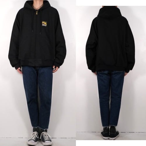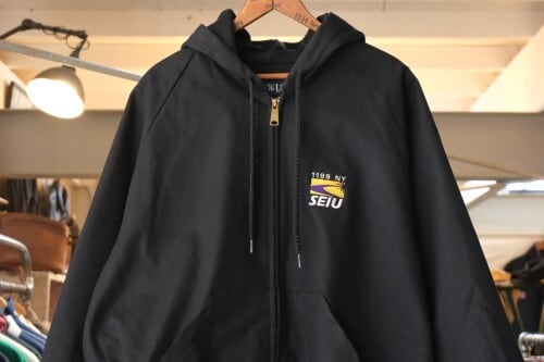 ボウリング・シャツのブランドとして有名な1937年創業の"KING LOUIE"からアクティブ・ジャケット(90年代/アメリカ製)。シェルに厚手でしっかりとした100%コットン・ダック地を使用し、内側に張られたメッシュ・ライニングによる通気性が魅力のアイテムです。リラックスした着用に適したボリュームあるシルエット、すっきりとした見た目を生むラグラン・スリーブ、フード付き、スラッシュ・ポケット、そして左胸に刺繍で入る"1199 NY SEIU/ Service Employees International Union"のロゴがアクセントとなっています。着用の上で問題となるダメージ汚れはございませんが、全体的に着用感のあるUSEDコンディションですのでご理解の上ご検討ください。細身のボトムスにざっくり羽織るとバランスよくまとまり、合わせるものを選ばずカジュアルな装いを楽しんでいただきたいジャケットです。