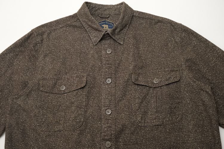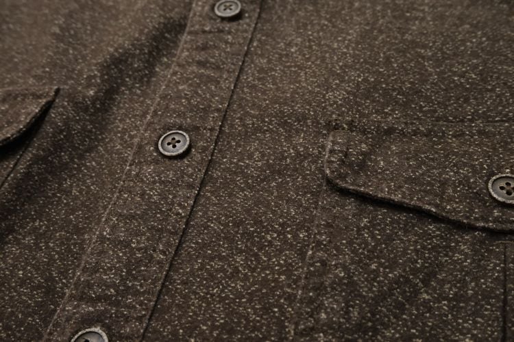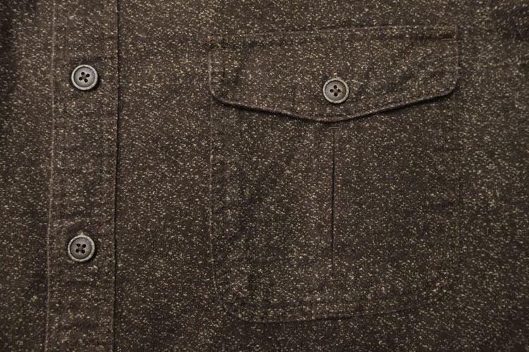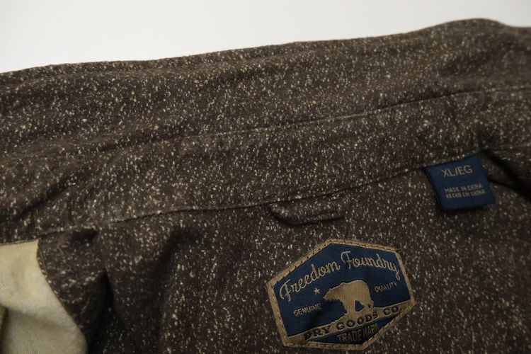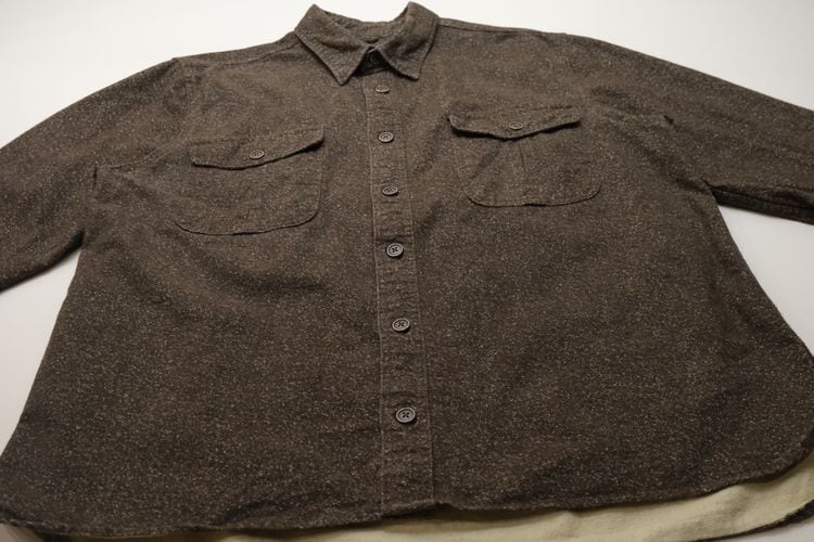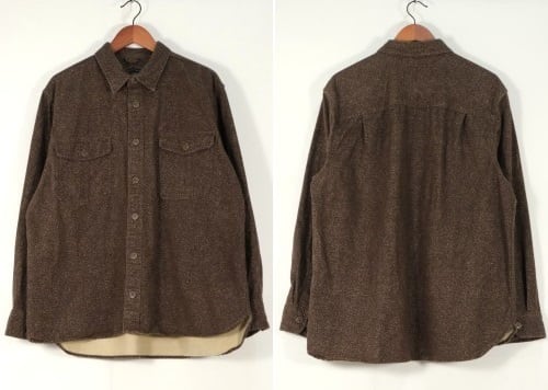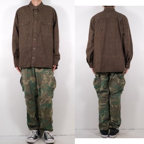 カリフォルニア州カマリロで設立された"Freedom Foundry"からシャツ。やや厚手でやわらかな肌触りのシャモアクロス(100%コットン・フランネル)を使用し、ブラウンとベージュの混じり合う霜降り状の色味に魅力を感じるアイテムです。肩幅に対して身幅がやや広いボリュームあるシルエット、小ぶりな襟、やや大きめの前たてボタン、フラップ付きの両胸ポケットなどシンプルな中にもさりげないディテールの良さがポイントとなっています。着用の上で問題となるダメージや汚れのない良いコンディションですが、着用感のあるUSED品ですのでご理解の上ご検討ください。自然なフェード感と起毛によるぬくもりがこなれた雰囲気を生み、温かく快適に着られアウトドアからタウン・ユースまで幅広く使える万能な1枚です。