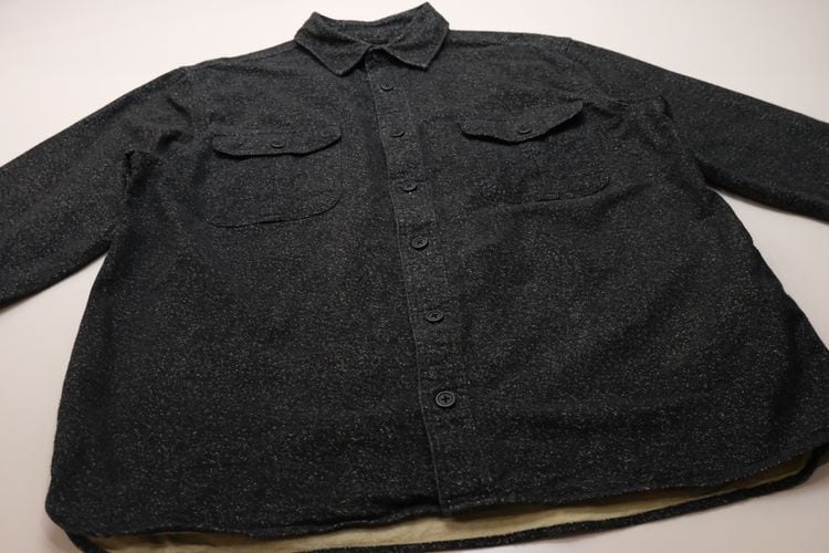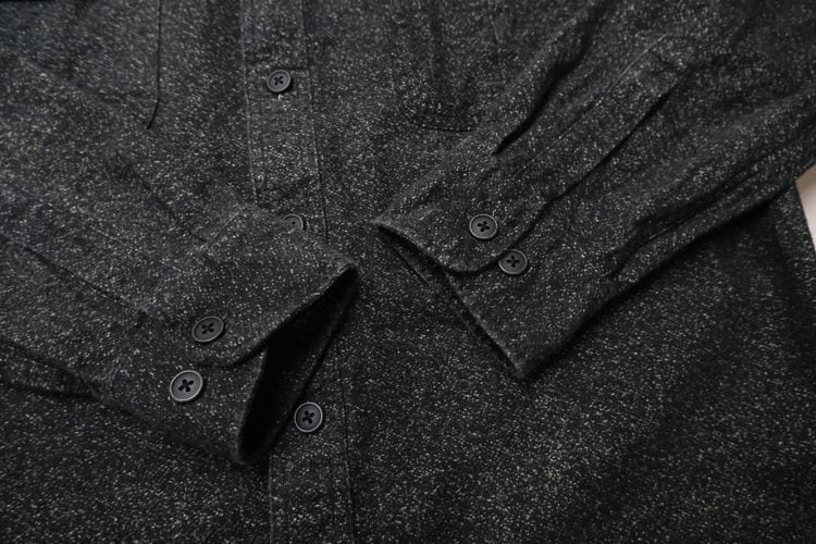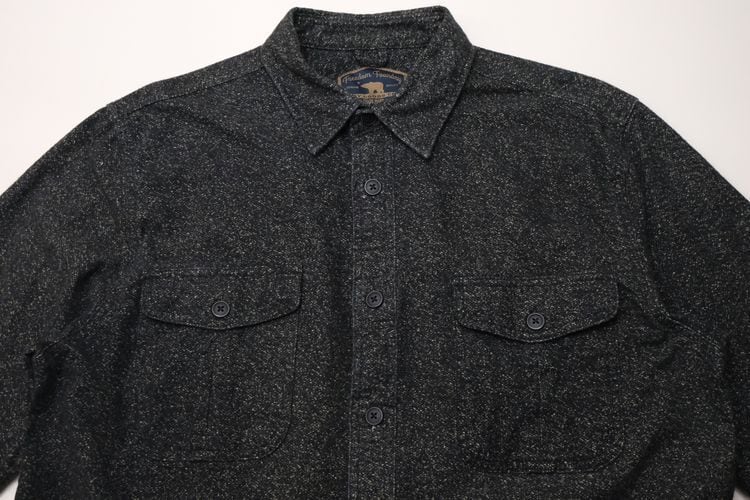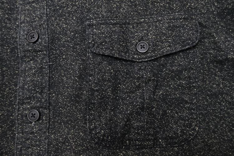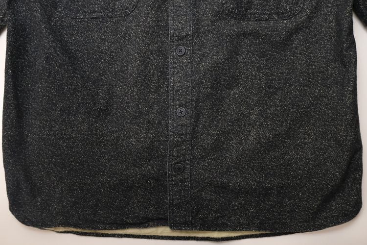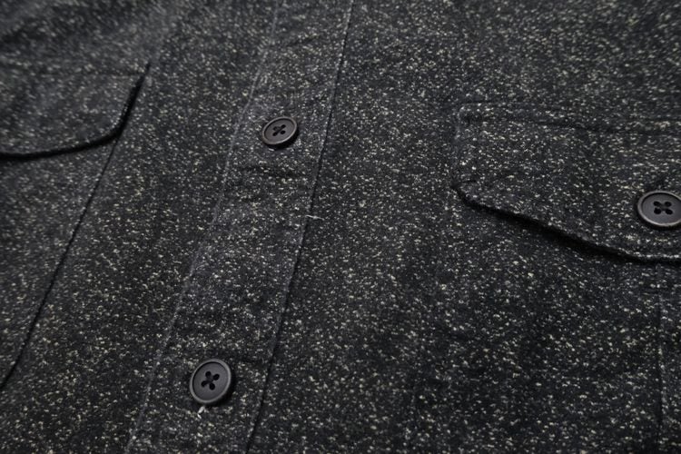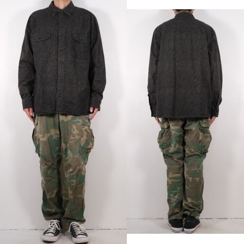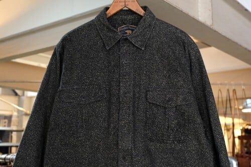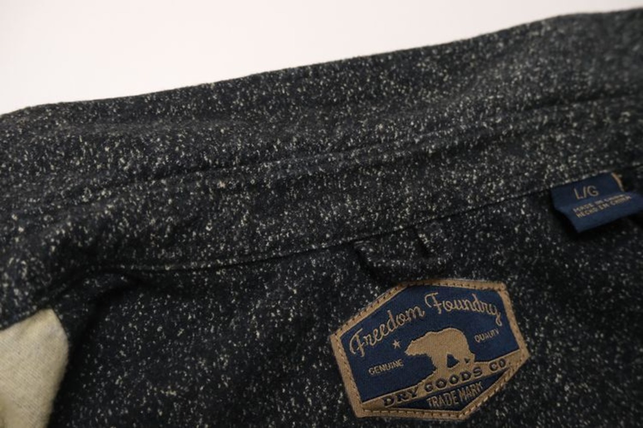 カリフォルニア州カマリロで設立された"Freedom Foundry"からシャツ。やや厚手でやわらかな肌触りのシャモアクロス(100%コットン・フランネル)を使用し、チャコールブラックとベージュの混じり合う霜降り状の色味に魅力を感じるアイテムです。肩幅に対して身幅がやや広いボリュームあるシルエット、小ぶりな襟、やや大きめの前たてボタン、フラップ付きの両胸ポケットなどシンプルな中にもさりげないディテールの良さがポイントとなっています。着用の上で問題となるダメージや汚れのない良いコンディションですが、着用感のあるUSED品ですのでご理解の上ご検討ください。自然なフェード感と起毛によるぬくもりがこなれた雰囲気を生み、温かく快適に着られアウトドアからタウン・ユースまで幅広く使える万能な1枚です。