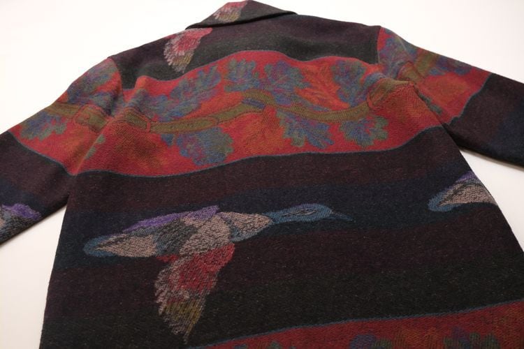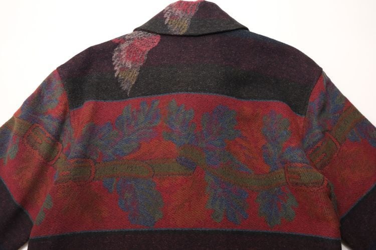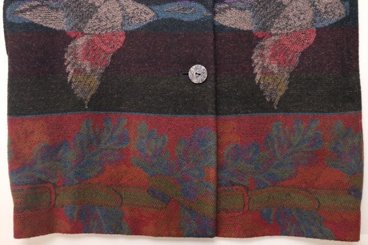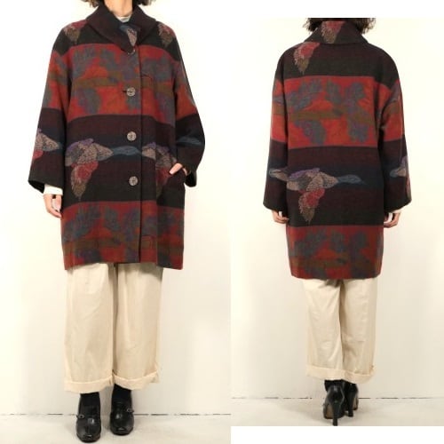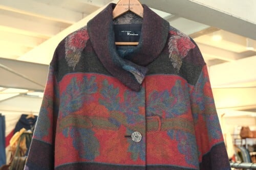 2000年代タペストリー調のロールカラーコート。あたたかな色調に溶け込むネイチャーモチーフのテキスタイルが素敵なウィンターコートです。オフショルダーにゆったりアーム、オーバーサイズのストレートシルエット。アシンメトリーな配置のボタンと立体感のある襟のディテールが特徴です。柔らかく軽量の上質なイタリア製の生地を用い、細部まで精巧に仕立てられた作りの良さも魅力となっています。コンディションは良くとくに目立ったダメージは見られません。ルーズにスタイリングできるカジュアルなデザインと上質な作りをともにご堪能いただけ、人と違ったものをお探しの方にもお勧めの逸品です。