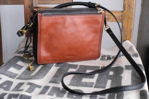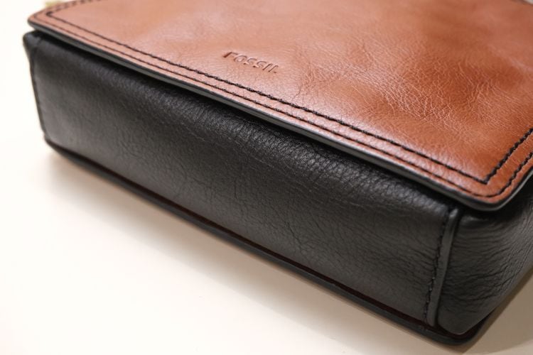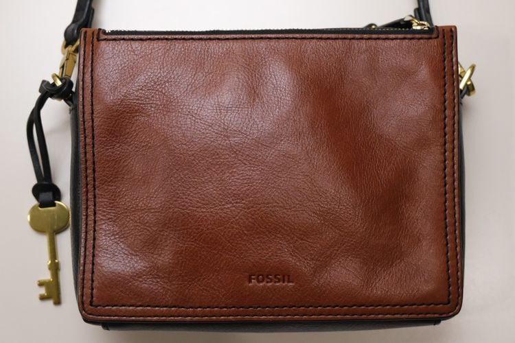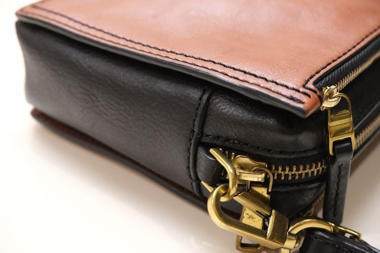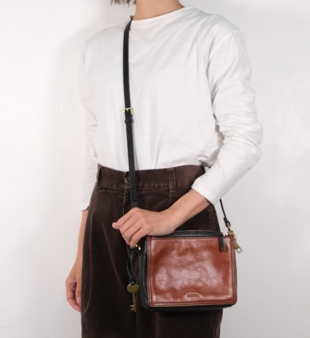 1984年"Kosta Kartsotis"によって創業された"FOSSIL"『フォッシル』より、ツートーンカラーのボックス型ショルダーバッグ。ブラウン×ブラック2色のシボの美しいカウハイドレザーとゴールドカラーの金具の組み合わせが大人な印象のバッグです。コンパクトに見えながら、中央にはマチ付きでしっかりと容量のあるメインコンパートメントを配置し、前後には薄型のジップポケットを備えており、スマートフォンやパスケース、鍵などすぐ取り出したい小物の収納に最適な作り。アンティーク調の鍵のチャームが装飾として付属しています。あまり使用感のない綺麗なコンディションですが、あくまでUSED品とご理解の上ご検討ください。荷物が少なめの外出をスマートにしてくれる万能なつくりがたいへん良く、使い勝手の良さと上品な佇まいを兼ね備えた一品です。