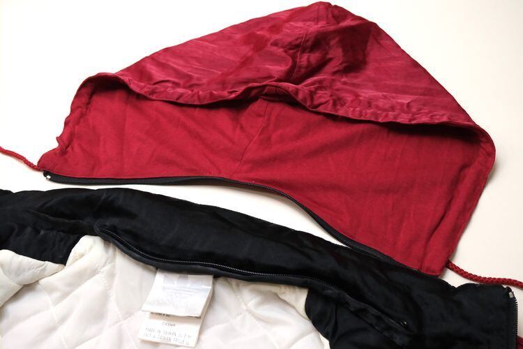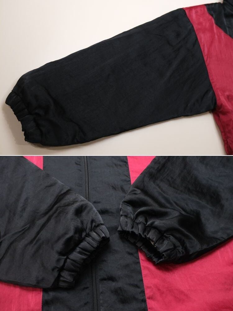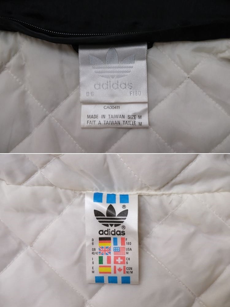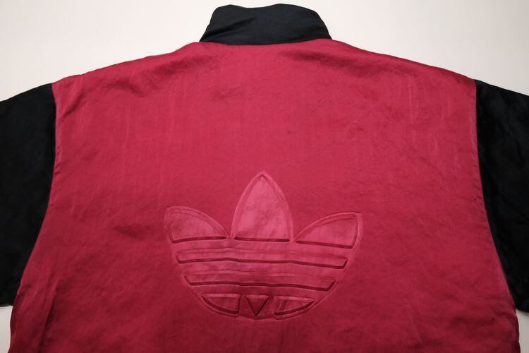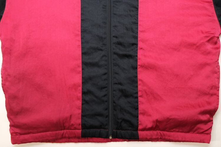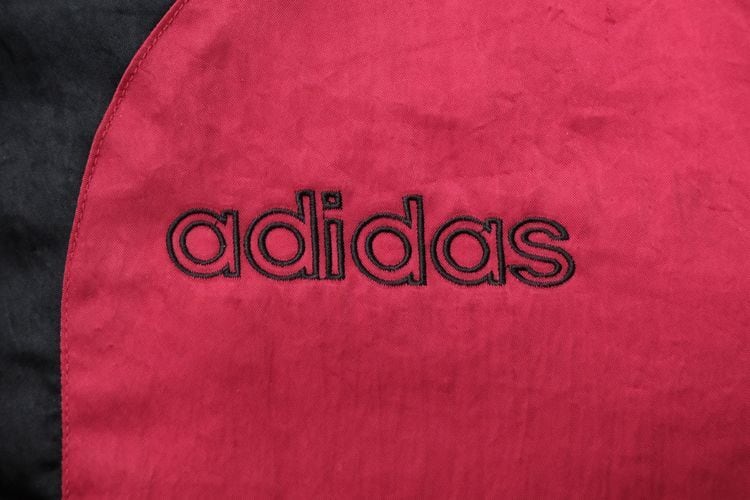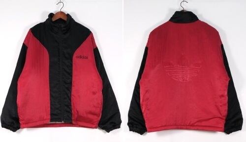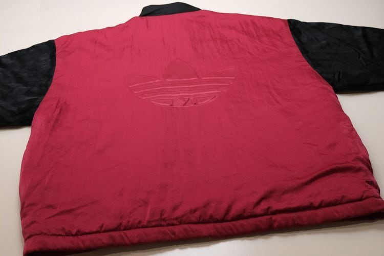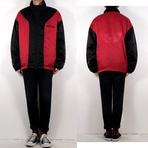 1924年ドイツのヘルツォーゲンアウラッハで"Dassler Brothers Shoe Factory"として設立され1949年に"adidas"となった世界を代表するスポーツ・ブランドから80年代後期頃のジャケット。シェルに薄手でシワ感のある100%ポリアミドを使用し、ブラックとワインレッドを大胆に切り替えたコントラストの配色が印象的なアイテムです。ざっくりとした着用に適したオフショルダーのボリュームあるシルエット、内側には袖口まで中綿(100%ポリエステル)入りのキルティングが張られた温かな着心地、取り外し可能なフード、左胸には"adidas"ロゴ刺繍、背面には大きく立体的に表現されたトレフォイル・ロゴが配された後ろ姿までしっかり主張のある仕上がりとなっています。着用の上で問題となるダメージ汚れはございませんが、後部の右アームホール付近に小さなダメージ、全体的に着用感のUSEDコンディションですのでご理解の上ご検討ください。デニムやチノなどのシンプルなボトムスと合わせるだけで個性的なコーディネートを演出でき、ざっくりとゆるい雰囲気を楽しんでいただける1本です。