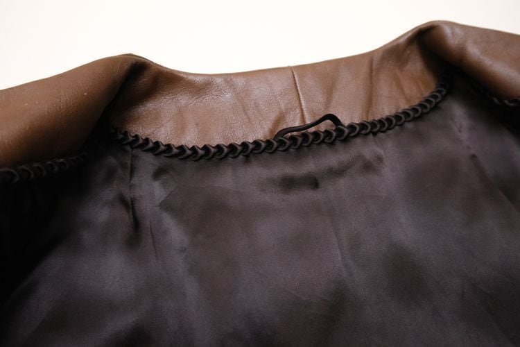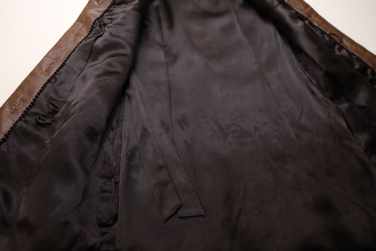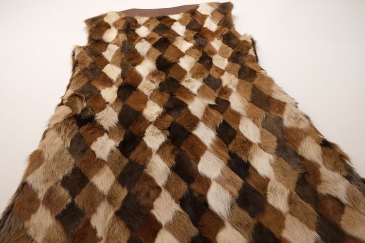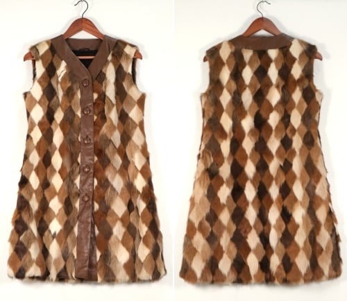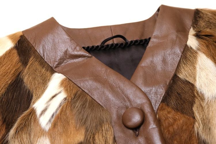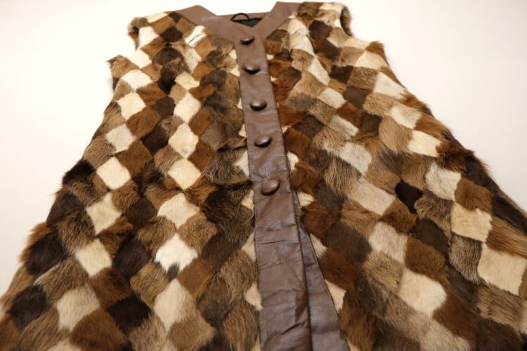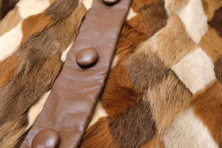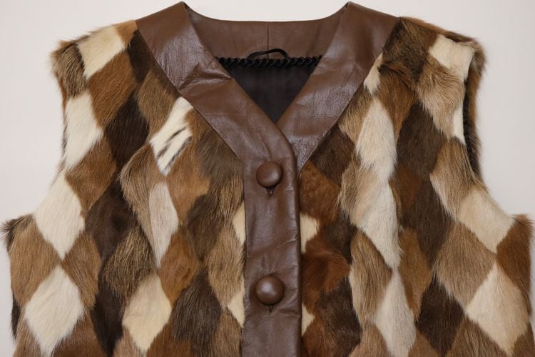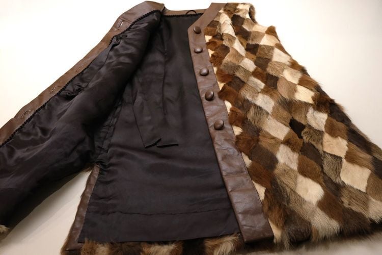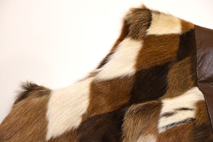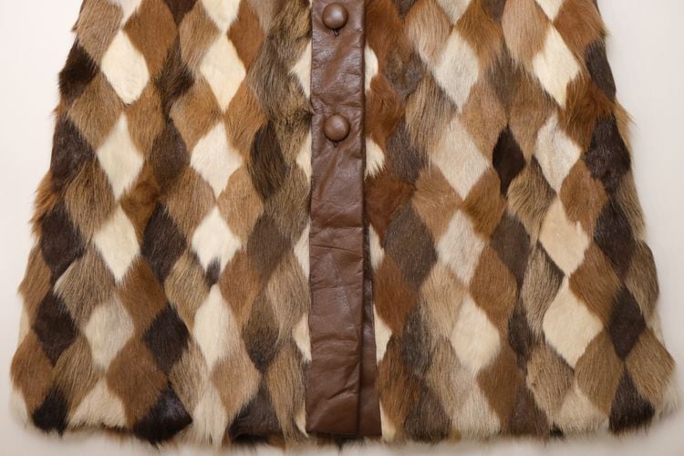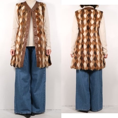 70年代頃のハラコパッチワークベスト。上質な素材を用い細部まで隙のない作りの良さが際立つ、フォークロアスタイルのロングベストです。シェイプされたウエストラインから裾にかけて優雅に広がるドレス型のシルエット、左右外側と左前立て内側にポケット付き。おそらく当時の職人の手による一点ものと思われ、毛並みの流れや模様の出方が様々な複数の牛革パネルを規則的に組み合わせたパッチワークが圧巻のデザイン。厚手サテン生地を使用した総裏地と前立てを縁取る装飾の作りも見事です。コンディションは良く、とくに目立ったダメージは見られません。年々希少価値が高まっているリアルファーとレザーのアイテム、中でも別格の存在感を放つ逸品ですので、衣装や写真撮影用などにもお勧めのアイテムです。