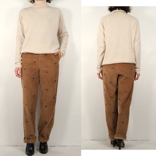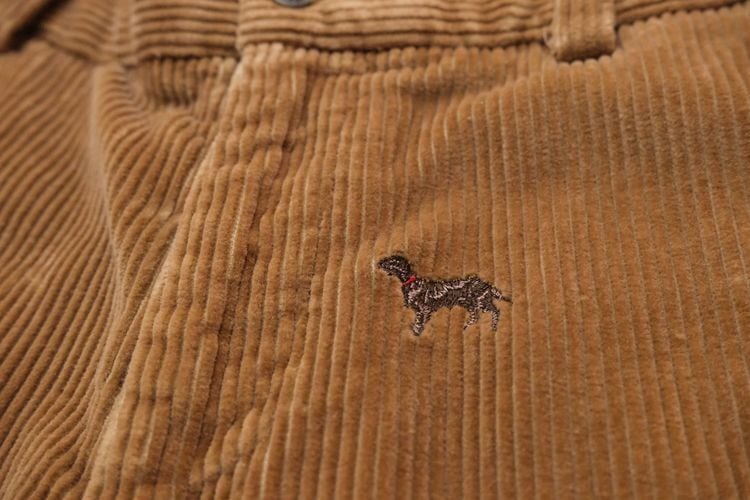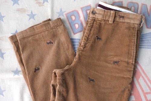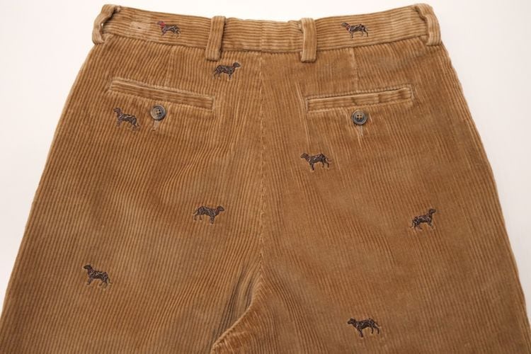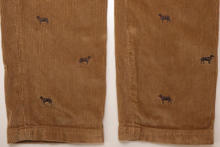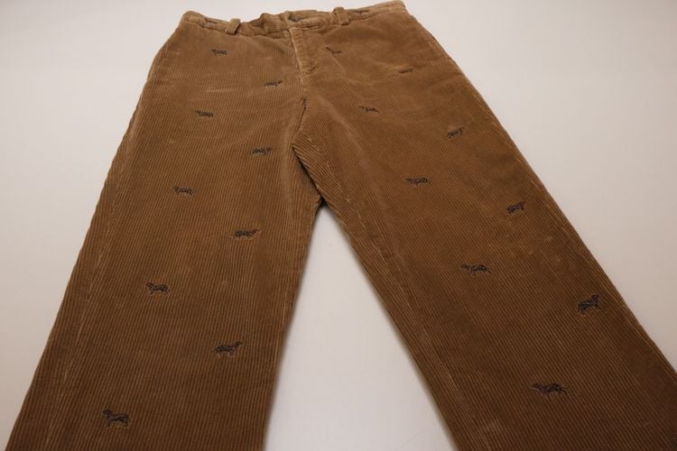 1818年ニューヨークに誕生したアメリカで最も歴史のある衣料品店"Brooks Brothers"『ブルックス・ブラザーズ』より、ボーイズサイズの刺繍入りコーデュロイパンツ。赤い首輪をつけたイヌの刺繍が散りばめられた、愛嬌のあるデザインが目を引く一品です。やや股上が浅めのミドルライズ、ノータックのストレートシルエット。100%コットンの太畝コーデュロイ生地は厚みがあり温かな着心地で、きめ細かく滑らかな高品質の素材に流石のブランドを感じます。コンディションは良く、とくに目立ったダメージは見られません。クラシックなトラディショナルデザインは流行り廃りなく、永くご愛用いただけると思います。