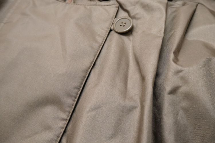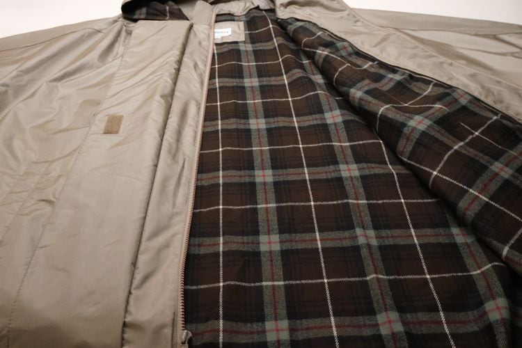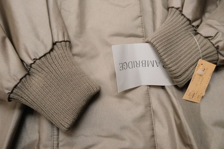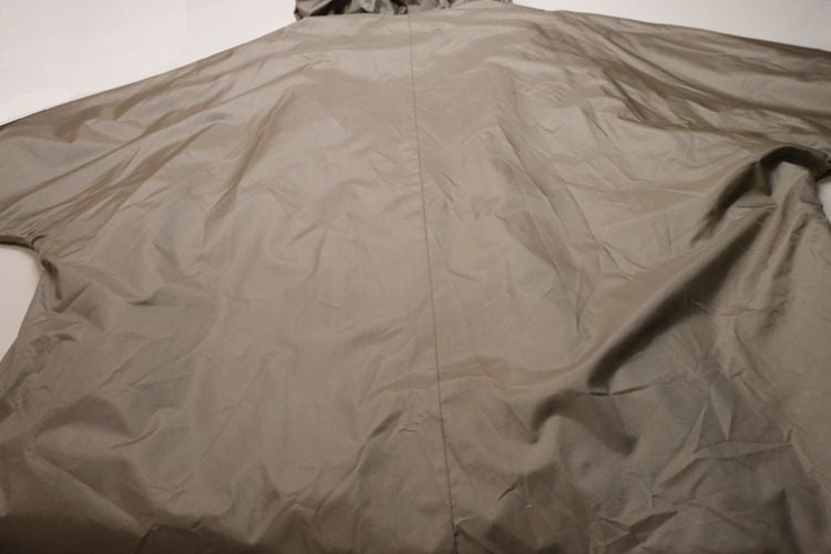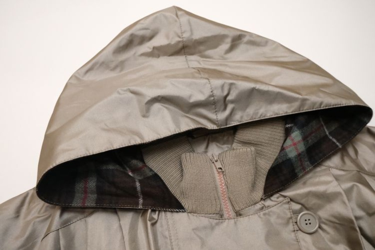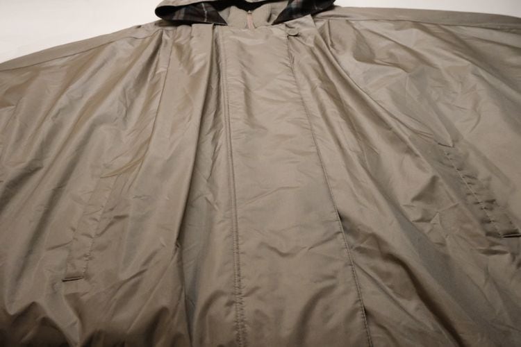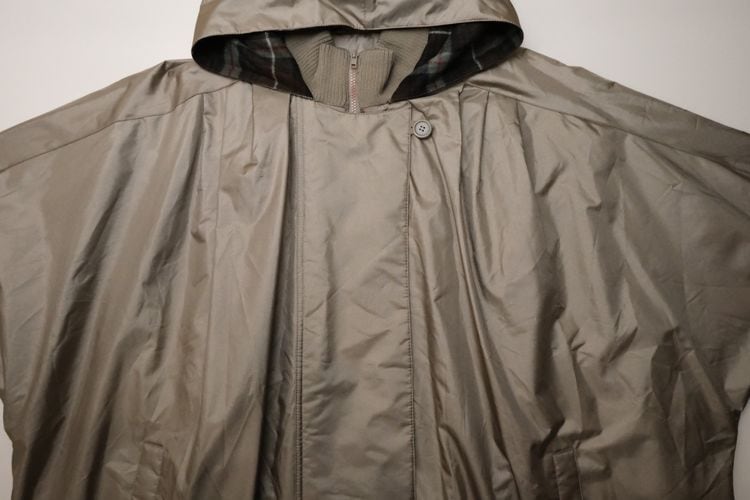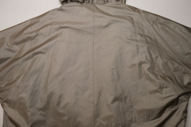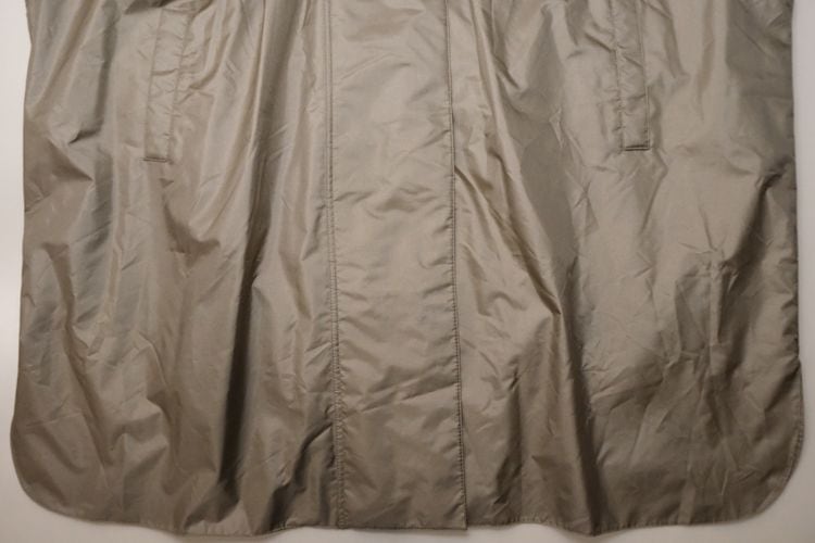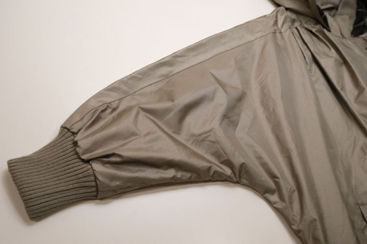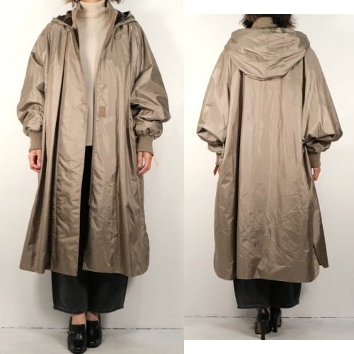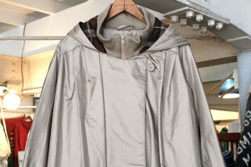 80年代デッドストックのフランネルライナー付きドルマンスリーブコート。袖口から裾が曲線を描くドルマンスリーブのシルエットが独特な表情の、モードな味わいのコートです。フロントヨークにギャザー入り、裾のサイドは丸いカットとスリットが特徴のディテール。張りのある厚手生地はラバー加工の撥水性があり、フロントジップ+ネックと袖口はリブ仕様で風を防ぎ、ボディにはジッパーで着脱可能なライナー付きと、デザイン性だけでなく機能性にも優れています。ゆったりとしたシルエットのためボリュームニットやジャケットの上からも余裕を持って着用できます。当時のペーパータグが残ったままの未使用で、たいへん綺麗なコンディションです。実用性が高くスリーシーズン着用いただけ、さりげなく小技の効いたデザインと鈍いメタリックカラーが着こなしをこなれた雰囲気に仕上げてくれる、お勧めの一品です。