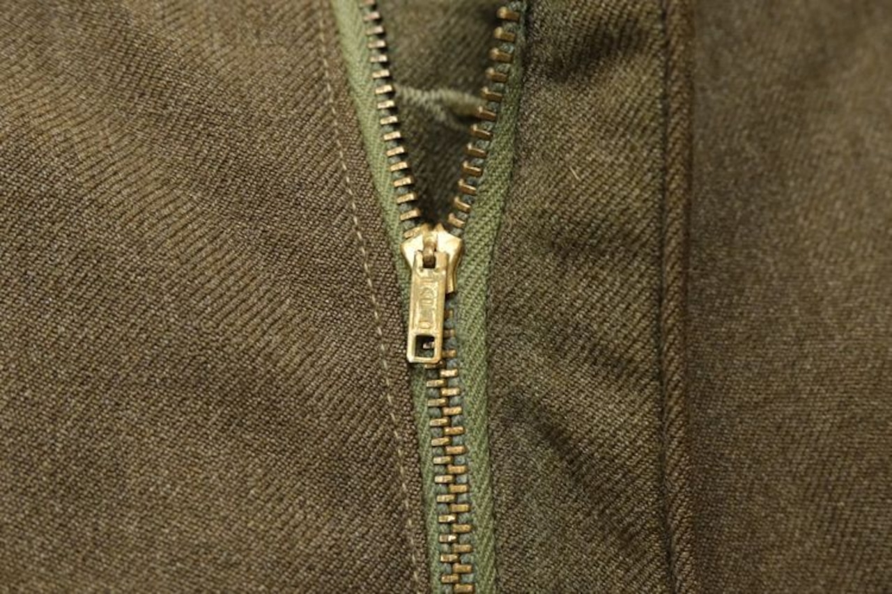 50年代 U.S.ミリタリーのウールトラウザーズ。1957年製アメリカ軍のユニフォームとして使用されていたアイテムで、元々はメンズのアイテムですがサイズ小さめのため女性にお勧めの一本です。オリーブブラウンの深い色味に、当時らしい太めで素直なストレートシルエット。フロントはジッパーフライ、背面にはフラップ付きポケットを配置、内側にサスペンダーボタンが付属しています。しっかりと目の詰まったウール生地ながら、穿いたときの落ち感は意外と軽く、無骨さと品の良さを併せ持った一本です。コンディションとして多少の着用感があり、内側の生地に変色や裾口に擦れなど見られますのでUSED品とご理解の上ご検討ください。古いものならではの貫禄のある佇まいが、いつもの服に合わせるだけでもスタイリングに深みを与えてくれます。