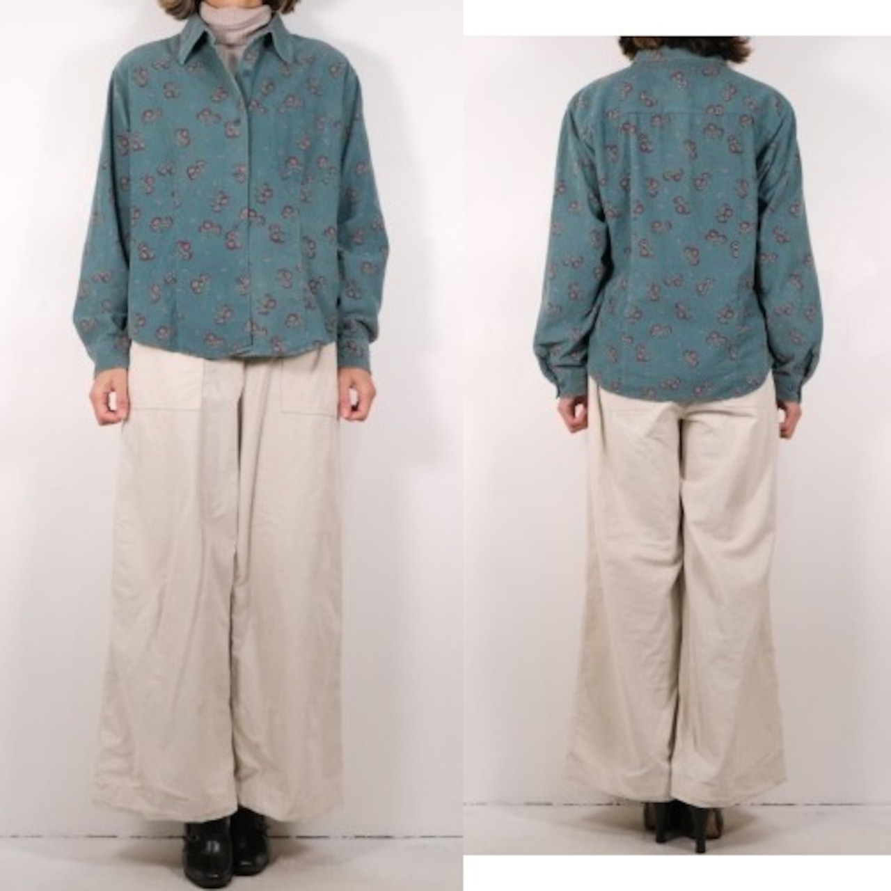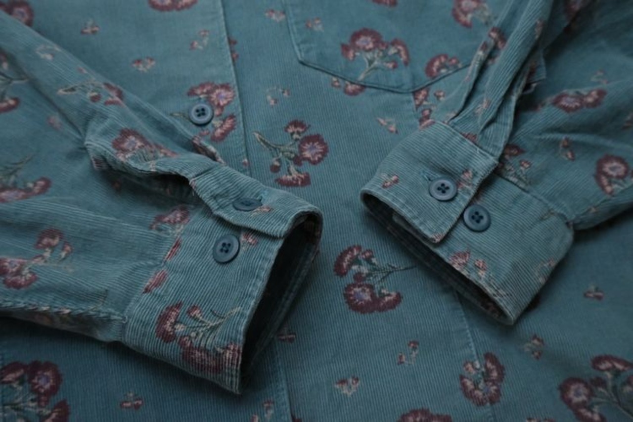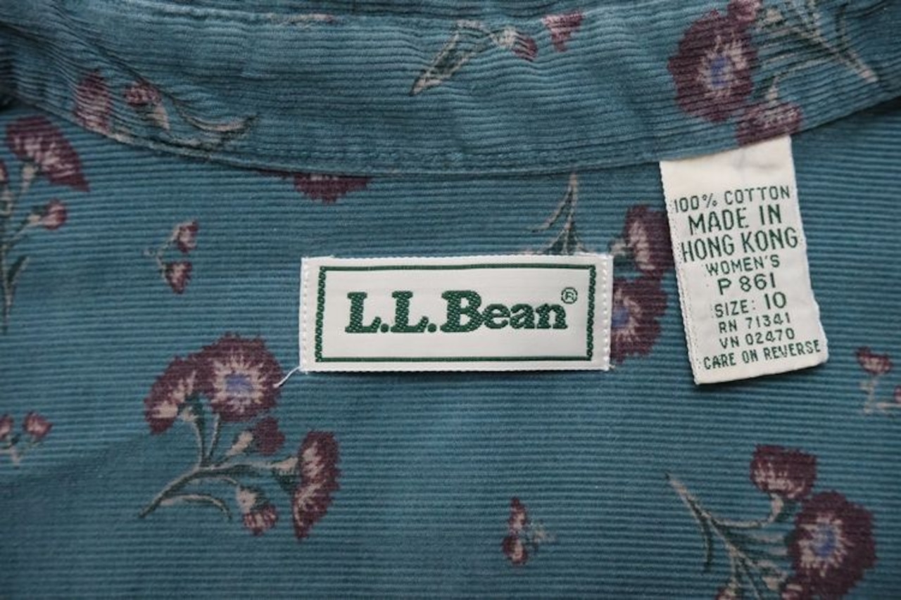 1912年"Leon Leonwood Bean"によりメイン州フリーポートで創業された"L.L.Bean"より、 90年代花柄のコーデュロイシャツ。淡いターコイズグリーンの色みに溶け込む花模様がクラシカルな一品です。身幅やアームはゆったり、ウエストがややシェイプされたレディースならではのシルエット。100%コットン素材の細畝コーデュロイ生地は柔らかな風合いと温かく肌触りの良い着心地が魅力です。コンディションとして多少の着用感があり、色褪せや袖口の生地に擦れなど見られますのでUSED品とご確認の上ご検討ください。かさ張らないためインナーとしての着こなしにも向き、ロングシーズ活躍してくれる一品です。