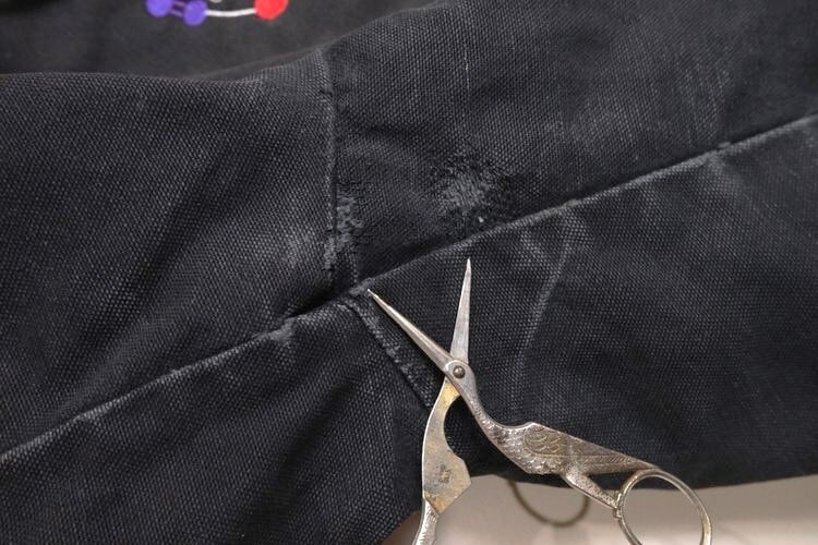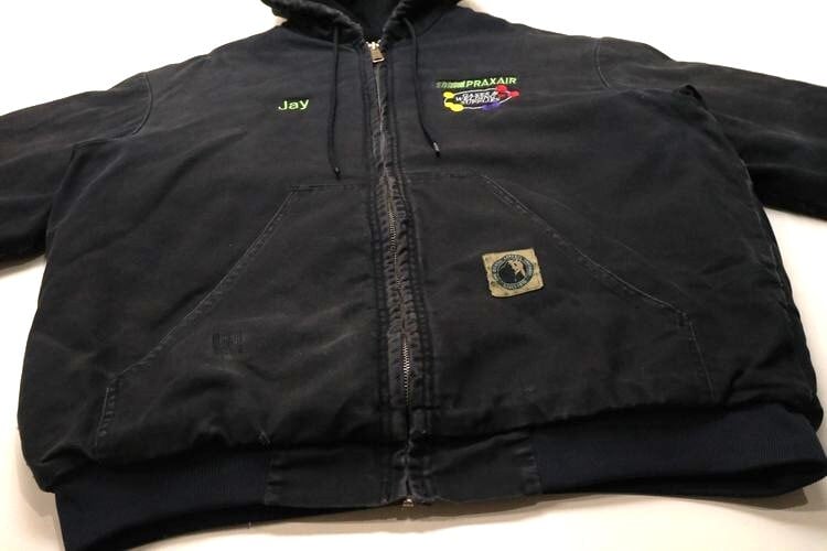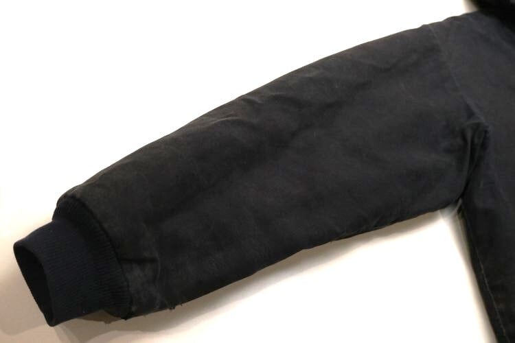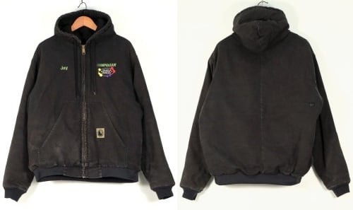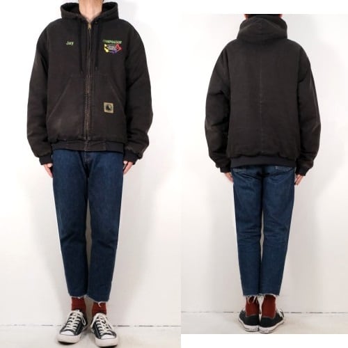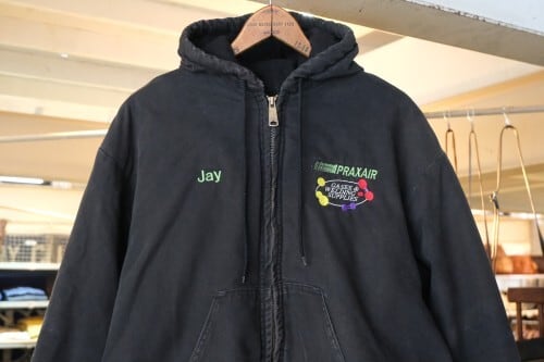 1915年にインディアナ州オシアンで設立されたワークウェア・ブランド"BERNE APPAREL"から90年代頃と思われるアクティブ・ジャケット。シェルに厚手でしっかりとした100%コットン・ダック地(表記読み取り不可)を使用し、ライニングに袖口までキルティング加工の施されたポリエステル・フィリングの入る温かな着心地のアイテムです。ざっくりとした着用に適したボリュームあるシルエット、着用と経年によりフェードしたブラックの色味による1点ものらしさ、そして左胸にカラフルな刺繍で施された世界的な工業用ガス企業"PRAXAIR"ロゴと右胸に"Jay"のネームが入る、実際の現場で使われていたことが伝わるワークウェアならではのリアルなディテールも魅力となっています。着用の上で問題となる大きなダメージや汚れはございませんが、右ポケット、後部の右脇付近、左脇下、両袖などに多数のダメージ補修が点在する、かなり着用感の強いUSED品ですので汚れやダメージを含めたこの1点ものらしさを好まれる方におすすめ致します。シンプルなトップ×ボトムスにさらっと羽織るだけでワークらしい無骨さと貫禄を演出でき、こちらのアイテムは従業員に配られた販売用ではない1本ですので気になる方は是非ご検討ください。