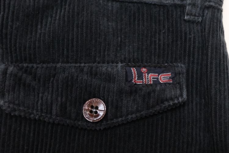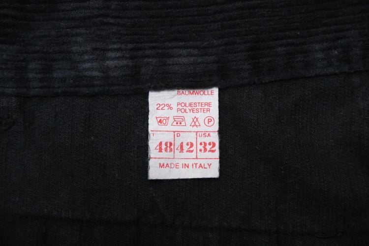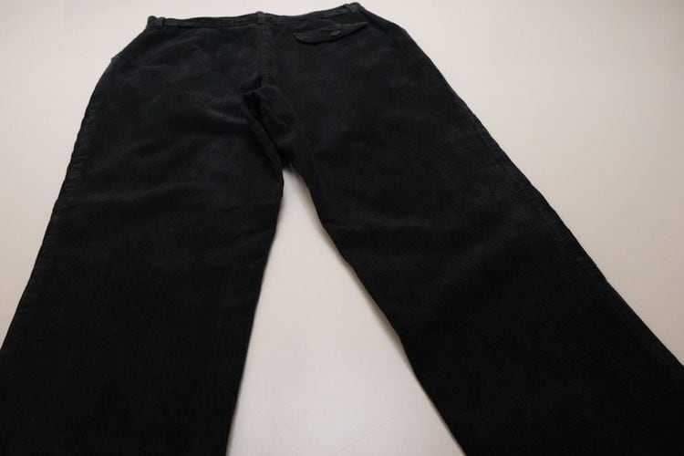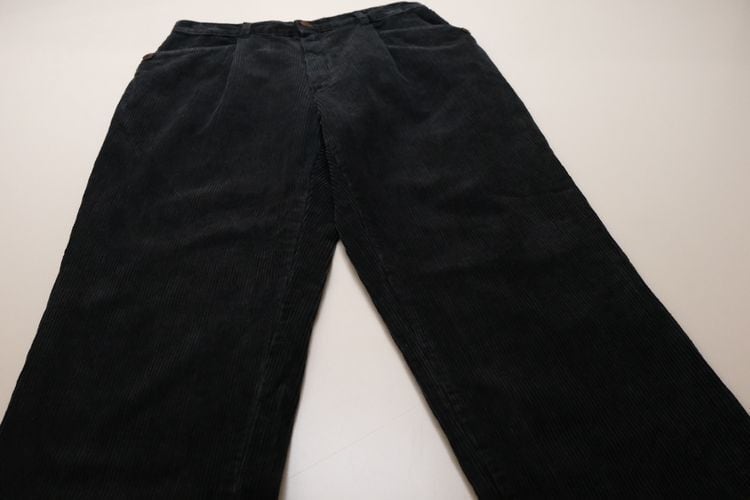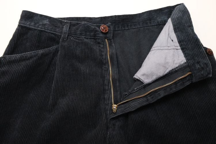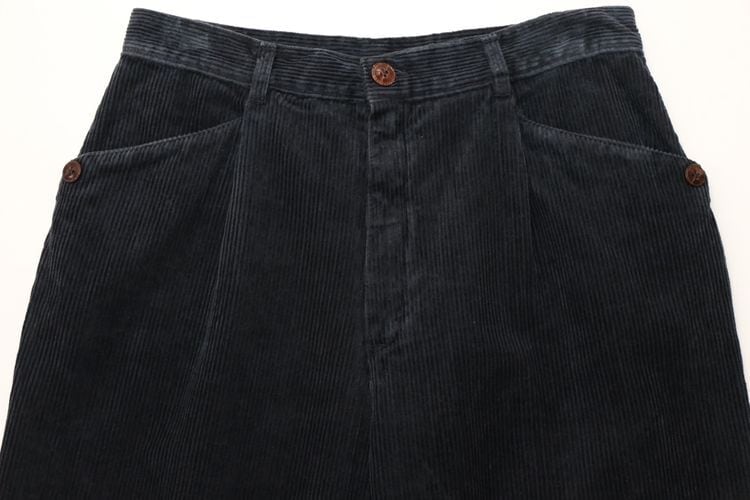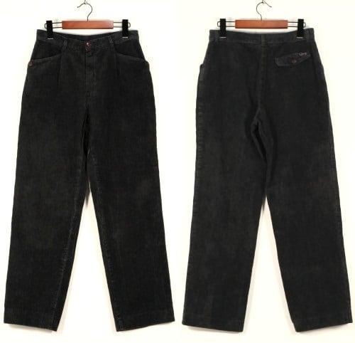 90年代イタリア製ブラックカラーのコーデュロイパンツ。ベーシックに使えるスラックスタイプのパンツです。股上が深めのミドルライズ、タック入りでゆったりとした腰まわりから僅かにテーパードされたシルエット、レザー調のボタンがあしらわれたフロントポケットがポイントになったデザイン。中畝のコーデュロイ素材は古いものならではの風合いと落ち込んだ色みが雰囲気良く、あたたかな着心地でお楽しみいただけます。コンディションとして多少の着用感があり、左後ろ裾にぼんやりとした変色が見られますのでUSED品とご理解の上ご検討ください。流行り廃りのないスタイルで永くご愛用いただけます。