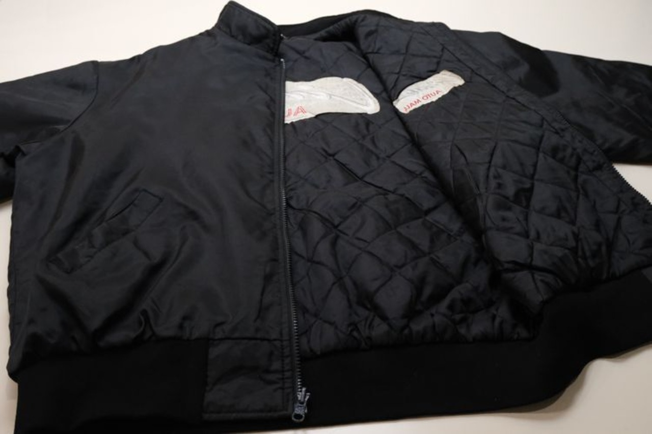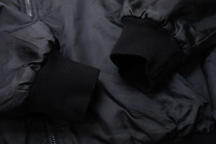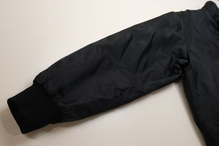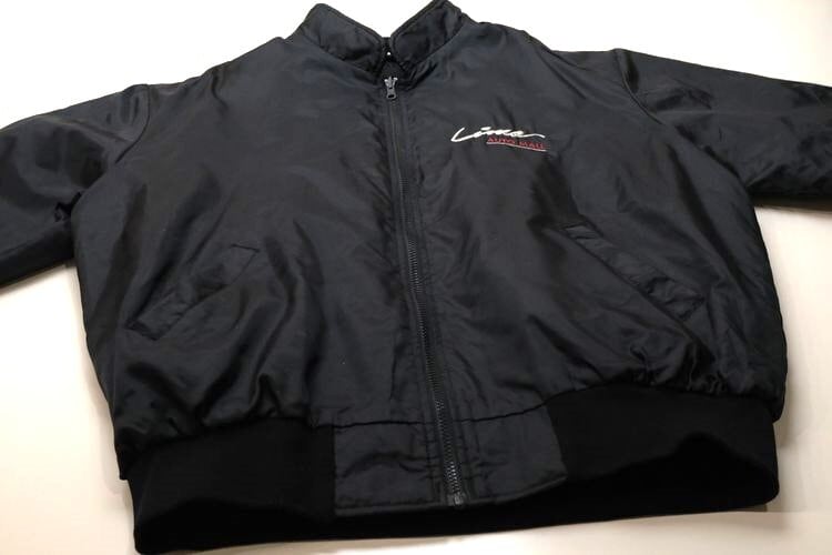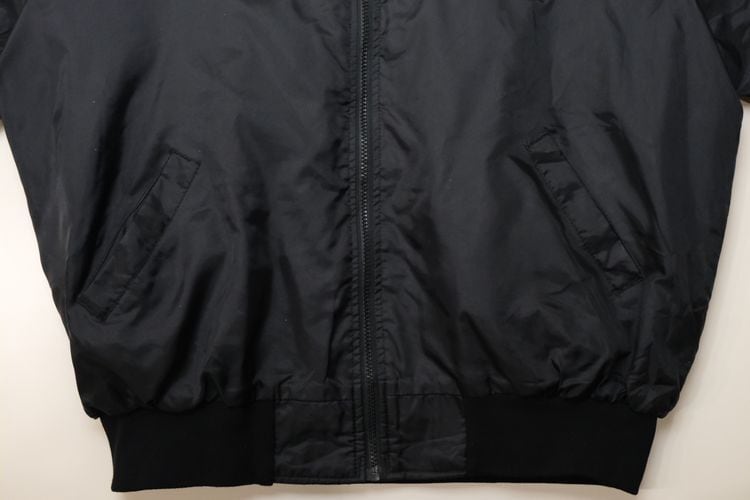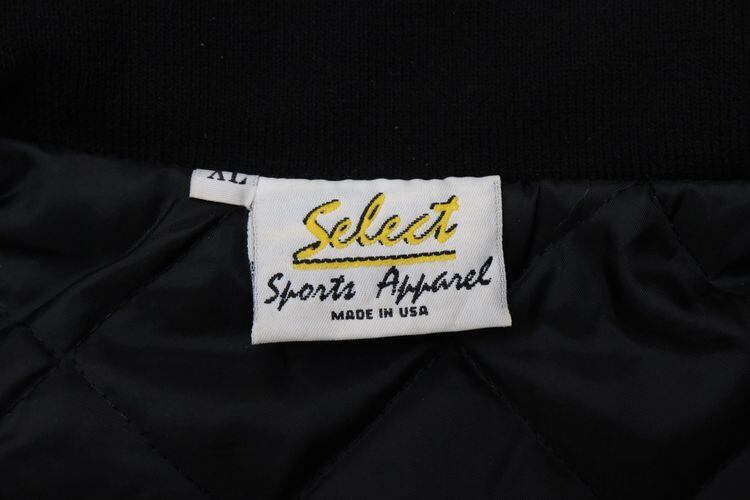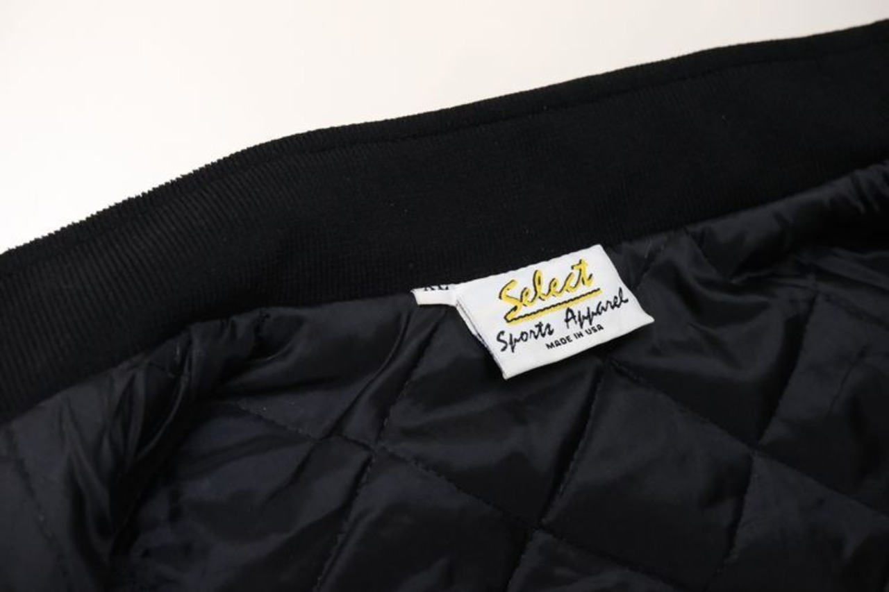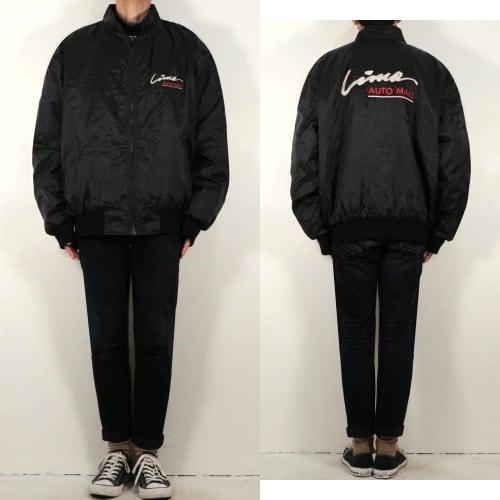 アメリカ国内の企業ユニフォームやスポーツ・チームのウェアを製造していた"Select Sports Apparel"から80年代頃と思われるアメリカ製のジャケット。薄手でぱりっと張りのある100%ナイロン(表記なし)を使用し、程よい光沢のある単色ブラックで仕上げられたシンプルでスマートな雰囲気のアイテムです。ざっくりとした着用に適したボリュームあるシルエット、ジップアップ・フロント、スタンド・カラー、ハンドウォーマー・ポケット、内側は袖口までキルティング仕様でフィリングにたっぷりと中綿(ポリエステル)を詰めた優れた保温性、そして、左胸と背面にオハイオ州ライマに所在するカー・ディーラー"Lima AUTO MALL"の刺繍が個性的な仕上がりとなっています。着用の上で問題となるダメージ汚れはございませんが、全体的に着用感のあるUSEDコンディションですのでご理解の上ご検討ください。寒い季節にさらっと羽織れる実用性の高い防寒着としたいへん重宝するおすすめで、こちらのアイテムは従業員に配られたと思われる販売用ではない1本ですので気になる方は是非ご検討ください。