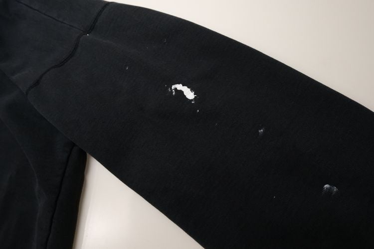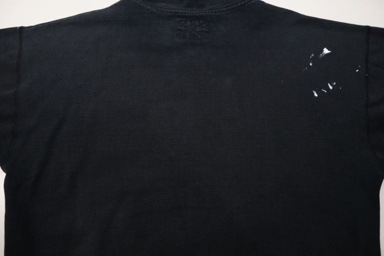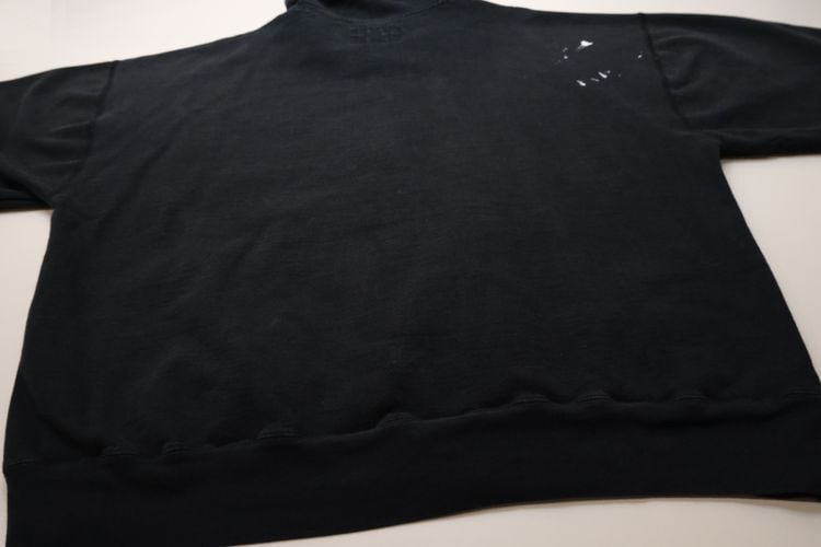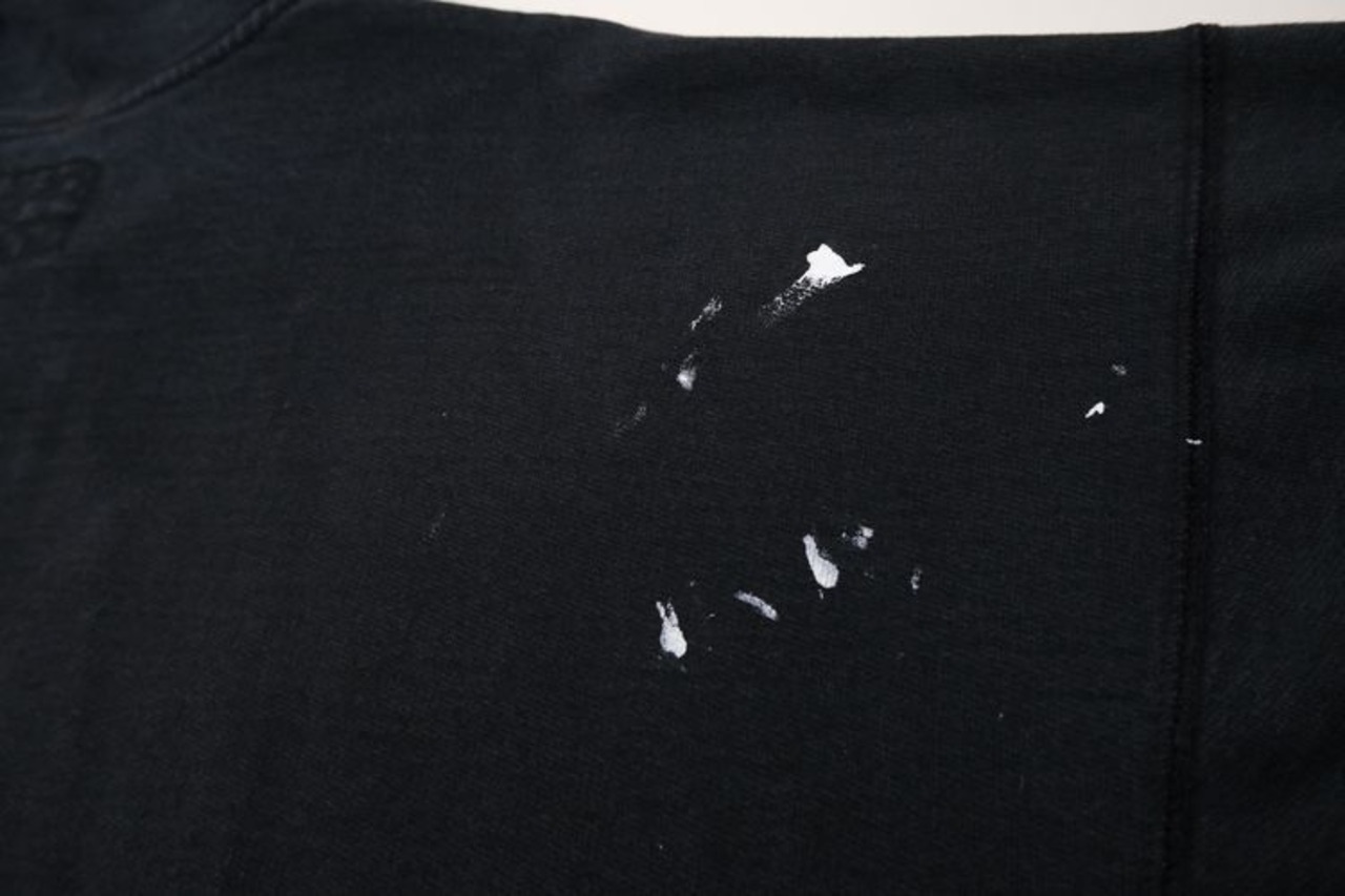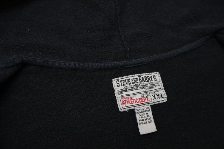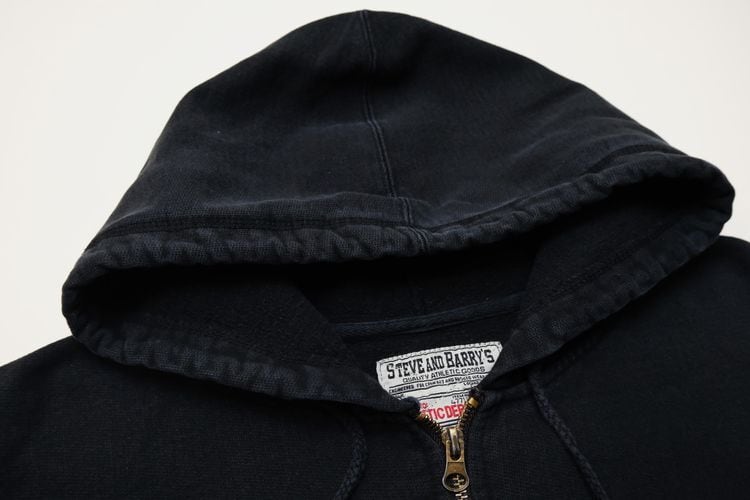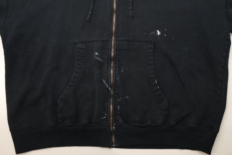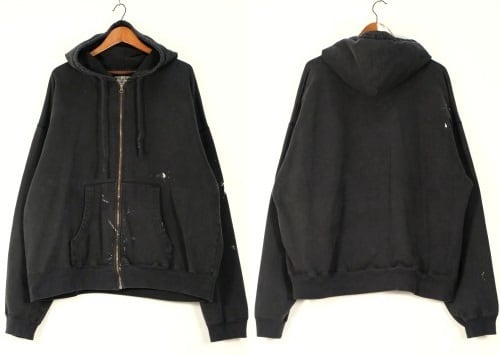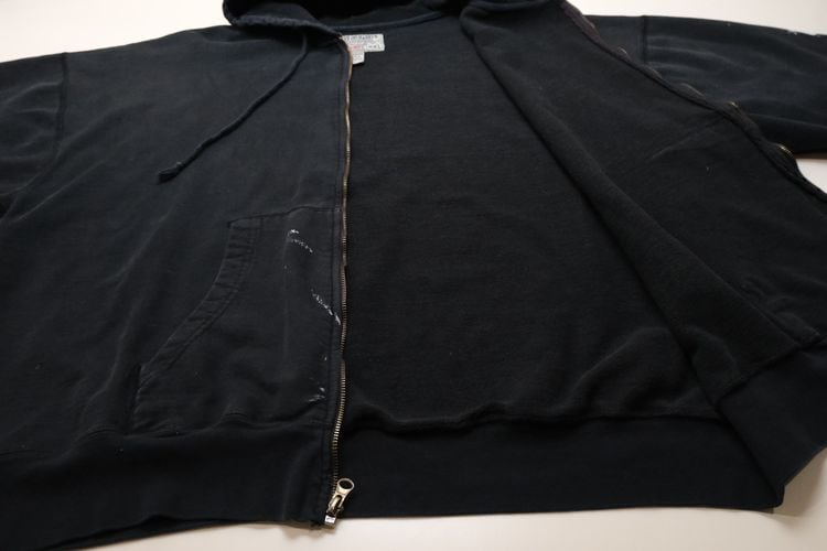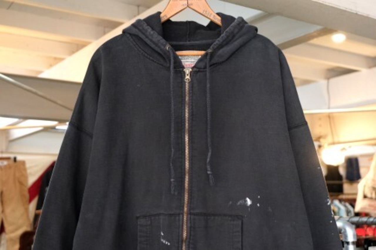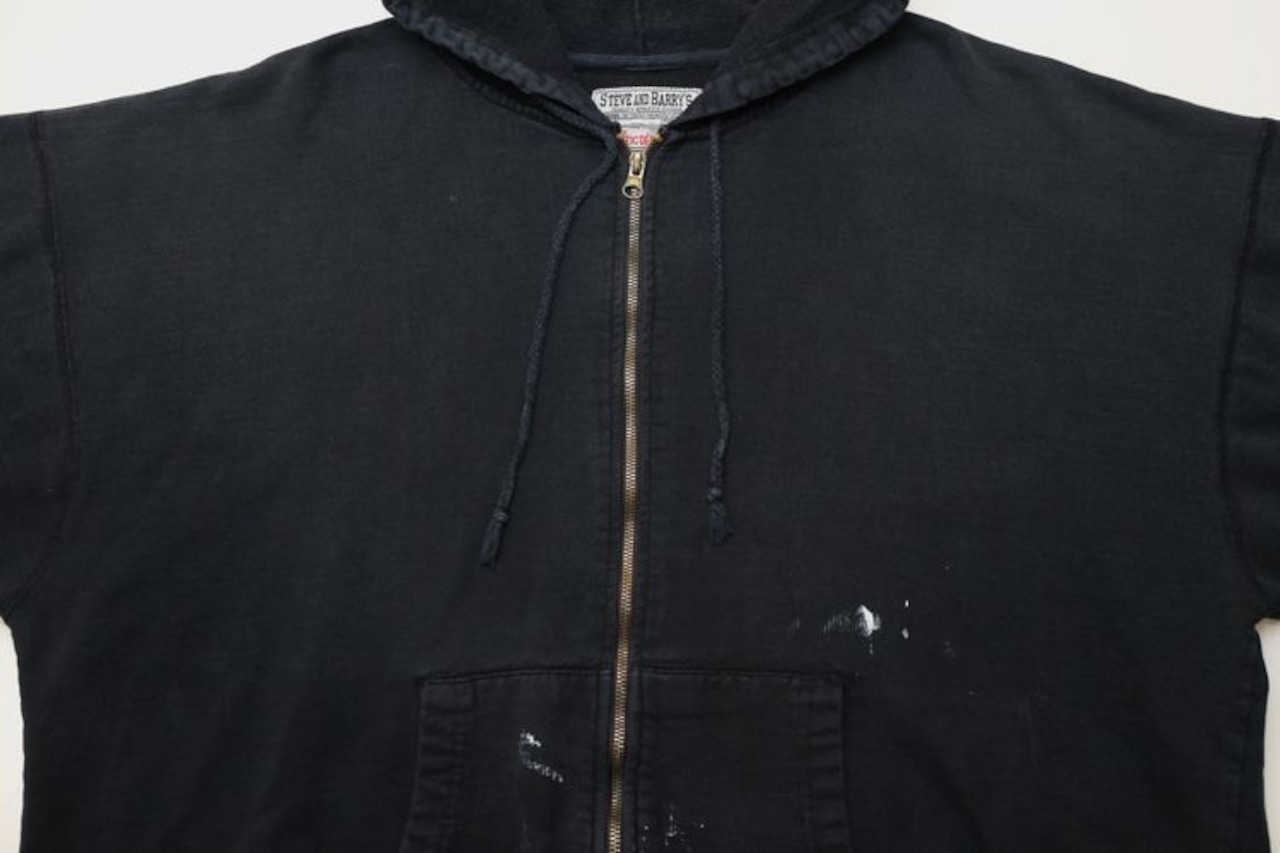 1985年にニューヨーク州ポートワシントンで創業されたカレッジ・ファッション・ブランド"STEVE AND BARRY'S"から2000年代初期頃と思われるパーカー。やや厚手でしっかりと張りのあるコットン×ポリエステル(80/20)混紡素材を使用し、着用と経年によってフェードしたチャコールブラックの色味と凹凸のある素材の表情に魅力のあるアイテムです。リラックスした着用に適したアームホールが広くオフ・ショルダーのボリュームあるシルエット、ジップアップ・フロント、やや縦長のスラッシュ・ポケット、そして所々に付着した白いペンキ汚れが個性的な仕上がりとなっています。着用の上で問題となるダメージや汚れはございませんが、袖口にスレ、全体的に毛羽立ち、各所にペンキ汚れのあるUSEDコンディションですので、この1点ものらしい風合いの良さを好まれる方におすすめ致します。また、現時点ではジップ・スライダーの開閉に問題はありませんが、根元部分にダメージが見られますのであらかじめご了承ください。ざっくりとリラックスした着用に適した大きめのシルエットとシンプルなカラーは幅広いボトムスと合わせて楽しんでいただけ、オーバーサイズを活かしたルーズなスタイリングにもおすすめできる1本です。