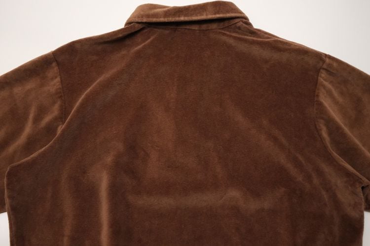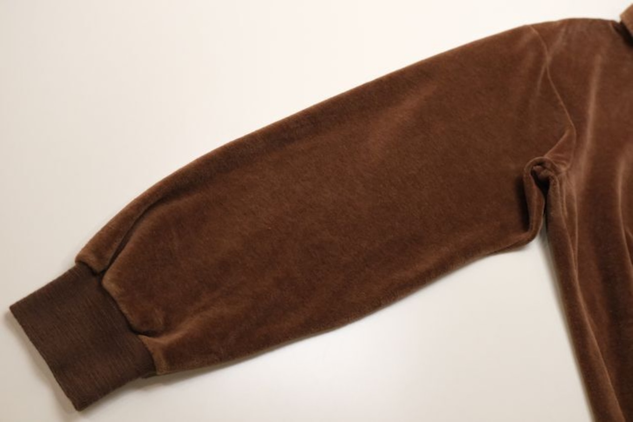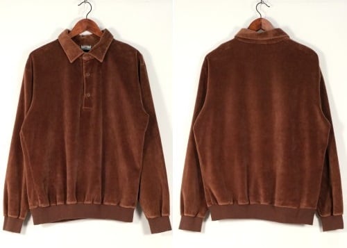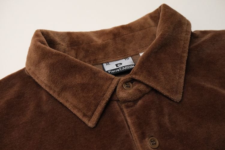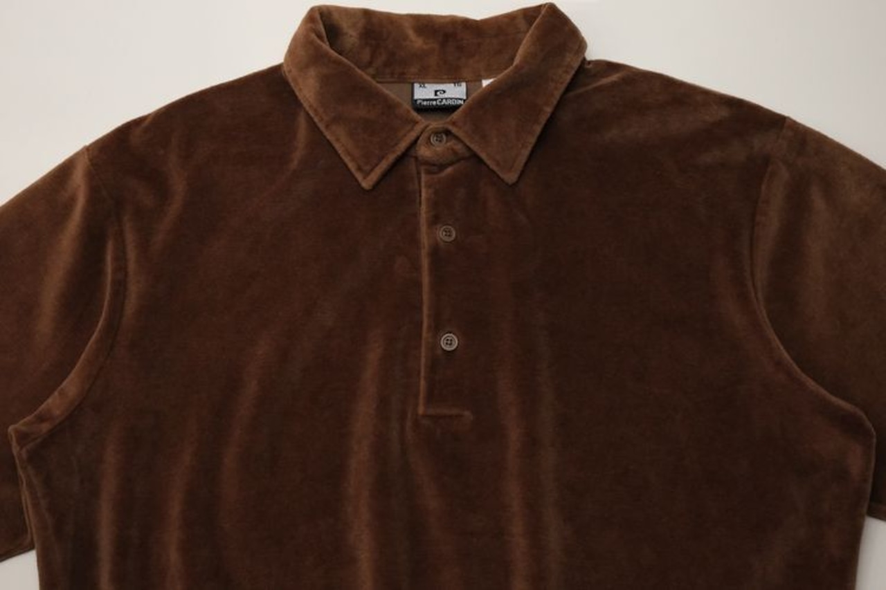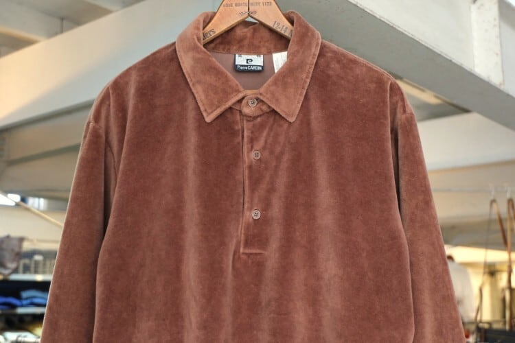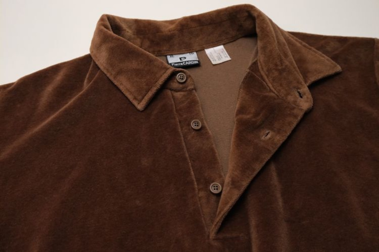 1950年にパリで自身の名を冠し設立されたイタリア・ヴェネツィア出身のファッション・デザイナー"Pierre Cardin"『ピエール・カルダン』から80年代のカナダ製シャツ。程よい厚さできめの細かなベロア(コットン×ポリエステル混紡素材)を使用し、上質な艶と光の角度で深い陰影を描くブラウンの温かな色味に高級感がありながらもどこか懐かしいレトロな雰囲気を感じるアイテムです。身幅にゆとりを持たせたボリュームあるシルエット、小ぶりなのカラー、3つボタンのプルオーバー、裾口と袖口のリブ切り替え、ベロア特有の重みと柔らかさによる身体のラインに沿ったドレープ感も魅力となっています。着用の上で問題となるダメージや汚れはなく毛並みの潰れもございませんが、全体的に着用感のあるUSED品ですのでご理解の上ご検討ください。ウール・スラックスやタック・パンツと合わせれば品のあるモード寄りに、デニムやチノ・パンツと合わせれば素材の艶が際立つ抜け感のあるスタイルを演出でき、ジャケットやコートと合わせたレイヤードでは質感のコントラストを楽しめる1本です。