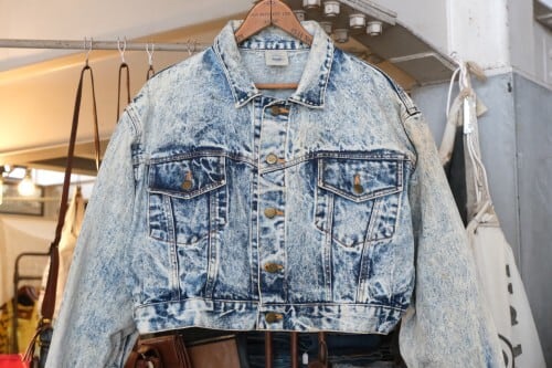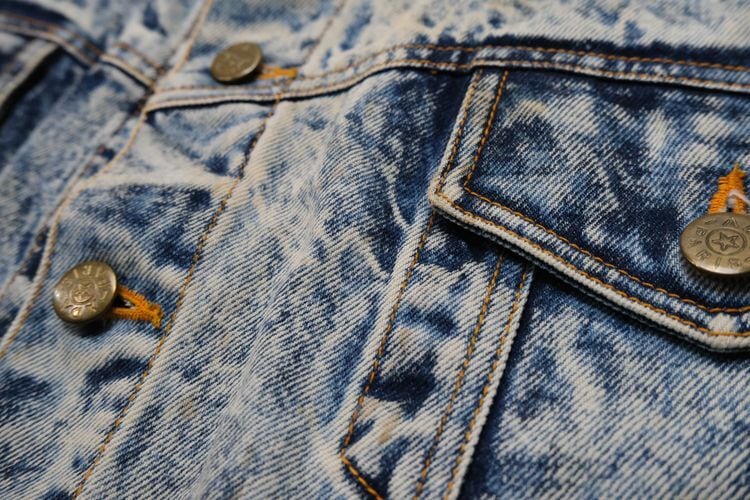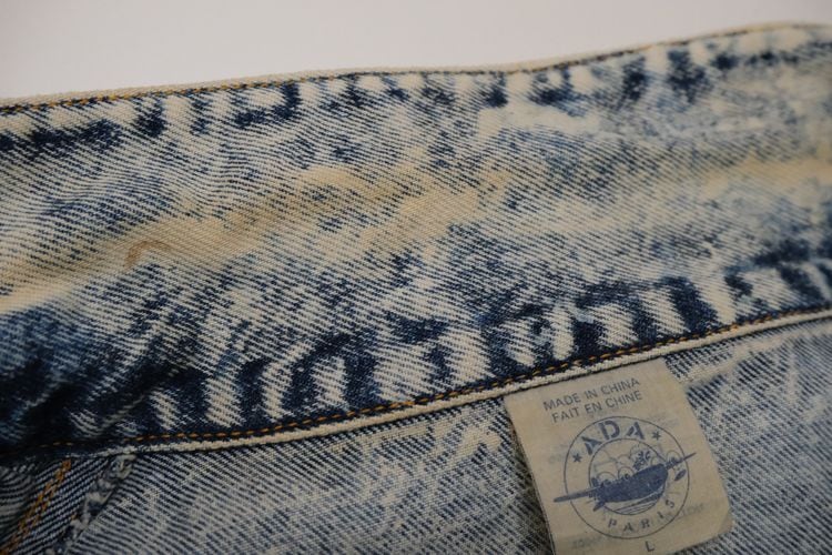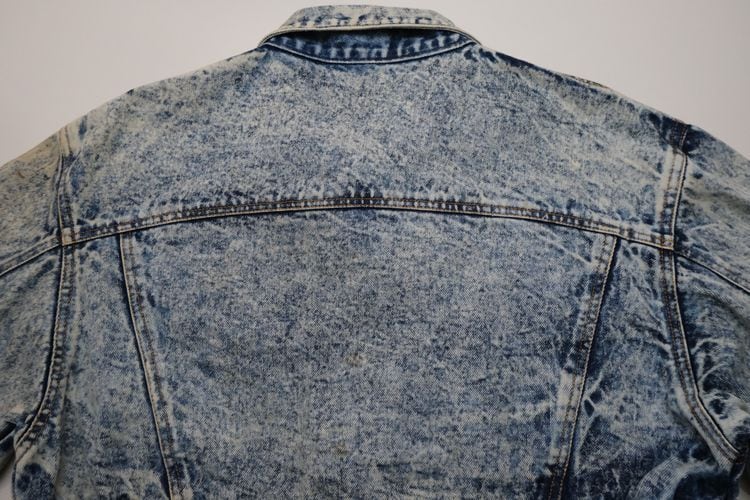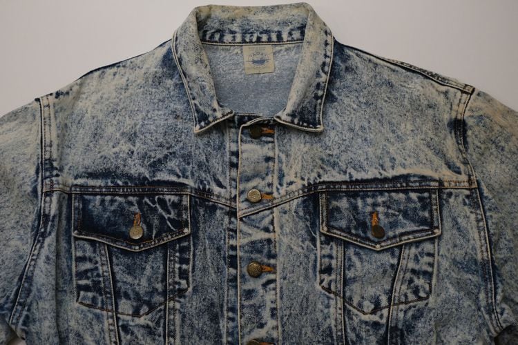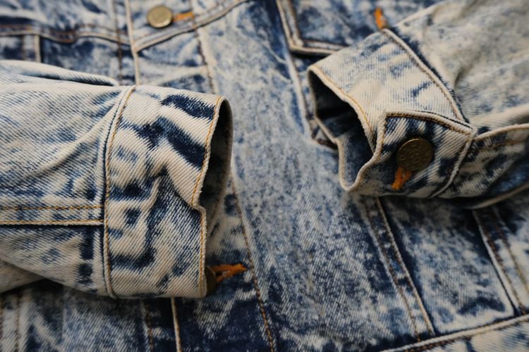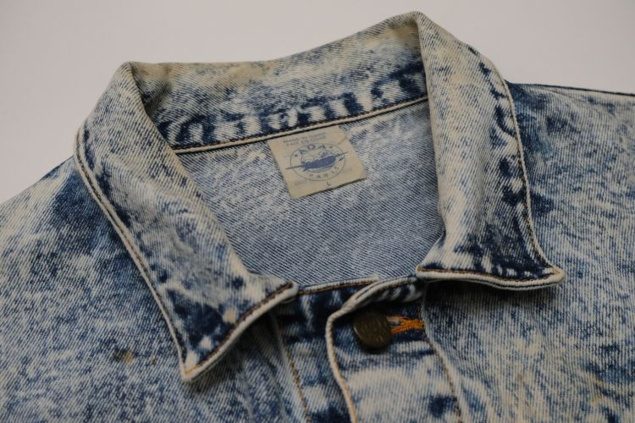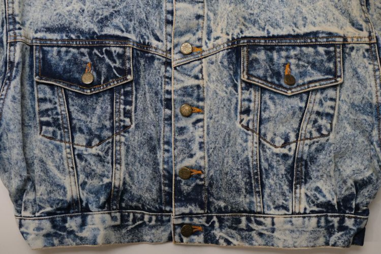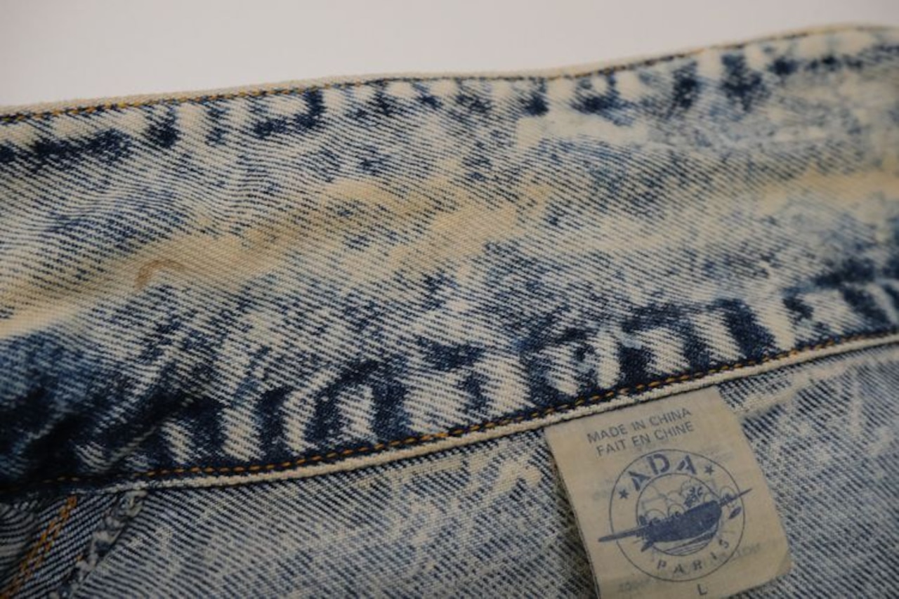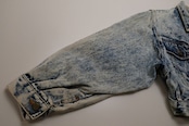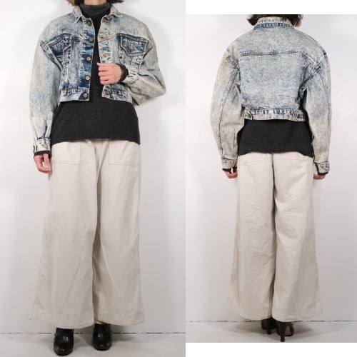 80年代アシッドウォッシュデニムのクロップドジャケット。コンパクトな着丈やボリュームたっぷりのバルーンスリーブが現代に新鮮に映る一品です。小振りなラペルに大きなポケット、ブランド刻印入りのボタンが特徴のデザイン、コントラストの強いウォッシュ加工のデニムの色みにも個性があふれます。コンディションとして多少の着用感があり、襟ぐりや肩などに変色、所々にシミなど見られますのでUSED品とご理解の上ご検討ください。使い込んだ加工デニムの味わいとしてお愉しみいただける方にお勧めいたします。オーバーサイズの着こなしもバランス良く、ざっくり羽織るだけで現代のものにはない存在感がスタイリングをランクアップしてくれるアイテムです。