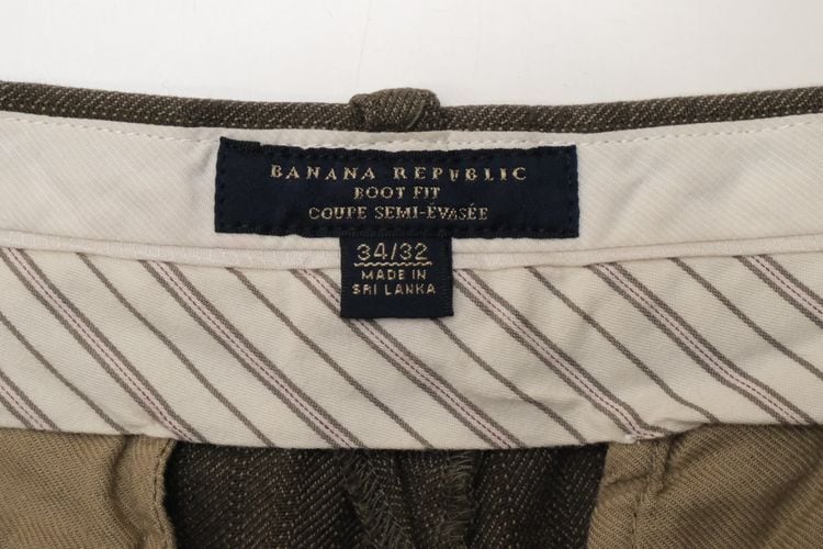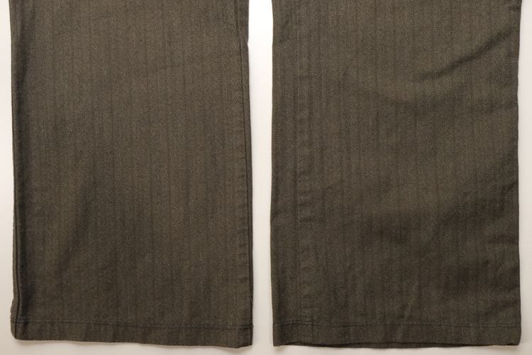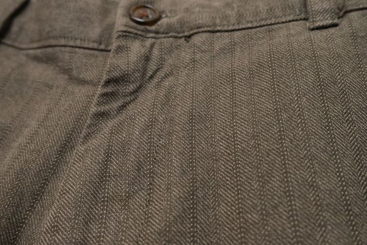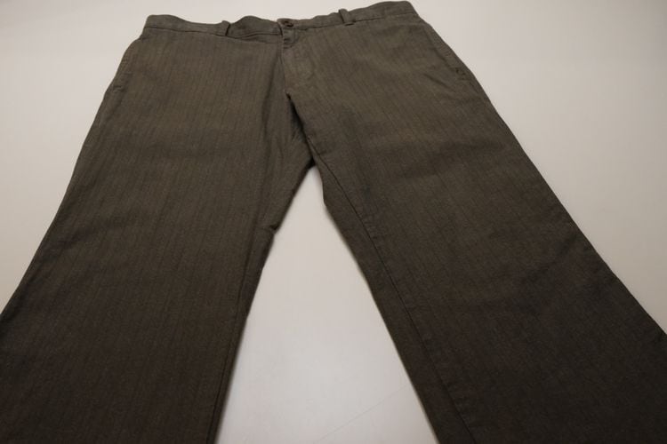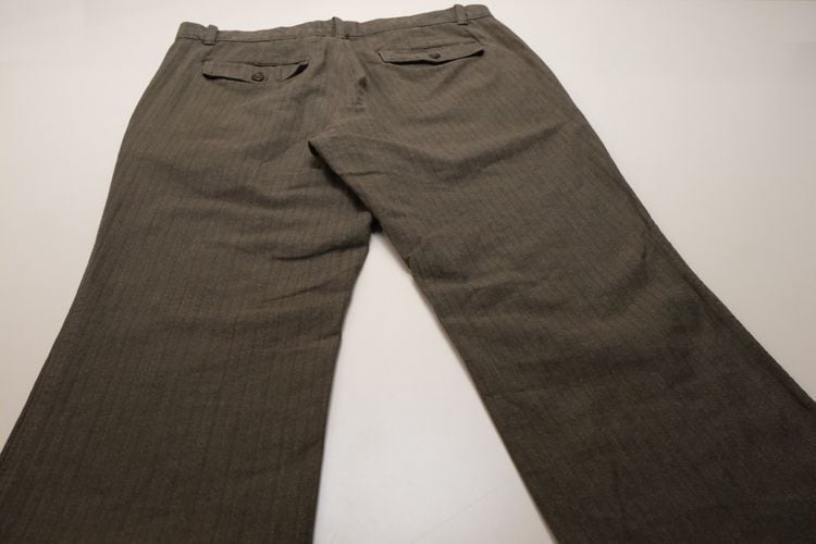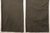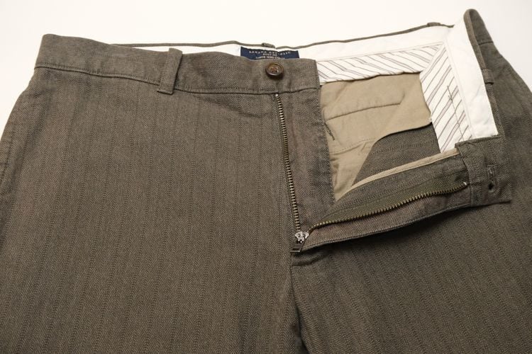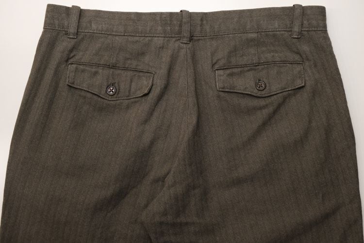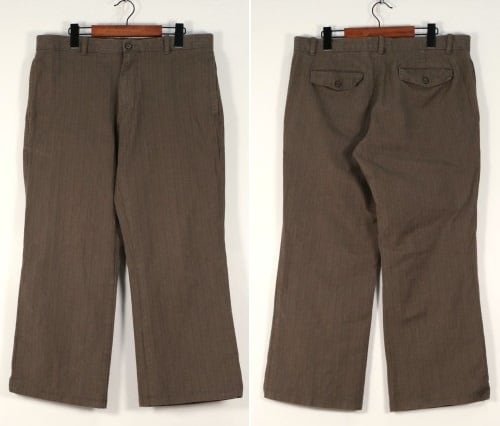1978年にカリフォルニア州ミルバレーで創業された"BANANA REPUBLIC"から2000年代(08/FALL)のパンツ。程よい厚さで控えめなヘリンボーン・ツイル×ピン・ストライプを組み合わた100%コットン素材を使用し、アッシュブラウンとグレーの混じり合うナチュラルな色味に大人な雰囲気を感じるアイテムです。やや浅めの股上にすっきりとした印象のノータック、太めのワタリから裾口にかけてストレートに落ちるワイドなシルエットが特徴となっています。着用の上で問題となるダメージや汚れはございませんが、全体的に着用感のあるUSEDコンディションですのでご理解の上ご検討ください。ゆったりとリラックスして履いていただける太いシルエットと落ち着いた色味で、ドレスとカジュアルの中間といったバランスの良いおすすめの1本です。