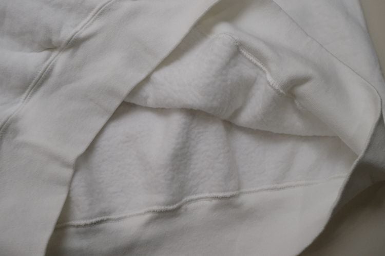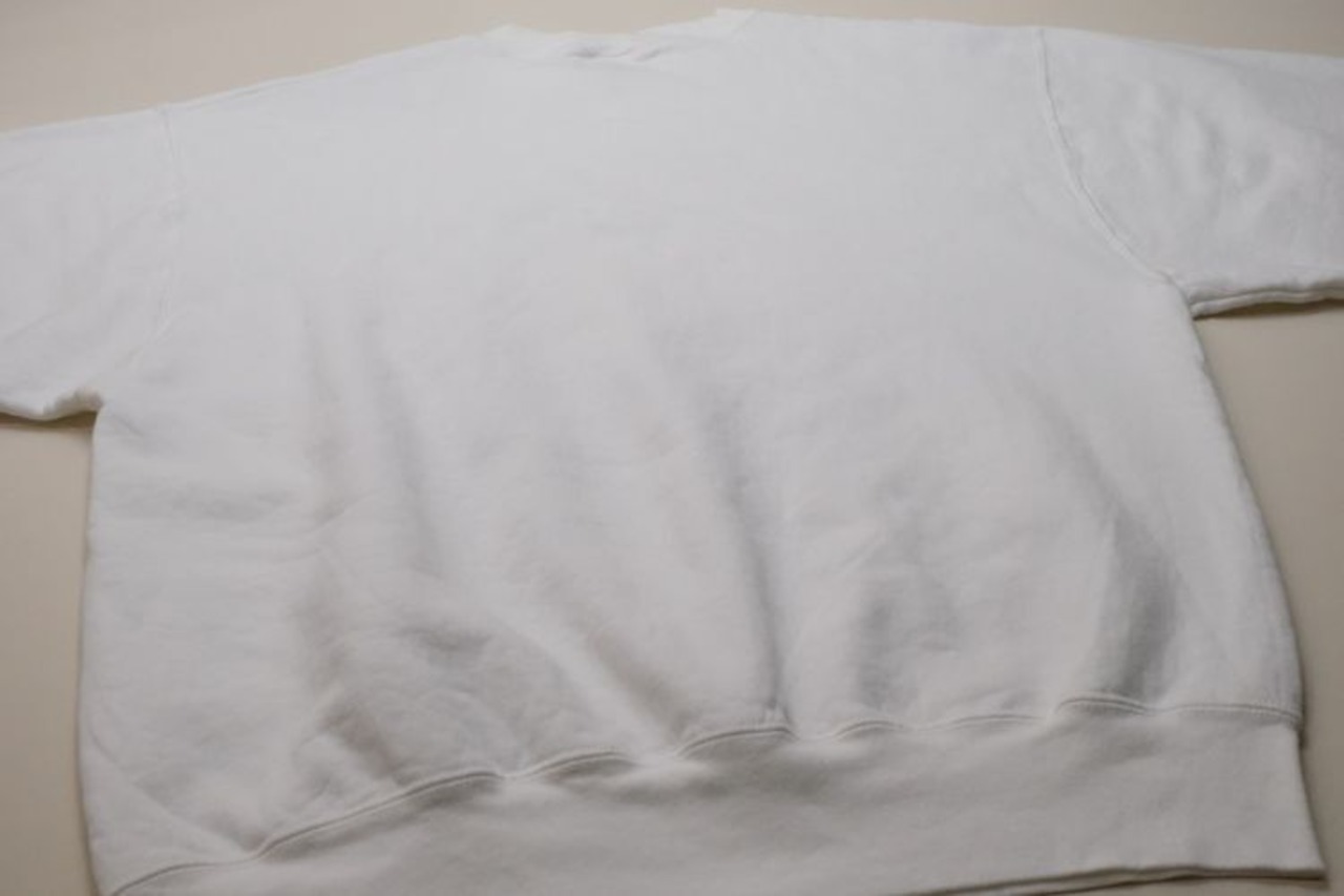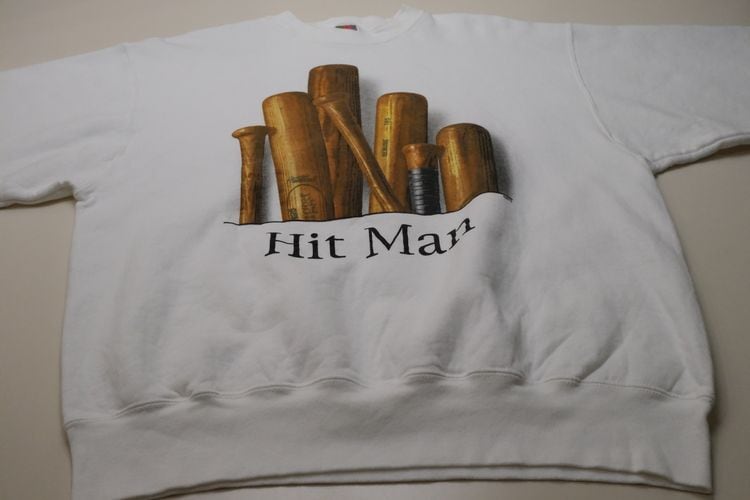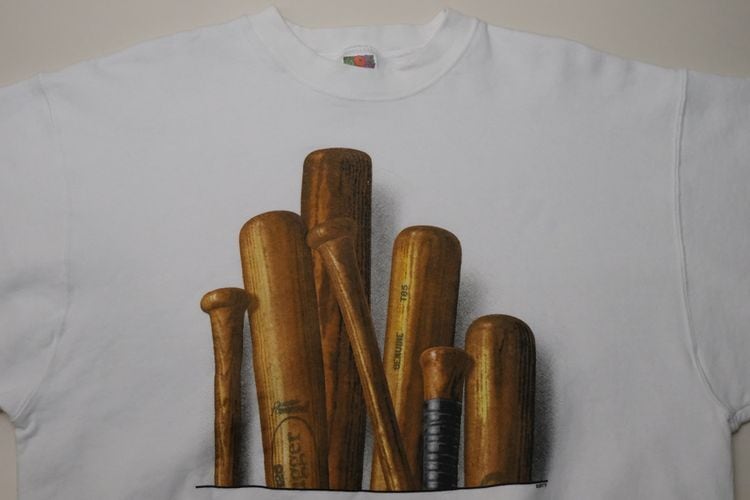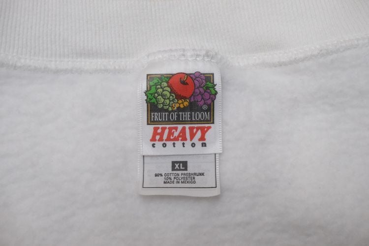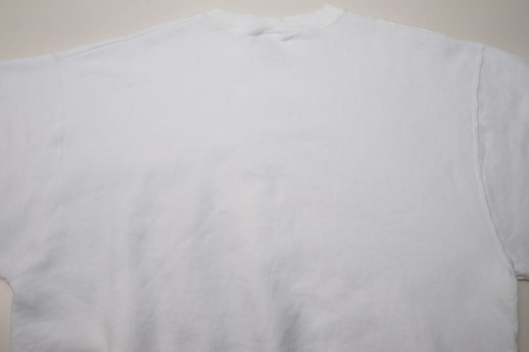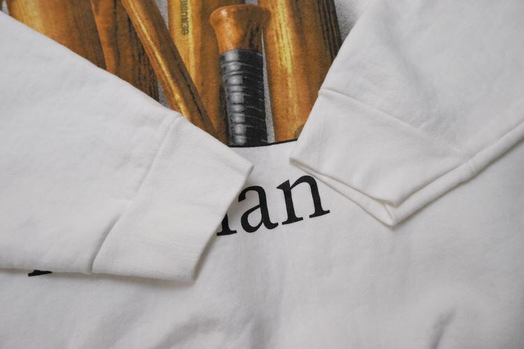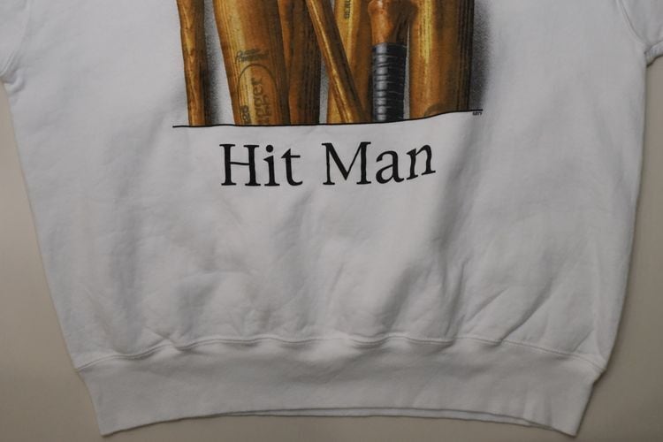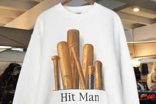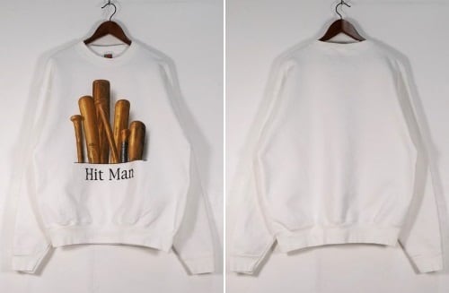 1851年にケンタッキー州ボーリンググリーンで創業された老舗カジュアルウェア・ブランド"FRUIT OF THE LOOM"から2000年代頃のスウェット。程よい厚さでしなやかなコットン×ポリエステル(90/10)混紡素材を使用し、爽やかなホワイトの色味と裏起毛による柔らかな肌触りが魅力のアイテムです。ざっくりとした着用に適したオフショルダーのボリュームあるシルエット、フロントに大きく入る木目や擦れた質感まで描き込まれたバットの写実的なグラフィックに"Hit Man"という強い言葉を重ねたスポーツ的な意味合いと過激さをあえて曖昧にしたプリントが目を惹く仕上がりとなっています。全体的に着用した様子のあまり感じられないたいへん良いコンディションですが、あくまでUSED品ですのでご理解の上ご検討ください。幅広いボトムスに合わせることのできる使い勝手の良さ、または落ち着きある綺麗めのアイテムと合わせた遊び心ある大人の外しとしても楽しんでいただける1本です。