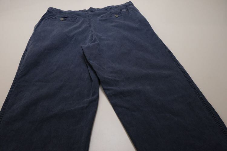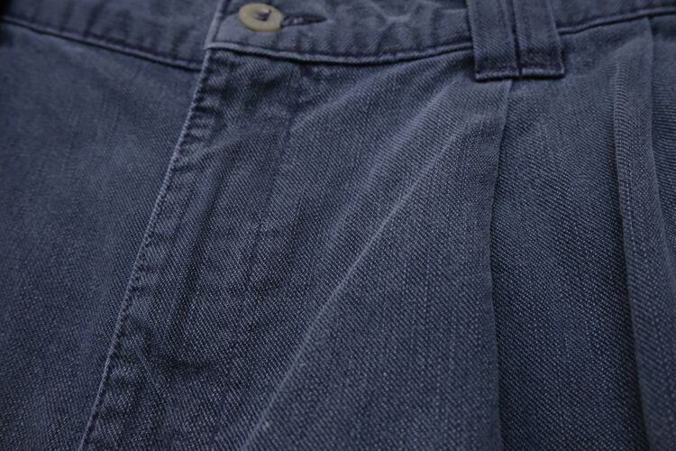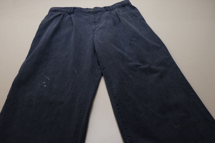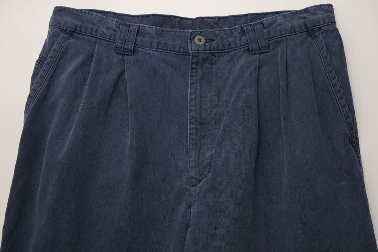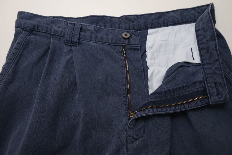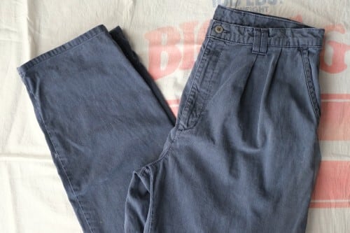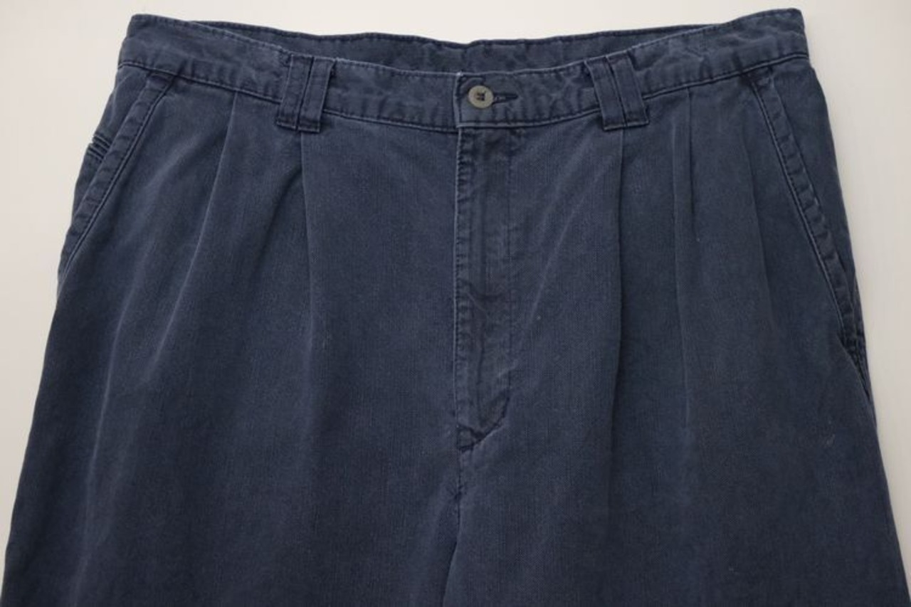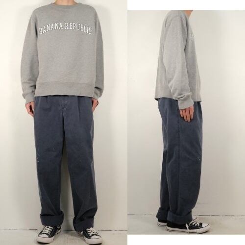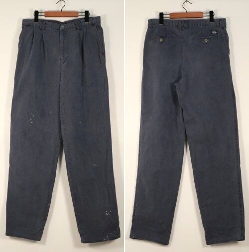 "Levi's"ブランドのひとつとして1986年に誕生した"DOCKERS by Levi's"から90年代頃のパンツ。程よい厚さでタフな100%コットン・ツイルを使用し、スラブ糸による縦ムラのある素材の表情と着用と経年により程よくフェードしたライトネイビーの色味にこなれた風合いの良さを感じるアイテムです。腰まわりにゆとりのある股上の深いツータック、広いワタリから裾口に掛けてテーパードを効かせたワイド・シルエットが特徴となっています。着用の上で問題となるダメージや汚れはございませんが、全体的に色褪せや色落ち、各所にペンキ汚れが点在していますので、この汚れを含めた1点ものらしい雰囲気を好まれる方におすすめ致します。ややオーバーサイズのトップと合わせたゆるい雰囲気から、少し細みのトップと合わせたバランスのあるコーディネートまで幅広く使えるおすすめの1本です。