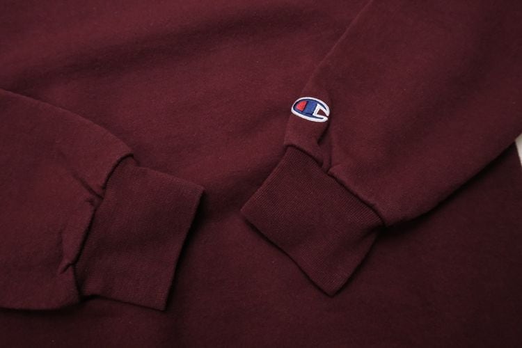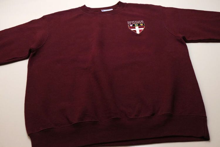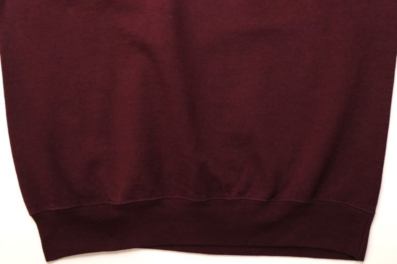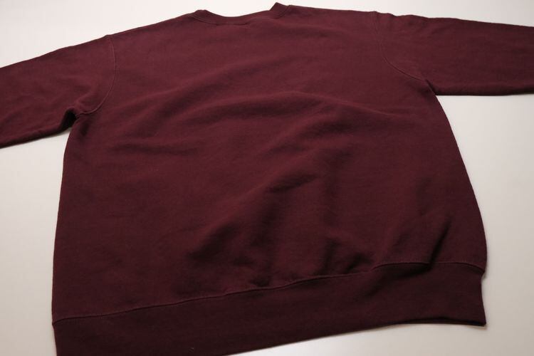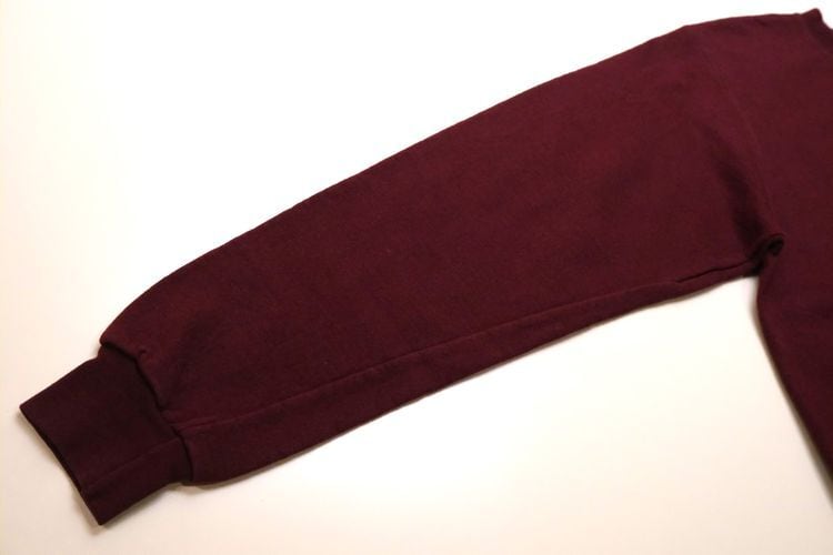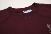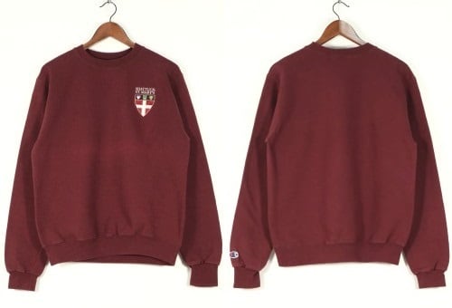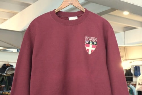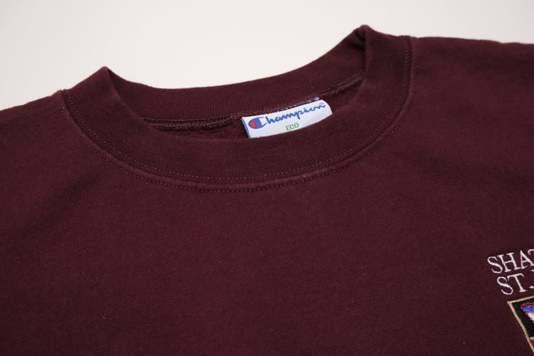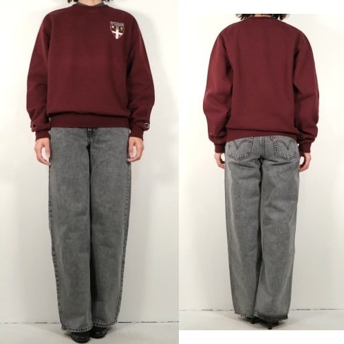 1919年"Champion Athleticwear"としてニューヨーク州ロチェスターで設立されたアスレチックウェア・ブランド"Champion"より、バーガンディ色刺繍入りスウェット。セットインスリーブ、クセのないスタンダードなシルエットに、アメリカ・ミネソタ州にあるボーディングスクール"Shattuck-Saint Mary's School"のエンブレムマーク刺繍がアクセントになっています。中厚手の裏起毛スウェットは軽い着心地と柔らかな風合いが魅力です。とくに目立ったダメージはございませんが、多少の着用感が見られますのであくまでUSED品とご確認の上ご検討ください。ベーシックな表情は流行り廃りなく、幅広いスタイリングに馴染みます。