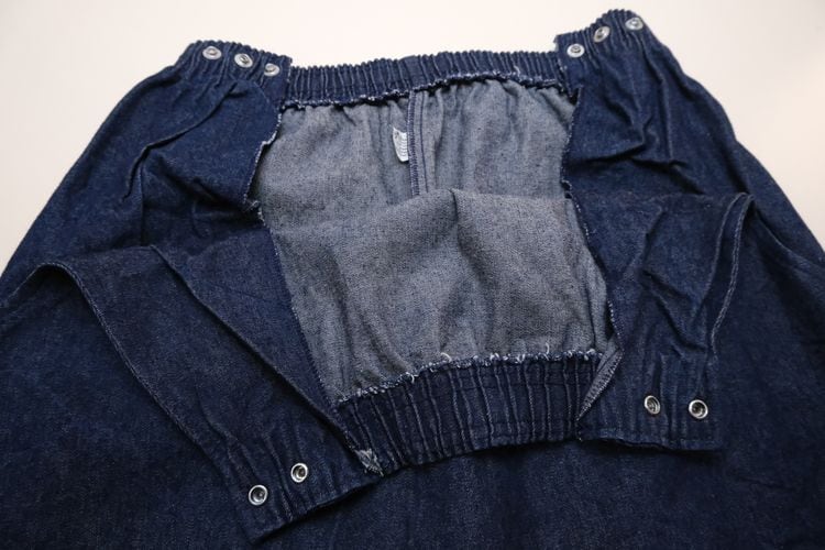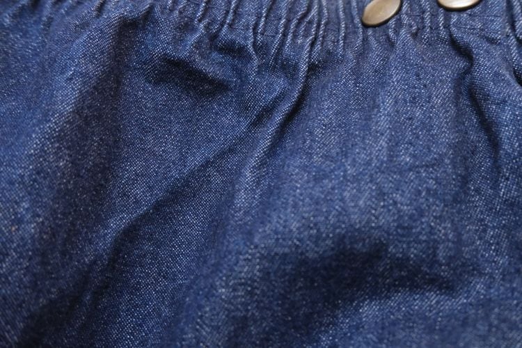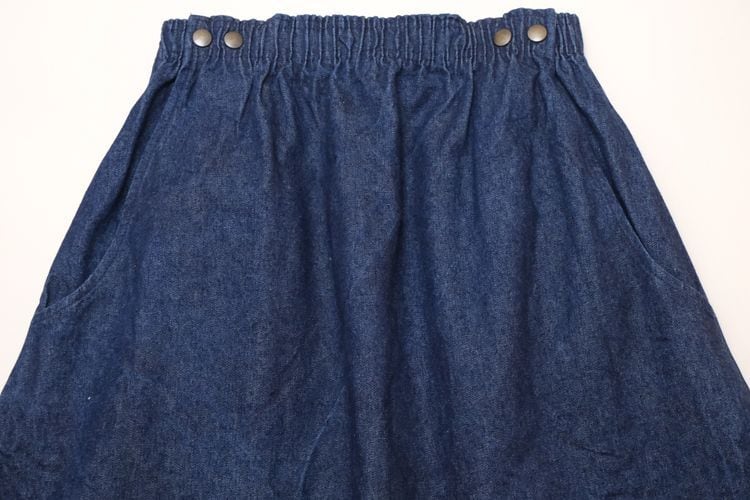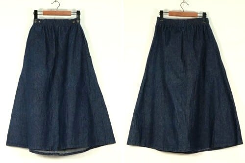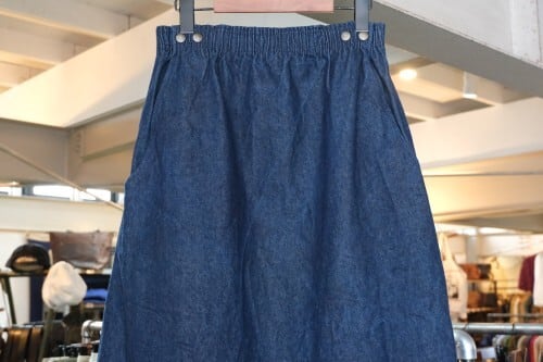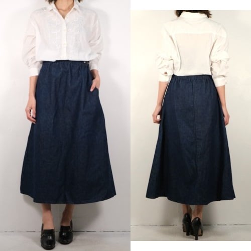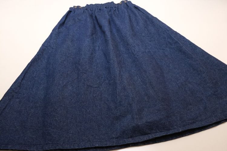 70年代アメリカ製デニムのフレアーロングスカート。ワンウォッシュ程度の濃色ヴィンテージデニムの質感が魅力のアイテムです。ウエストゴム入りで程よく広がるロング丈シルエット、左右のスナップボタン開閉でサイズ調節できる作り。ほとんど色落ちしていない中厚手のツイルデニムは、これから穿き込むことで良い縦落ちが期待できます。着用感は見られず綺麗なコンディションですが、洗いがかけられておりますのであくまでUSED品とご理解の上ご検討ください。流行り廃りなく、年代問わずにベーシックとして永くご愛用いただけ、馴染んで変化していく表情に愛着も増すと思います。
