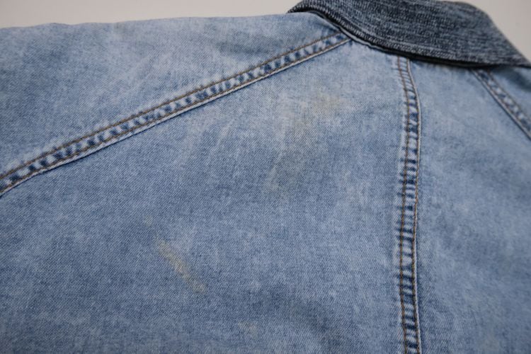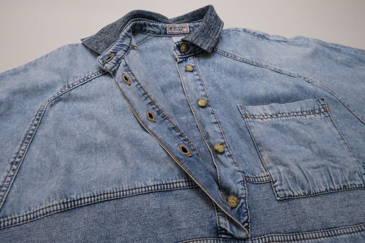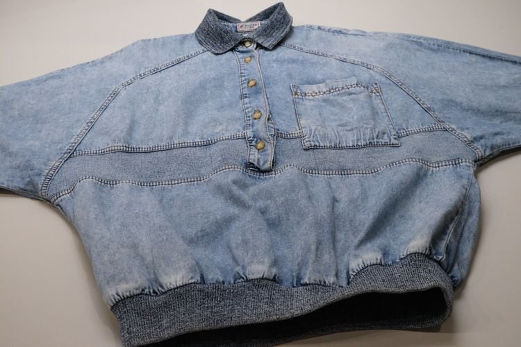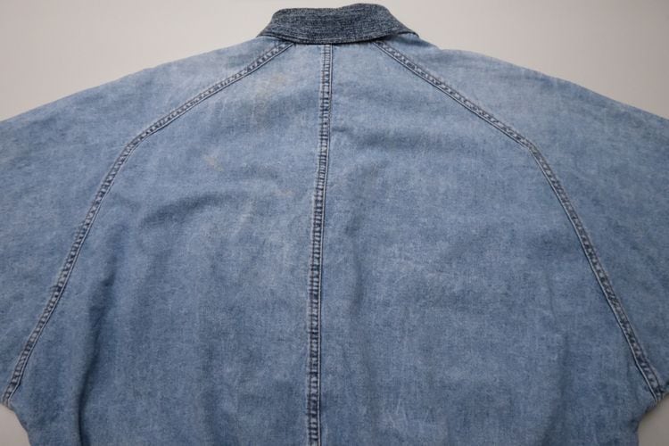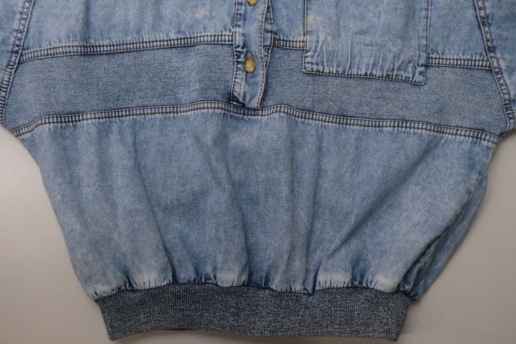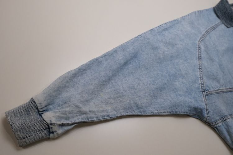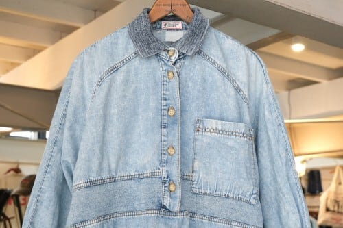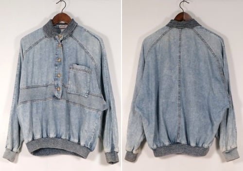 80年代アシッドウォッシュデニムのプルオーバーシャツ。デニムの色みやデザインに80年代らしさが詰まった、ユニークな表情のアイテムです。深いアームのラグランスリーブ、ボリュームたっぷりのバルーンシルエットに、リブニットの切り替えデザイン。カフスと裾はリブでフィットし、オーバーサイズになり過ぎないバランス感が絶妙です。中厚手のデニム生地はウォッシュカラーが雰囲気良く、程よい厚みでシャツとしてもアウターとしても着用できます。コンディションとして多少の着用感があり、アシッドウォッシュデニム特有の変色や袖口に擦れなど見られますのでUSED品とご確認の上ご検討ください。肩のラインが直線を描き、張って見えないところも魅力のひとつです。