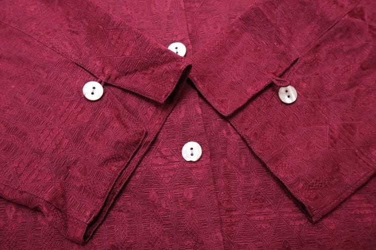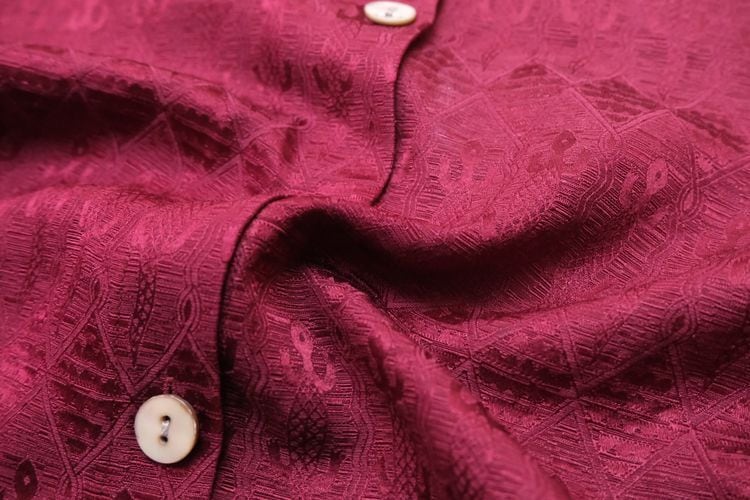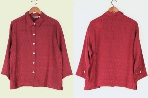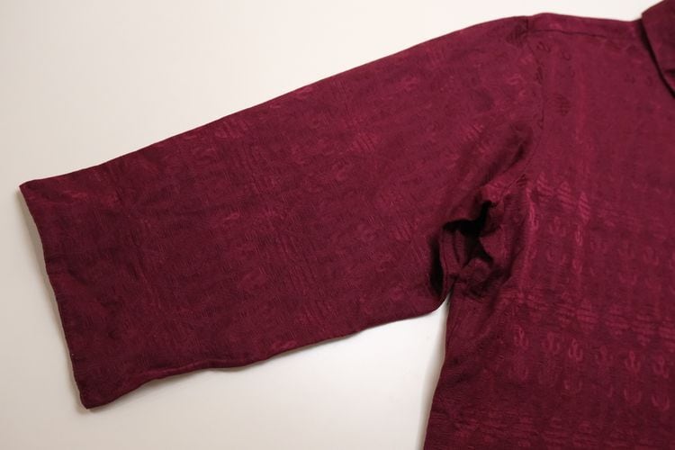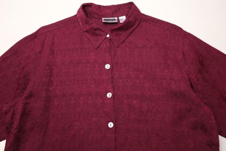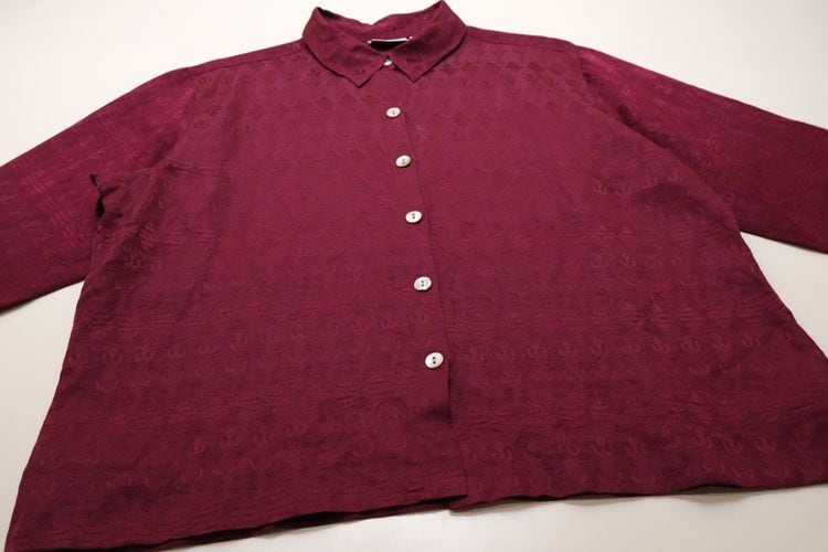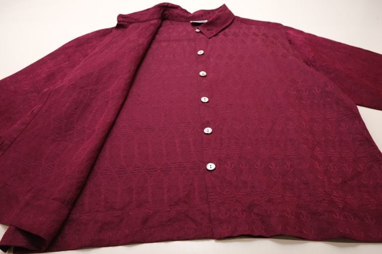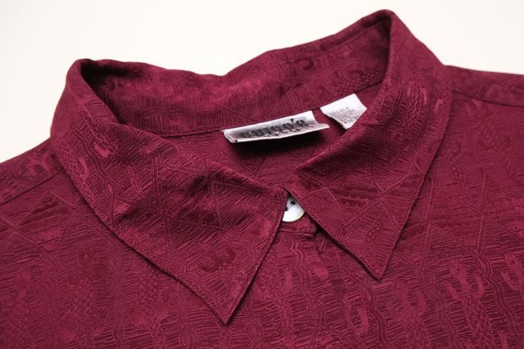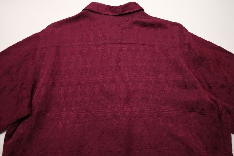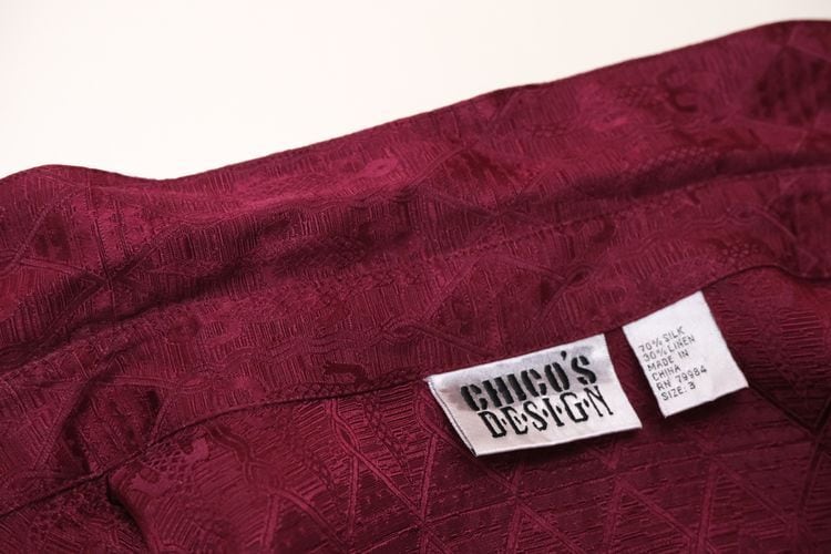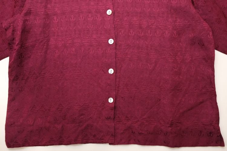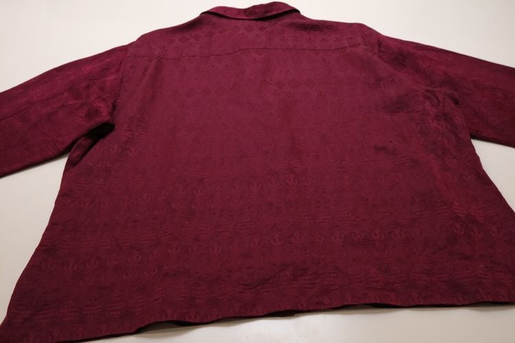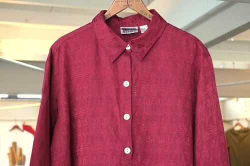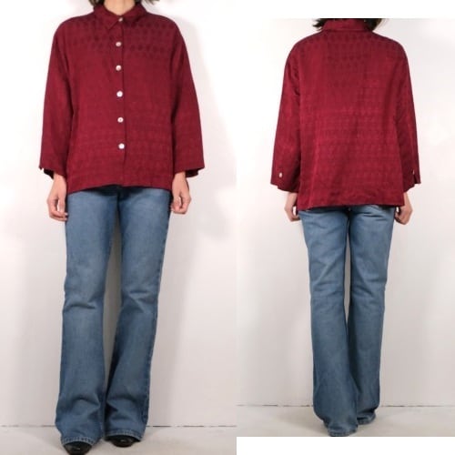 1983年設立アメリカのファッションブランド"CHICO'S DESIGN"『チコズデザイン』より、シルク×リネンジャガードのボックスシャツ。世界中からインスピレーションを得た、芸術的でスタイリッシュなデザインが得意なブランドで、こちらは上質な素材感に落とし込まれたトカゲモチーフのテキスタイルがユーモラスな一品です。スリット入りの裾と袖口が特徴のゆったりめのボックスシルエット、プレーンなボディに貝ボタンがアクセントになったデザイン。厚みのあるシルク×リネン混紡生地はシルクの美しい光沢と落ち感にリネンの鈍いシャリ感のある質感が特長で、素肌にも肌触り良く、シルエットを綺麗に保ちます。コンディションは良く、とくに目立ったダメージは見られません。深いワインレッドの色味も美しく、一枚で主役になるアイテムです。