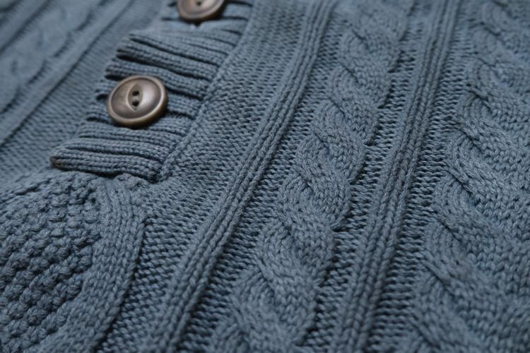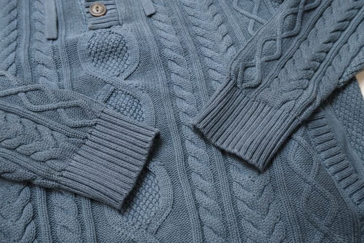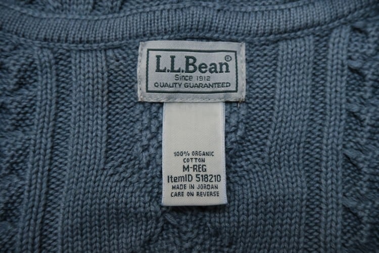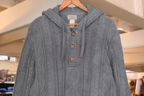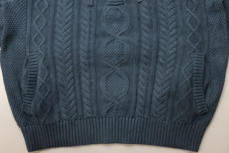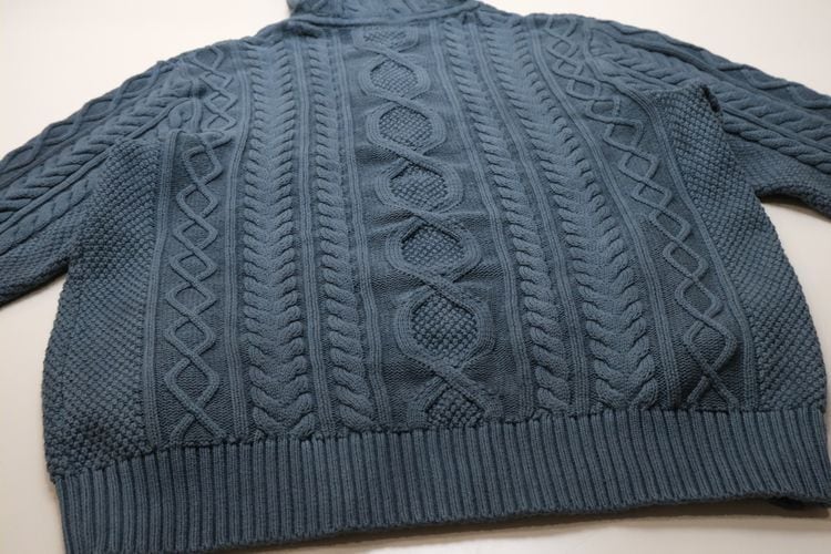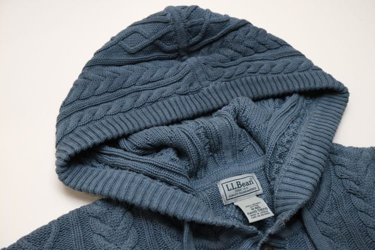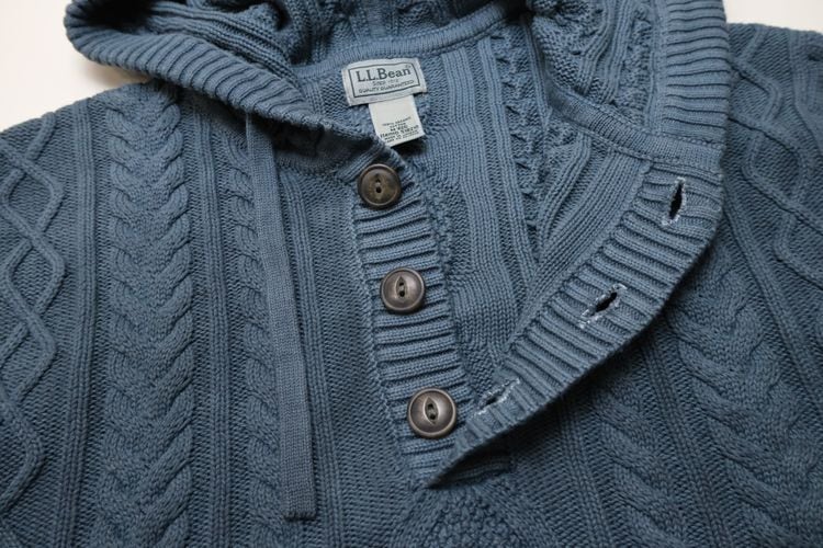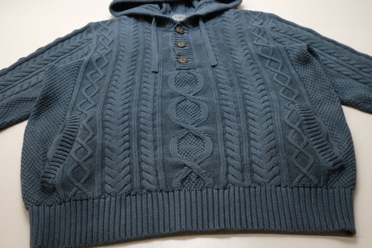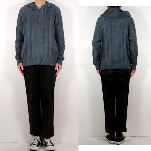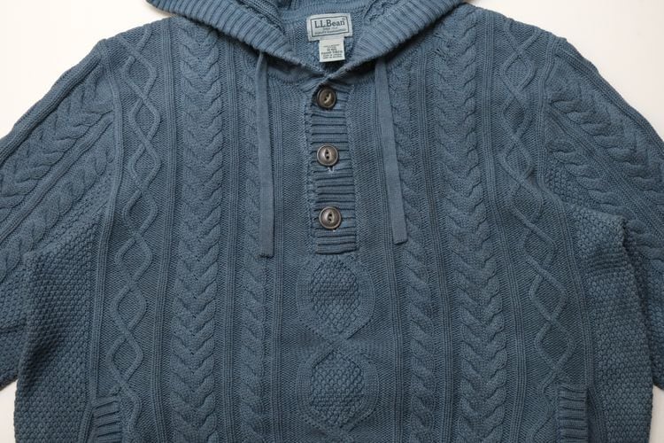 1912年"Leon Leonwood Bean"によりメイン州フリーポートで創業された"L.L.Bean"からフィッシャーマン・セーター。ミドルゲージでゆとりを持たせ編み立てられた100%コットンの素材感に、後染めによるスモーキーブルーのくすみある色味がたいへん渋い雰囲気のアイテムです。肩幅と身幅にクセのない程よくゆとりのあるシルエット、フード付き、3つボタンのプルオーバー、スラッシュ・ポケットのディテールに、複数のケーブルとモス・ステッチが織りなす立体的な凹凸、そして後染めによる独特な陰影がたいへん魅力となっています。着用の上で問題となるダメージや汚れはございませんが、所々に若干の色ムラがあるUSED品ですのでご理解の上ご検討ください。身体のラインに馴染むコットン・ニット独特な着心地の良さに、コートやジャケットと合わせたアクセントとして取り入れるだけで装いに奥行きある表情を加えてくれる1本です。