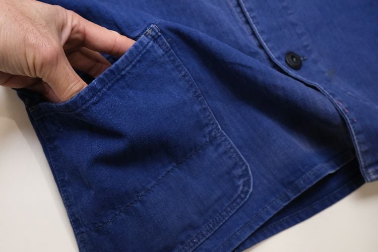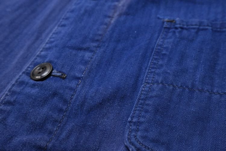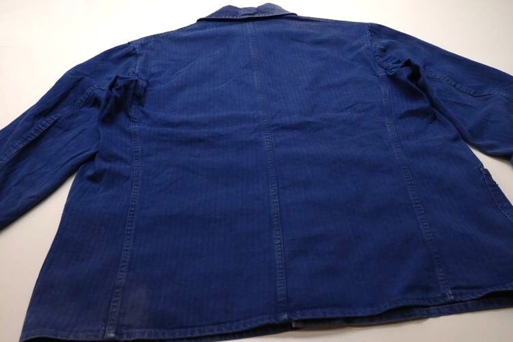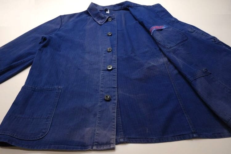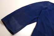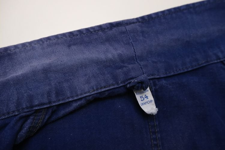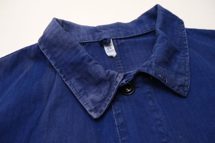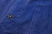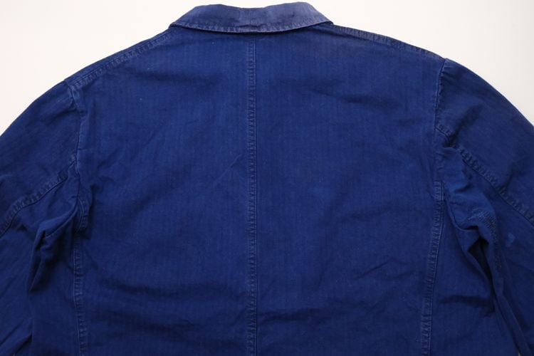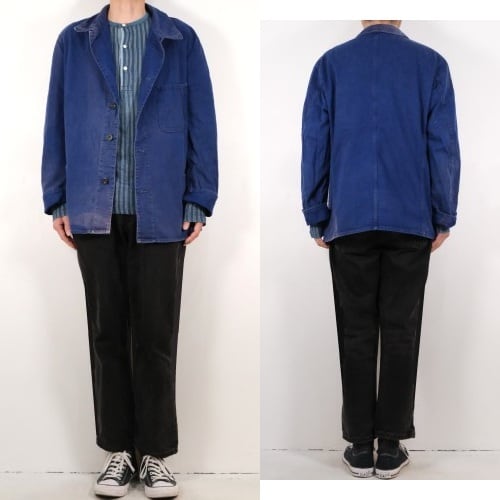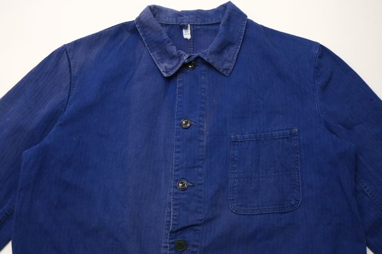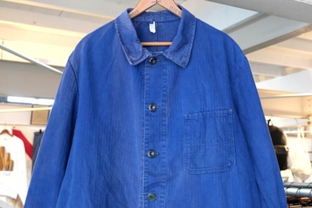 1919年にドイツのニーダーザクセン州イェーヴァーで設立された"Ahlers"のワークウエア・ライン"PIONIER"から60年代後期頃と思われるワーク・ジャケット。程よい厚さでしっかりと張りのあるヘリンボーン・ツイル(100%コットン)を使用し、深みがありつつ明るさを感じるロイヤルブルーの上品な色味が目を惹くアイテムです。肩幅と身幅のバランスにクセのないゆったりめのシルエット、小ぶりな襟、ボタンアップ・フロント、胸ポケット、左右のロウアー・ポケットなどベーシックなデザインとなっています。着用の上で問題となる大きなダメージや汚れはございませんが、右袖口上と後部の右脇に大きなダメージ補修、所々に色焼けや色褪せ、スレ、ダメージの点在する着古されたコンディションですので、この1点ものらしい風合いを好まれる方におすすめ致します。さらっと羽織るだけでワーク・スタイルを演出でき、これから着込むほどに生地が馴染み、洗濯を重ねるたびに更にアタリや色落ちが現れ、ご自身だけの1本に仕上がっていきます。
