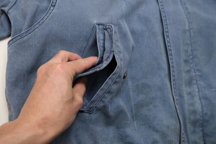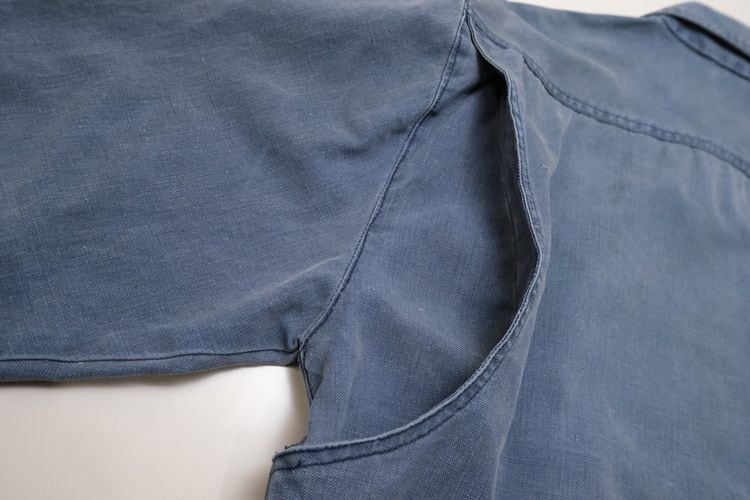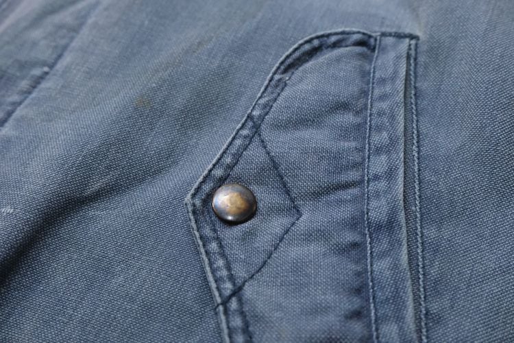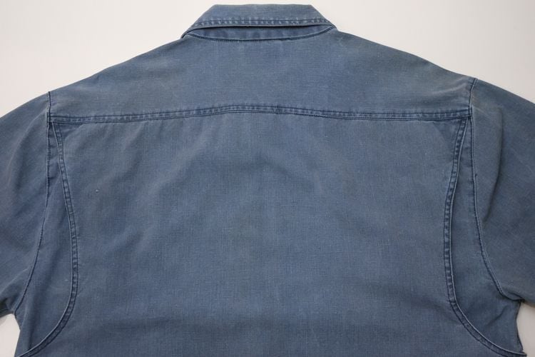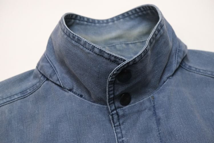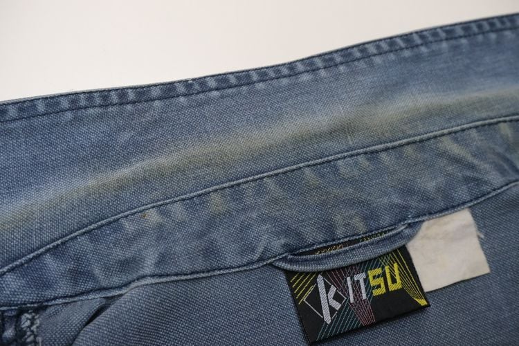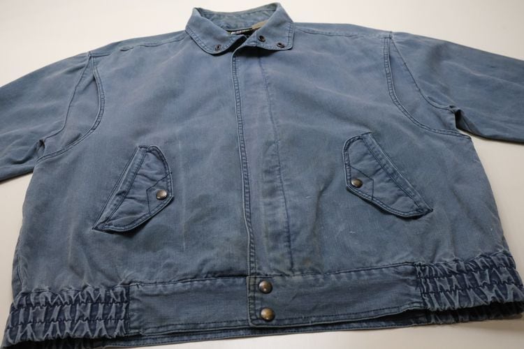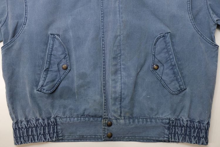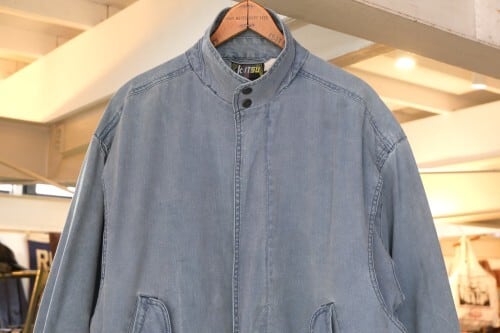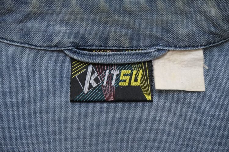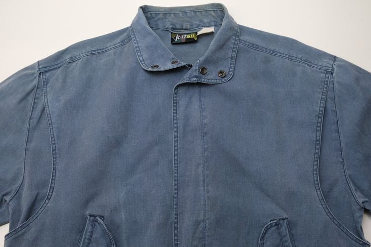 ローカル・ブランド"KITSU"から80年代初期頃と思われるジャケット。程よい厚さでしっかりと張りのある100%コットン・キャンバス(表記なし)を使用し、着用と経年によりフェードしたスモーキーブルーの色味がたいへん雰囲気の良いアイテムです。ざっくりとした着用に適したボリュームあるシルエット、2つボタンのスタンド・カラー、ボタン×ジップアップ・フロント、スラッシュとフラップのダブル・ポケット、前後に配されたアクション・プリーツが立体的な動きを生みシルエットに奥行きを与えています。着用の上で問題となる大きなダメージや汚れはございませんが、右ポケットまわりに薄っすらとしたシミ汚れ、襟まわりに色褪せ、袖口に小さなダメージなどのある着古されたコンディションですので、この1点ものらしい風合いの良さを好まれる方におすすめ致します。デニムやチノ・パンツにさらっと合わせるだけで力の抜けたワーク・テイストのスタイリングがまとまり、Tシャツやスウェットの上から軽く羽織るようなラフな着こなしにも相性の良い1本です。