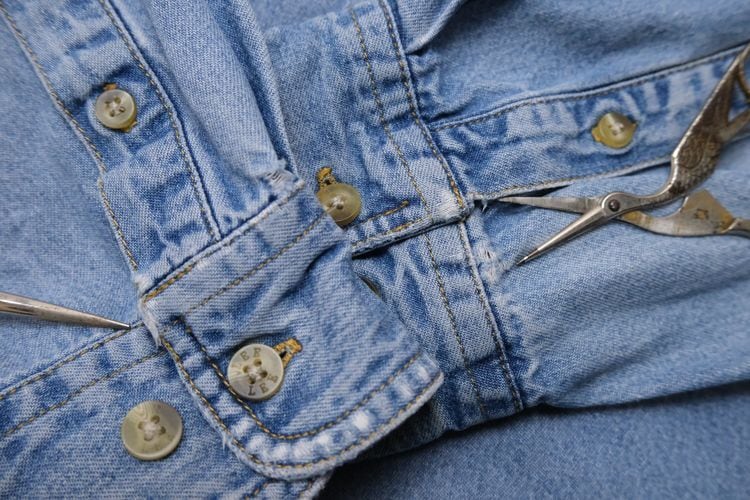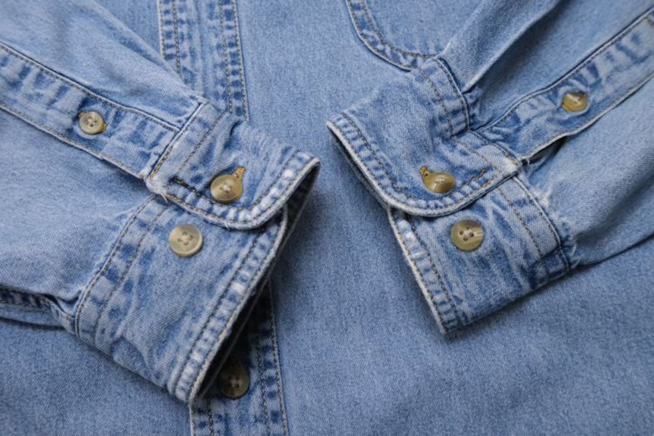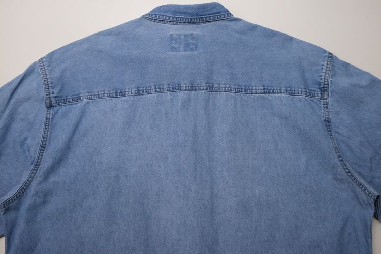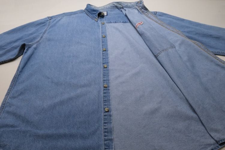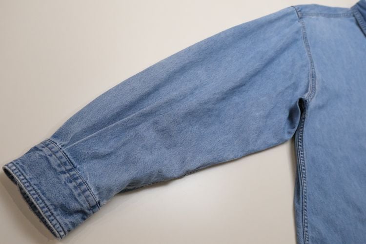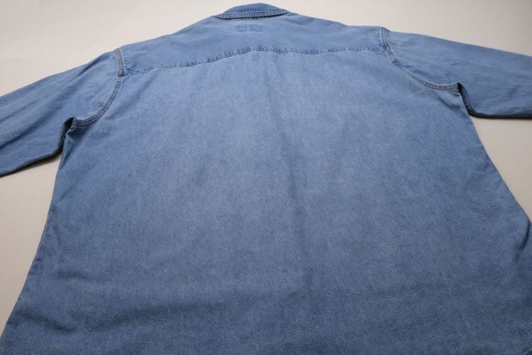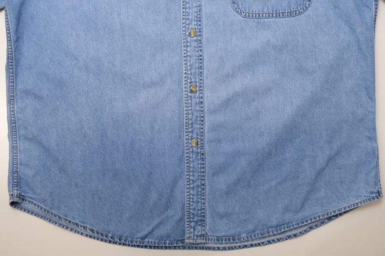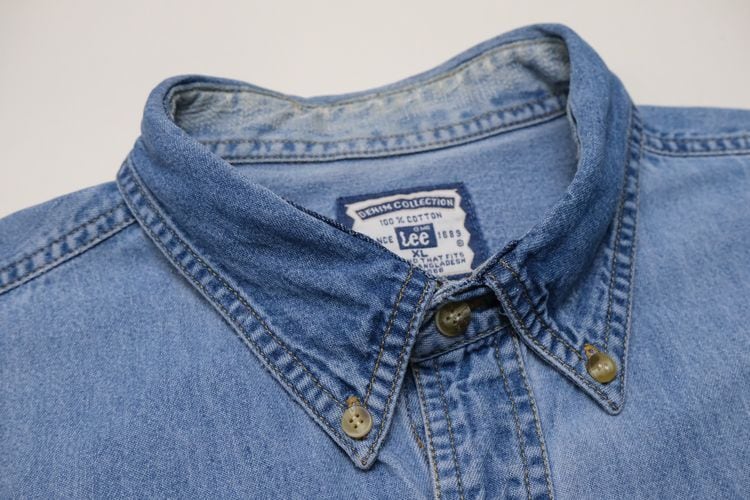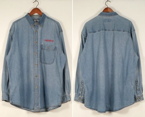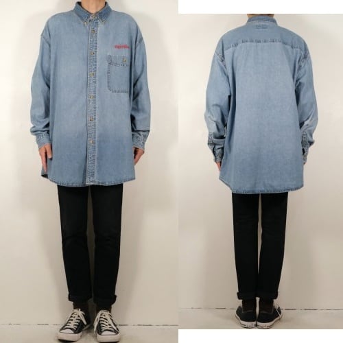 1889年にカンザス州サライナで創業された世界的なデニム・ブランド"Lee"から2000年代初期頃のデニム・シャツ。程よい厚さでしっかりとした100%コットン・デニムを使用し、着用と経年によりフェードしたライトインディゴの淡い色味とアタリにこなれた雰囲気の良さを感じるアイテムです。リラックスした着用に適したオーバーサイズ・シルエット、小ぶりなボタンダウン・カラー、この年代らしい大きな左胸ポケット、そしてポケット上に配された世界最大級の石油・エネルギー企業である"ExxonMobil"の赤いロゴ刺繍がアクセントとなっています。着用の上で問題となる大きなダメージや汚れはございませんが、カラー・バンド(台襟)にダメージ補修、両袖カフスまわりにダメージ、右首元にダメージ補修、襟裏にダメージ補修のある着古されたコンディションですので、このダメーや補修を含めた風合いの良さを好まれる方におすすめ致します。カジュアルなものから少し落ち着いたボトムスまで幅広く合わせることのでき、ボタンを留めずにプレーンのTシャツなどの上にさらっと羽織るコーディネートもおすすめです。