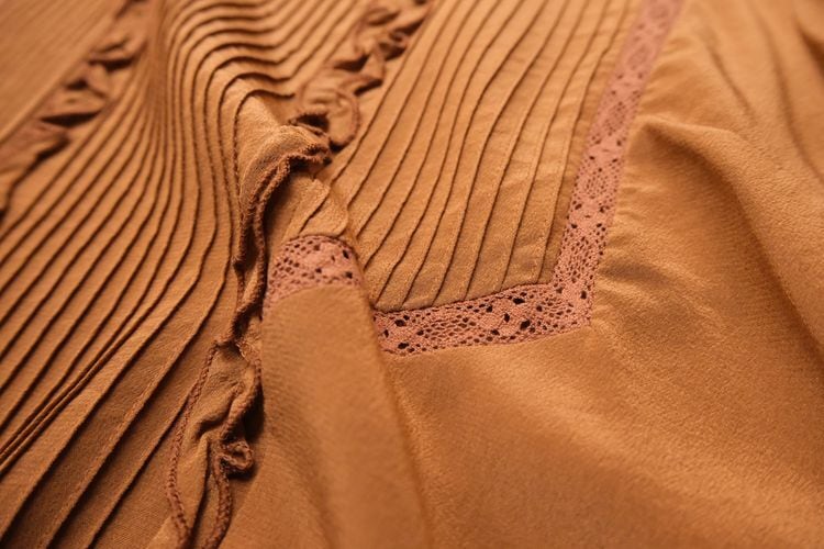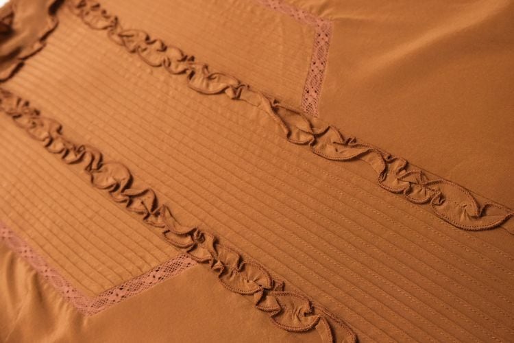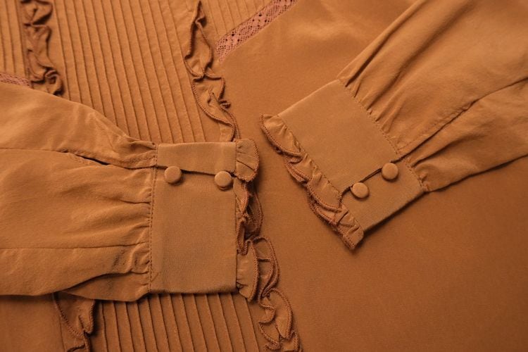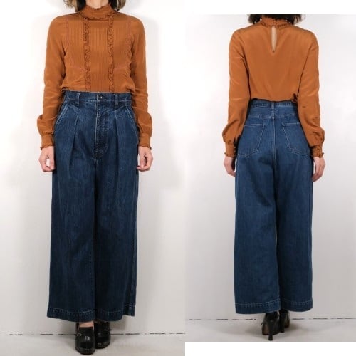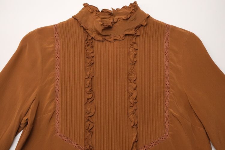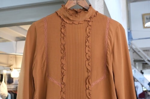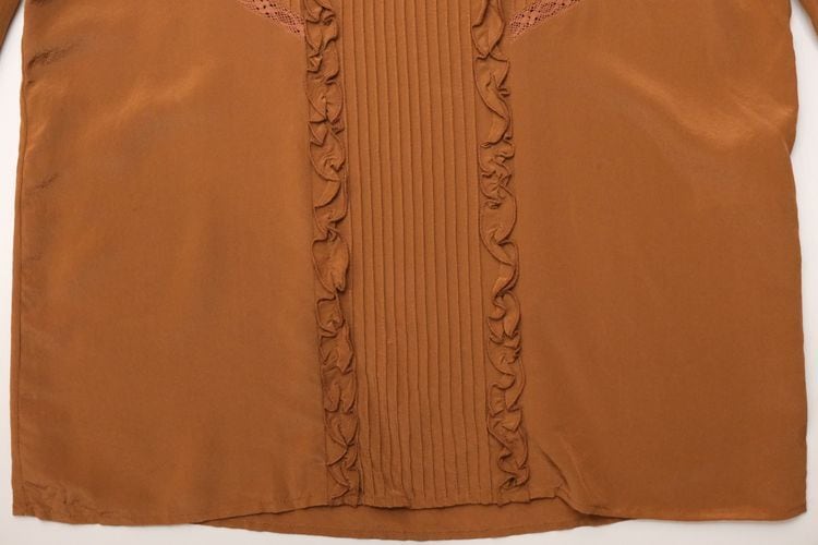 元々ヴィンテージ好きだったデザイナー"Morgane Sézalory"がヴィンテージのアレンジやデザインソースに服作りを始め、2013年パリにて設立したブランド Sézane 『セザンヌ』より、テラコッタ色シルクのフリルブラウス。全体的にすっきりとしたシルエット、ネック後ろにボタンが配されたプルオーバースタイル。レースで縁取りされたピンタックのヨーク、ネックやカフスに施されたフリルのデザイン。テラコッタの色味が甘さを抑え、カジュアルなスタイリングにも馴染みます。鈍い光沢がエレガントなシルククレープ生地を使用し、美しいラインを保つ仕立ての良さも魅力となっています。コンディションとして多少の着用感があり、右腹部に薄っすらとしたスポット汚れ、皺跡の色落ちが見られますのでUSED品とご確認の上ご検討ください。シルク素材のためロングシーズン活躍し、一枚での着こなしはもちろん、インナー使いにも向く一品です。