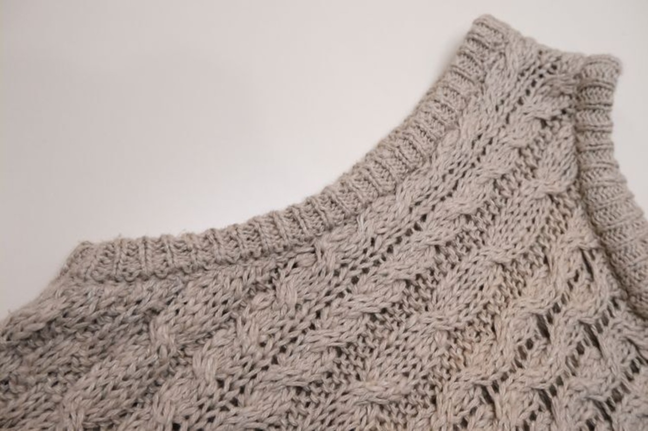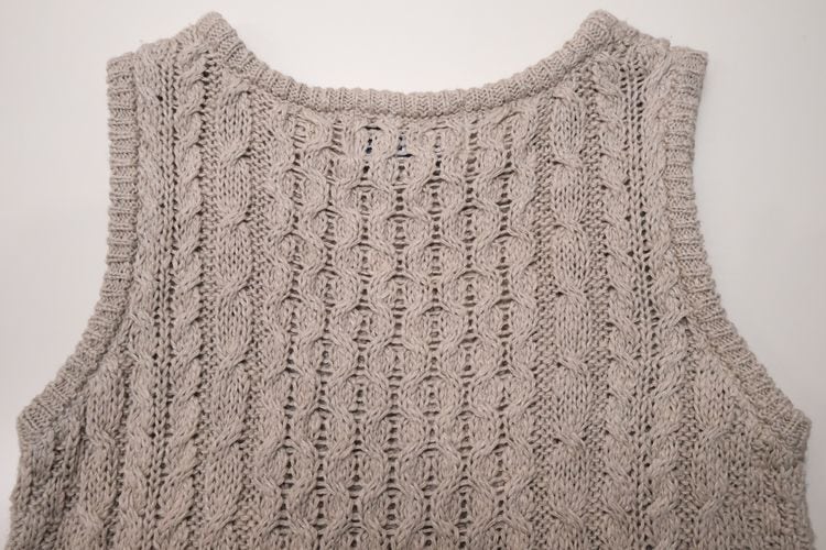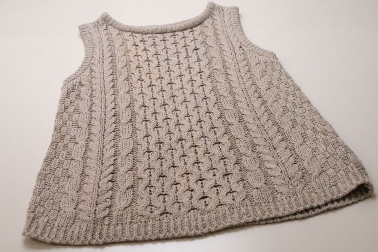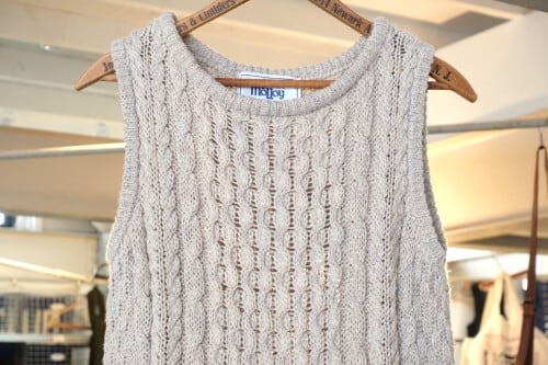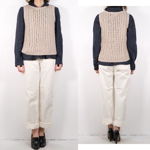 アイルランド・ドネガル地方の老舗ニットメーカー John Molloy 『ジョン・モロイ』より、アイルランド製リネンのニットベスト。トラディショナルなアイリッシュウールのセーターで有名なブランドですが、こちらはリネン混紡素材を使用したサマーニットアイテムです。クルーネックのプルオーバー型に、伝統的なケーブル編みが素朴な味わい。緩く空気を含ませ編み上げたニットは、肌触りが柔らかく風を通す気持ちの良い着心地で、ロングシーズンお楽しみいただけます。コンディションは良く、とくに目立ったダメージは見られません。Tシャツなどにさらりと羽織るだけでも雰囲気良く、素材の持ち味をたっぷりとお楽しみいただける一品です。