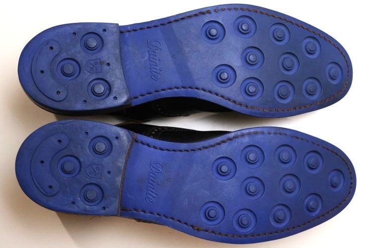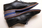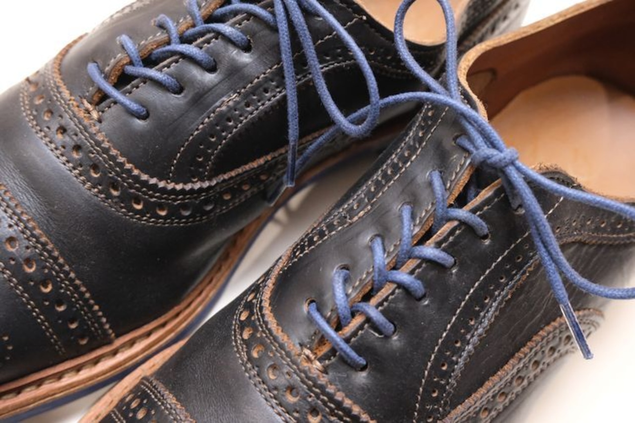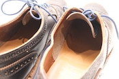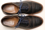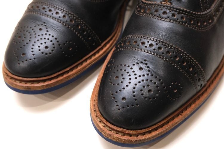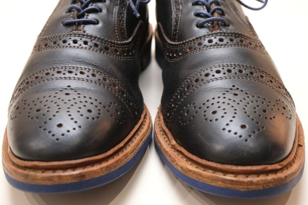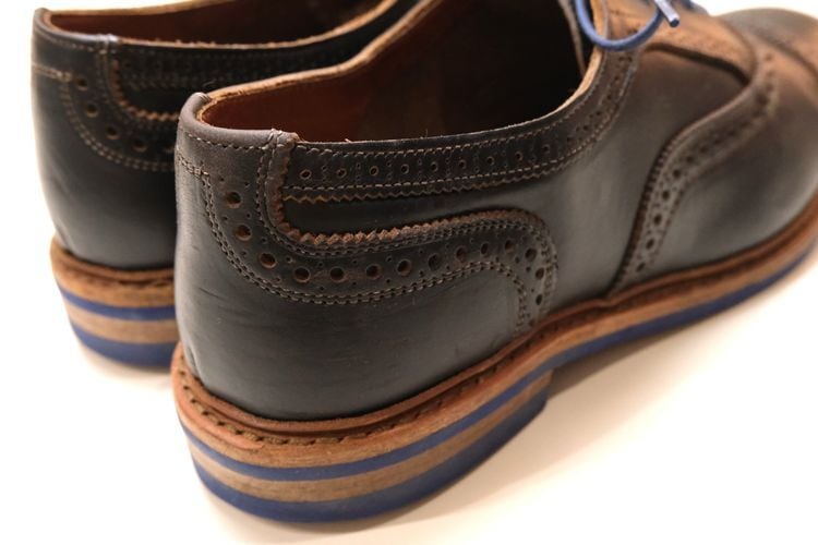 1922年創業されたアメリカ紳士靴の名門ブランドのひとつ"Allen Edmonds"『アレン・エドモンズ』から"Strandmok"ドレス・シューズ。キメが細かく光沢の抑えられたカーフ・レザーの美しい表情に、丸みを帯びたメダリオンの入るパンチド・キャップトゥ、内羽根6アイレットで仕上げられた端正さと控えめな華やかさが魅力のアイテムです。繊細なステッチ・ワーク、グッドイヤー・ウエルト製法など熟練した職人による高いクオリティー、ブルーのシュー・レースとソールには鮮やかなブルー・ラバーを組み合わせることでモダンなコントラストを形成し、レザー×ラバーのレイヤード・ヒールも視覚的なアクセントとなっています。全体的にソール減りが少なめの良いコンディションですが、着用による履きシワや小さなスレなどのあるUSEDコンディションですのでご理解の上ご購入ください。ドレス・シューズとしては程よく砕けた表情がたいへん魅力で、ラフな装いを引き締めるカジュアル・アップから、フォーマルを程よく崩すドレス・ダウンまで幅広く対応するおすすめの1足です。