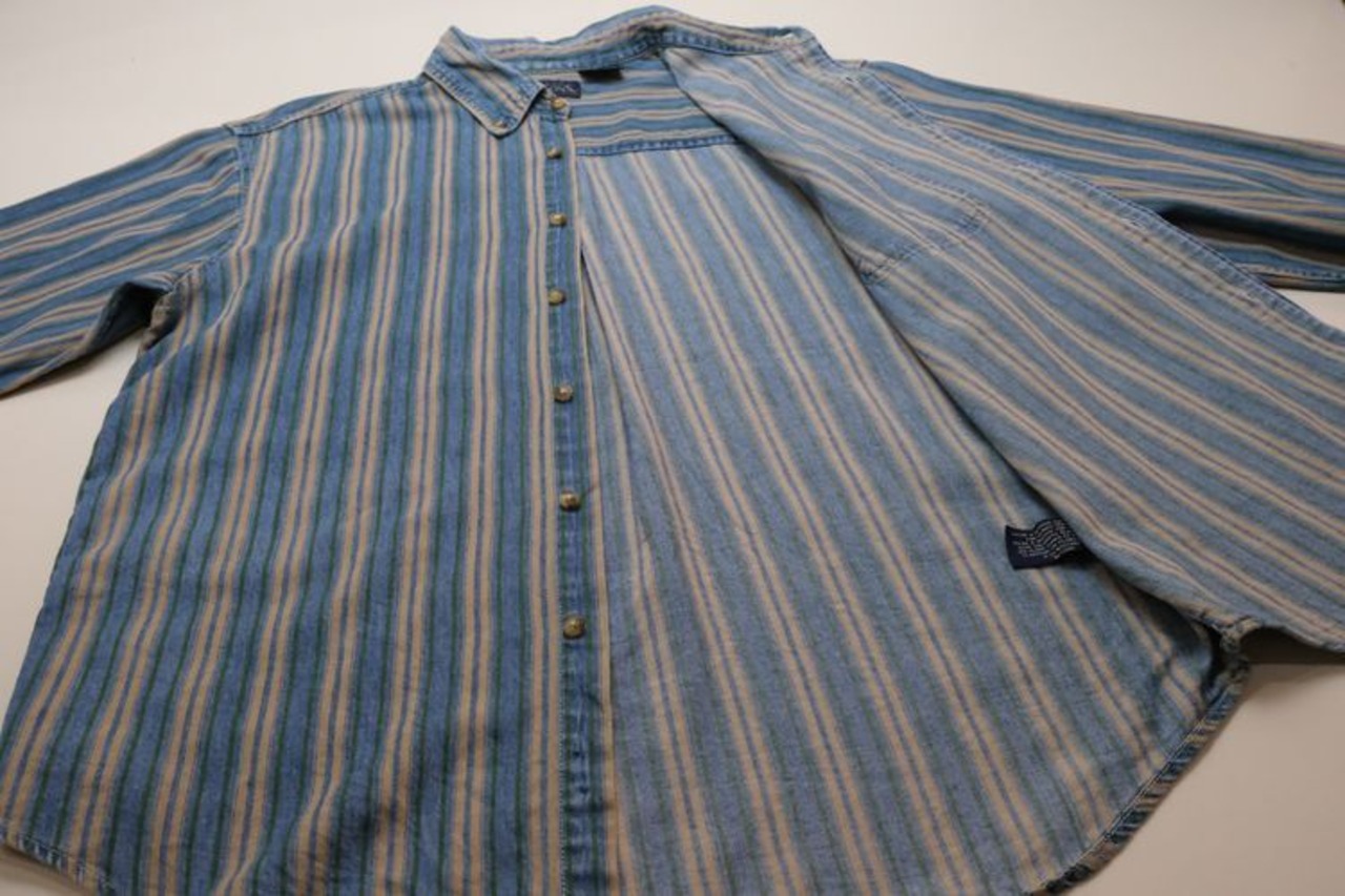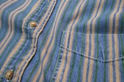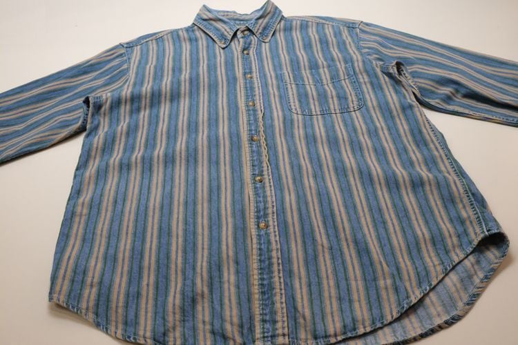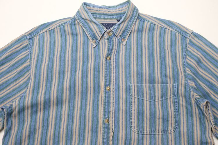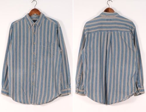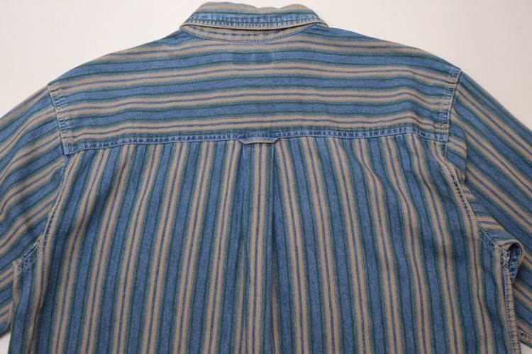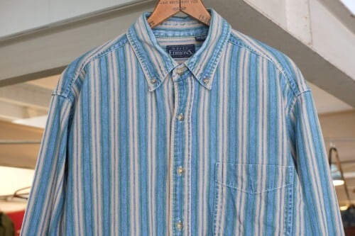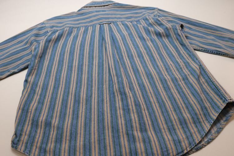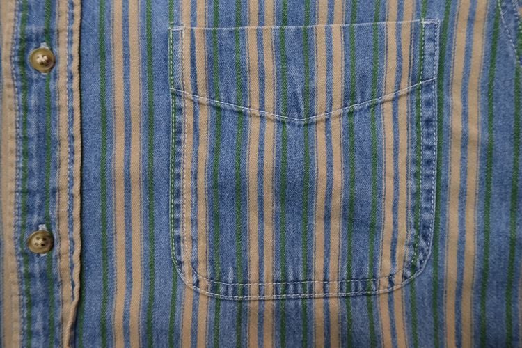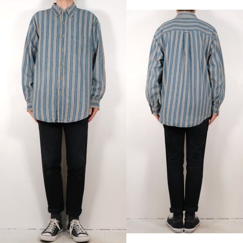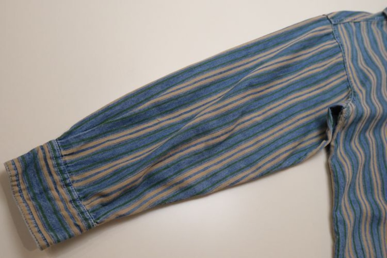 1897年にテネシー州メンフィスで創業されたデパートメント・ストア"Kmart"のプライベート・ブランドである"BASIC EDITIONS"から90年代頃のシャツ。程よい厚さでしっかりと張りのある100%コットン(平織り)を使用し、ライトインディゴをベースにグリーンとベージュを織り交ぜたマルチ・ストライプがストライプにカジュアルな雰囲気を感じるアイテムです。小ぶりなボタンダウン・カラー、柄合わせのされた胸ポケット、アームホールが太くオフショルダーのルーズなシルエットにこの年代らしさを感じることができます。着用の上で問題となるダメージ汚れはございませんが、フロントの右袖に小さなダメージ、全体的に着用感のあるUSEDコンディションですので普段から古いものをご愛用の方におすすめ致します。1枚でさらっとした着こなしから、ボタンを留めずにTシャツやカットソーの上からさらっと羽織るラフなスタイリングにも取り入れやすく、着用による色褪せと素材の表情がたいへん魅力の1本です。
