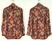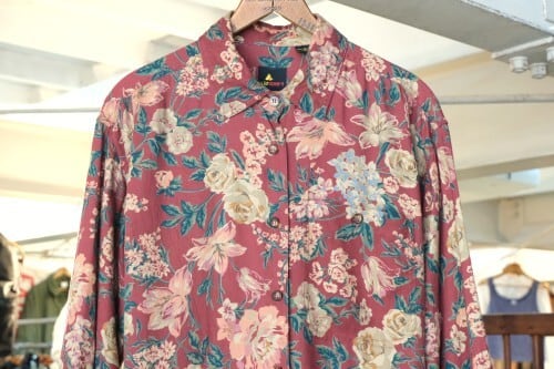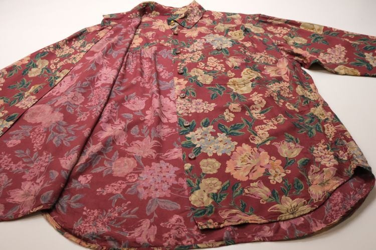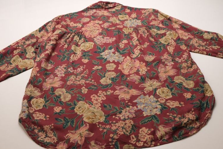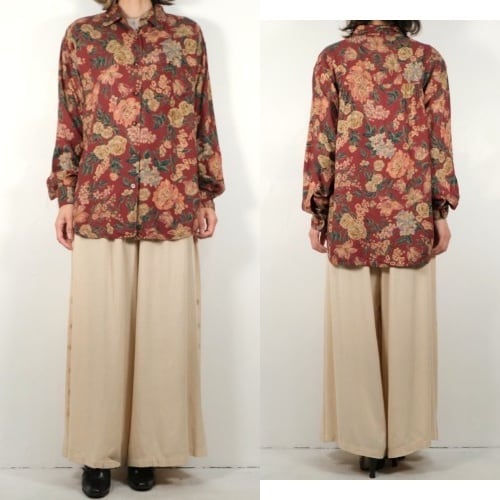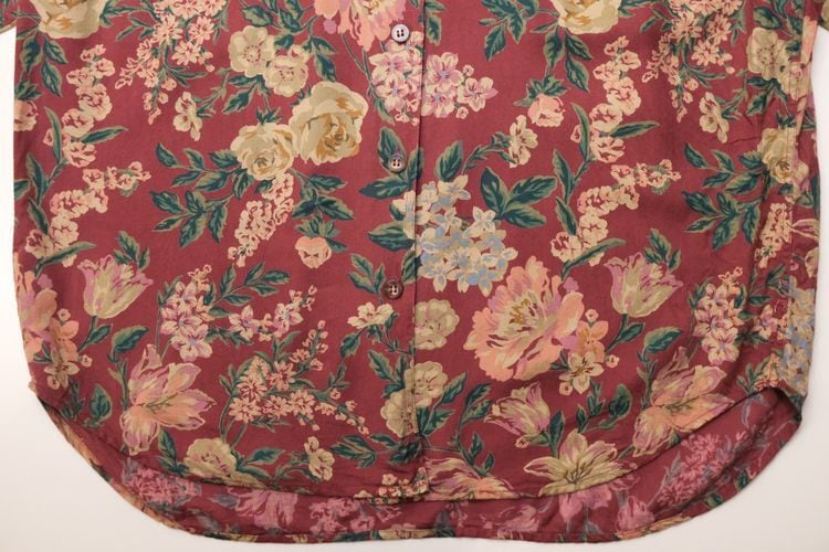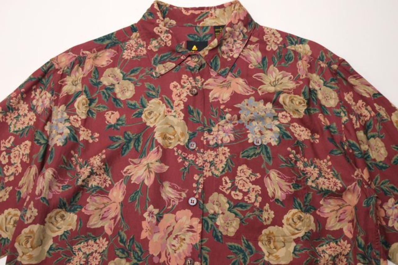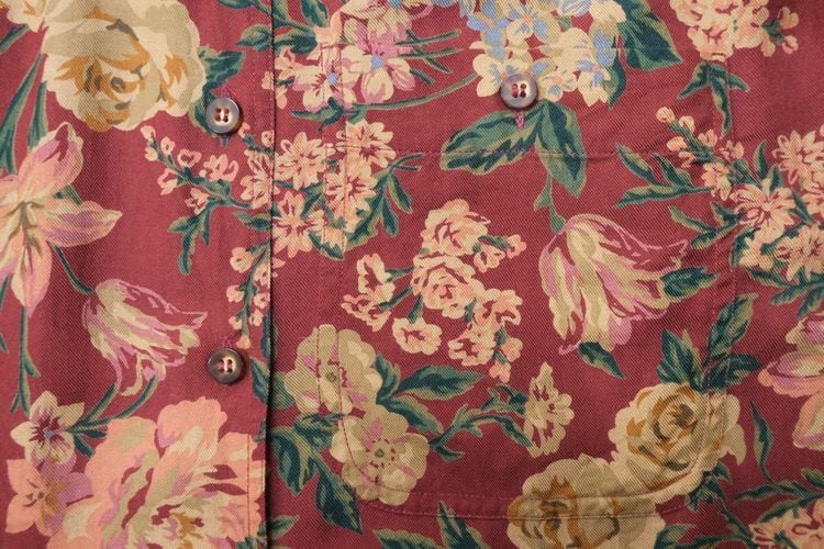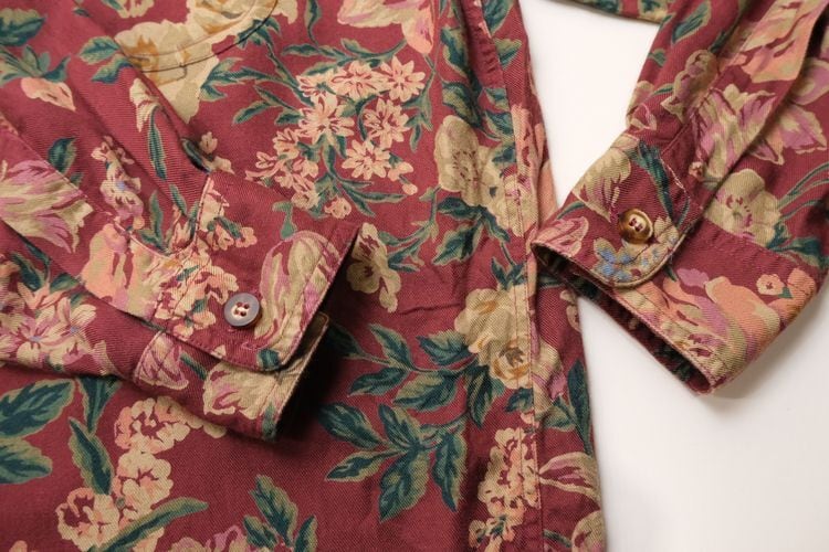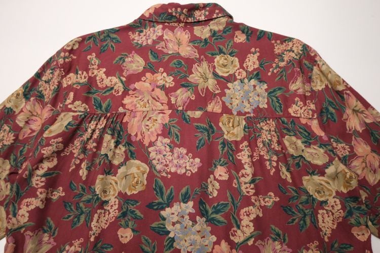 1976年に自身の名を冠しニューヨークで創設されたファッション・ブランド"Liz Claiborne"より、"Liz Sport"ラインの80年代ボタニカル柄レーヨンのオーバーサイズドシャツ。美しく咲き乱れる野花たちのテキスタイルが目を引くアイテムです。フロントにタック、バックにギャザーの入ったゆったりシルエット、柄合わせされた胸ポケットや厚いボタンが特徴のデザイン。くたりと肌に馴染むレーヨンの柔らかな素材感が雰囲気良く、ロングシーズンお楽しみいただけます。コンディションとして多少の着用感があり、フロント前立て付近やバックヨーク下など複数箇所に糸の引きつれが見られますのでUSED品とご確認の上ご検討ください。柔らかなトーンのボタニカルプリントが肌馴染み良く、スタイリングを華やかに彩ります。