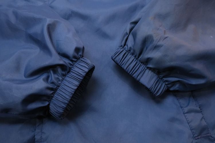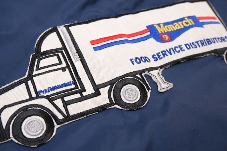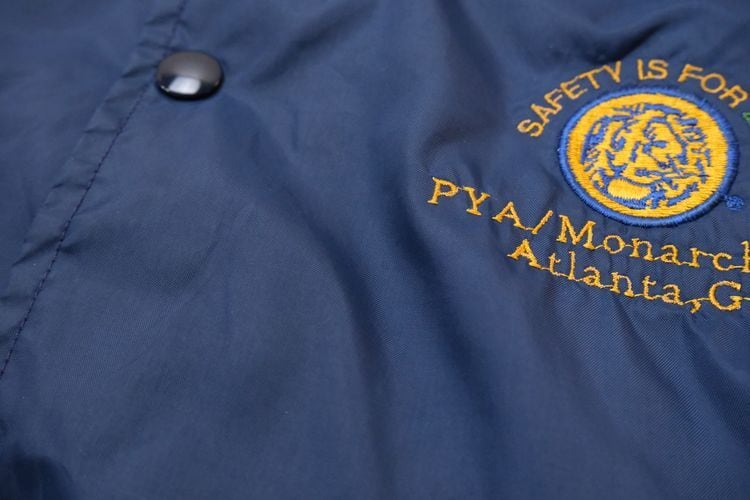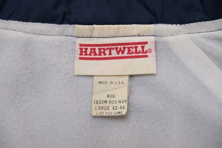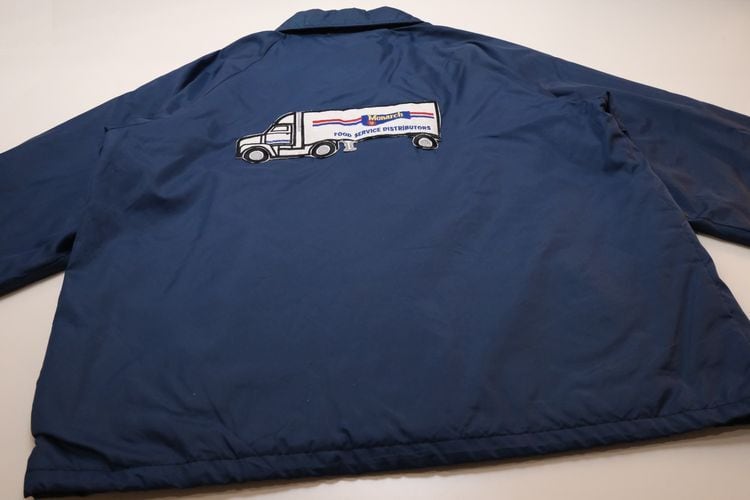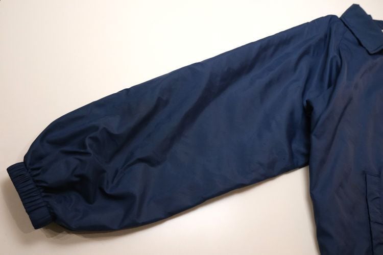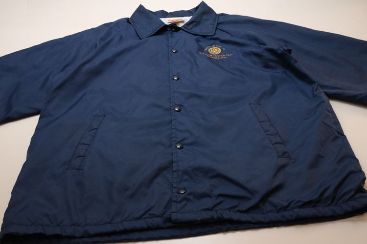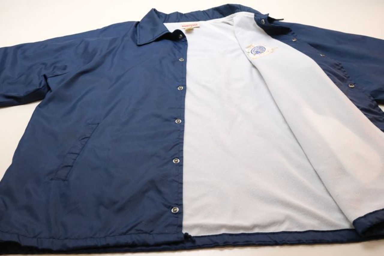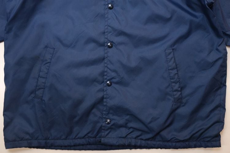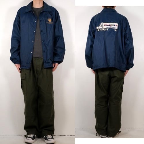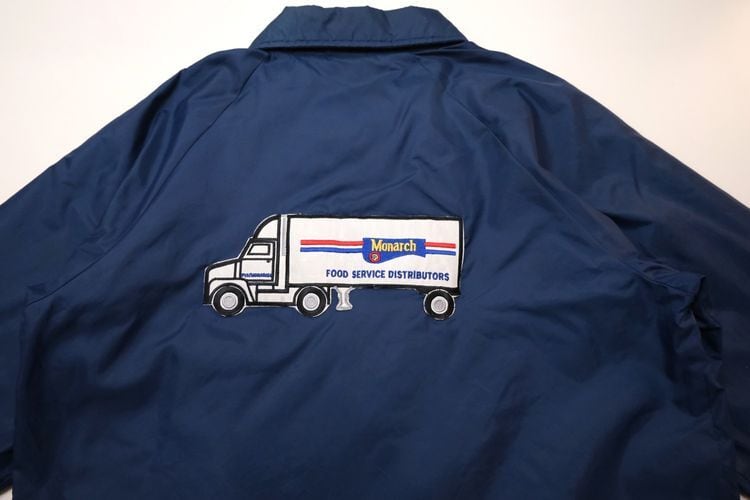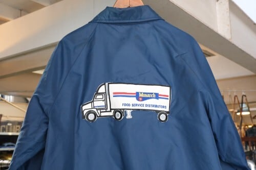 1939年にジョージア州ハートウェルで設立されたスポーツ・ウェア・ブランド"HARTWELL"から80年代頃のコーチ・ジャケット。シェルに薄手で張りのある100%ナイロンを使用し、ライニングに袖口まで薄手のポリエステルが張られたほんのりと温かな着心地のアイテムです。程よいボリュームあるシルエットにすっきりとした印象を生むラグラン・スリーブ、シンプルなボタンアップ×スラッシュポケット、左胸に刺繍で施されたアメリカの大手食品流通企業"PYA/Monarch,Inc."のロゴ、バックにカラフルなトラックの刺繍ワッペンが大胆に配置されたアイコニックなグラフィックと立体感が存在感を引き立たせています。着用の上で問題となる大きなダメージや汚れはございませんが、両袖口やポケット縁などに薄っすらとした汚れ、全体的に着用感の強いUSEDコンディションですので普段から古いものをご愛用の方におすすめ致します。幅広いトップ×ボトムスにさらっと羽織ることのできる気軽なカジュアル感が良く、深みあるネイビーのスマートな色味と企業ものらしい刺繍とパッチの組み合わせがたいへん魅力的な1本です。