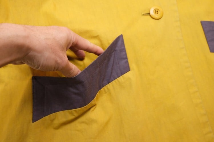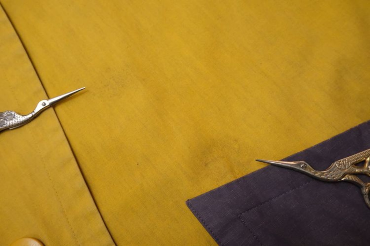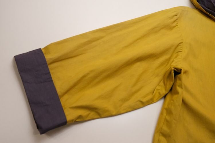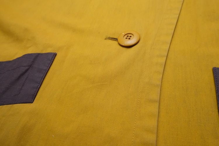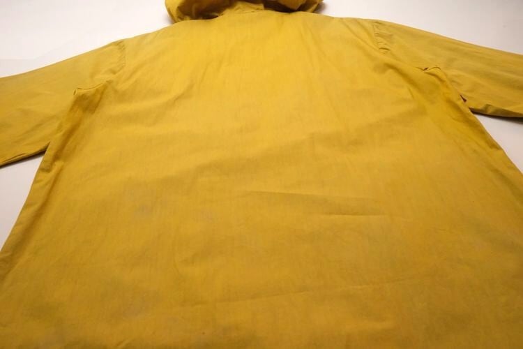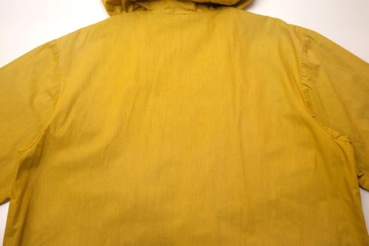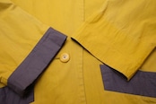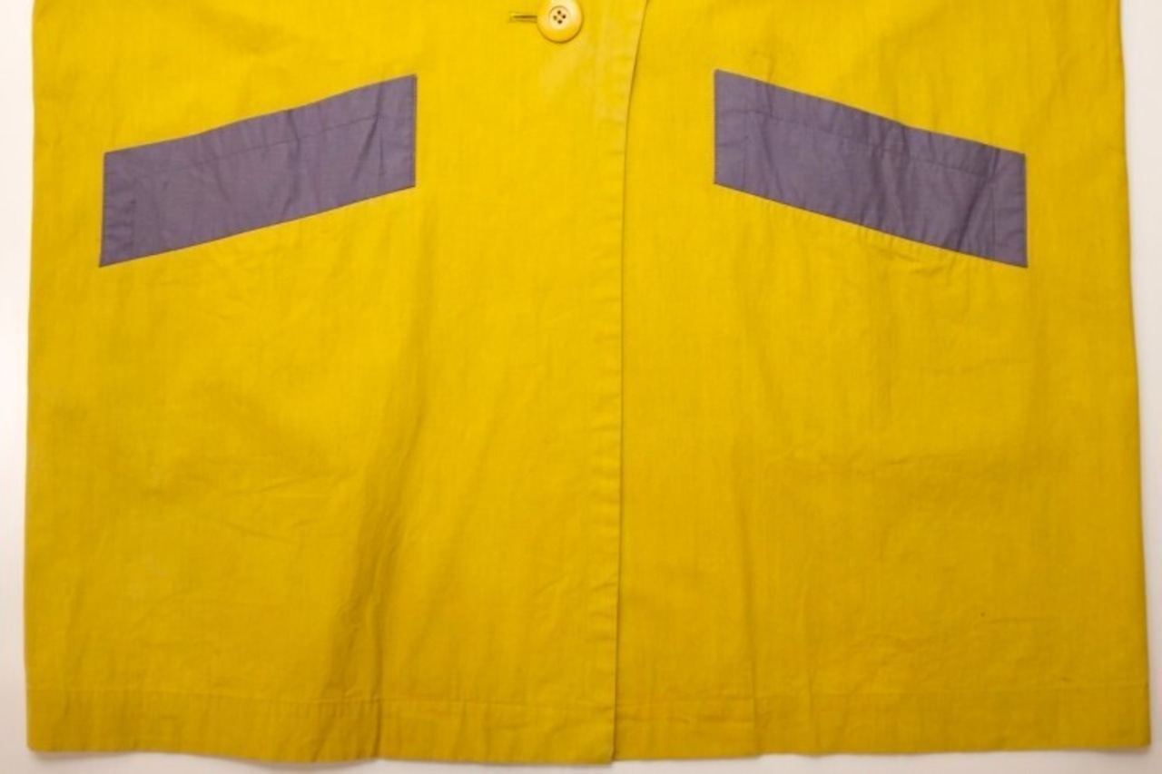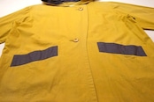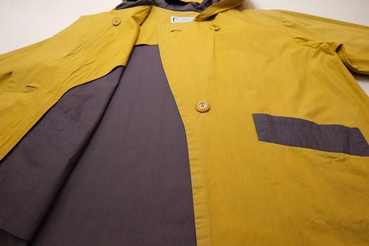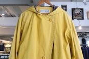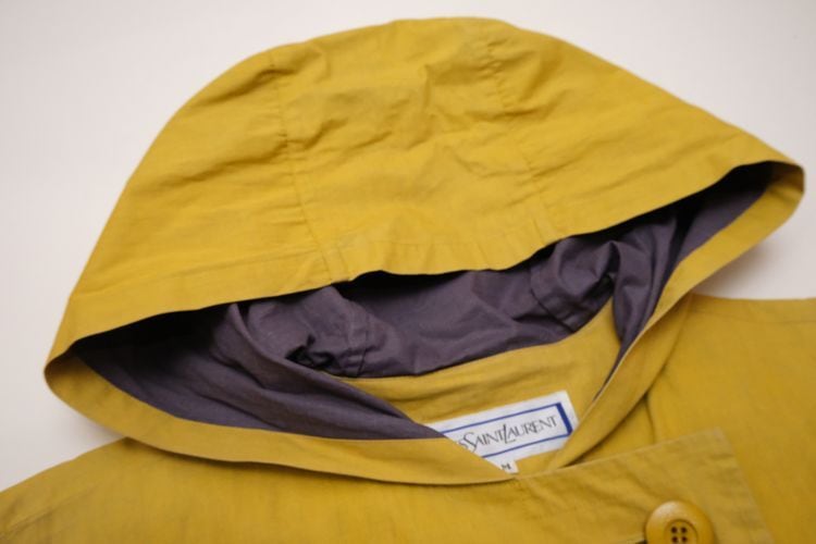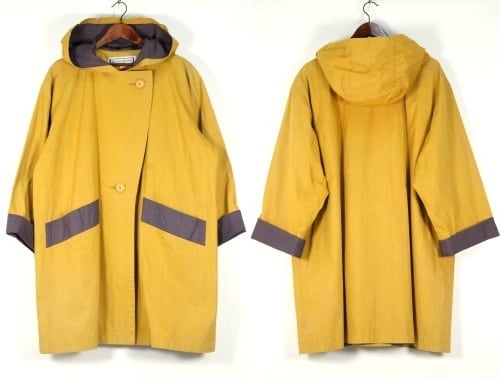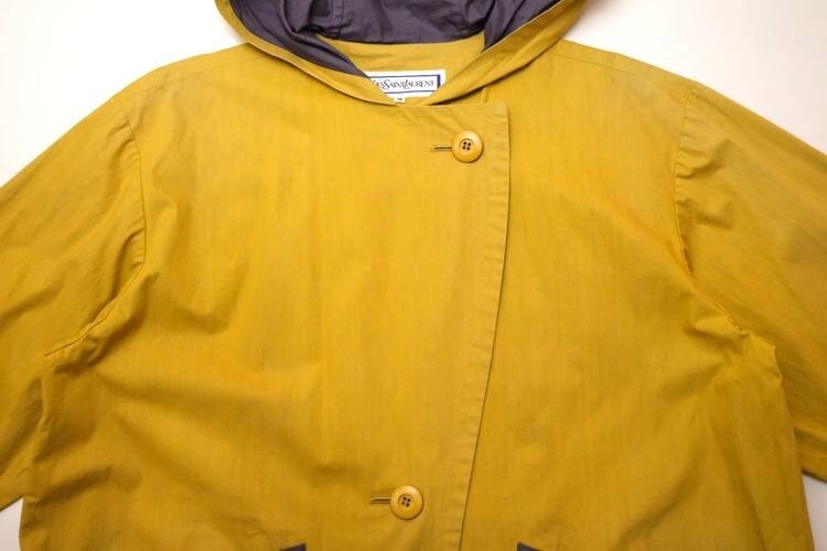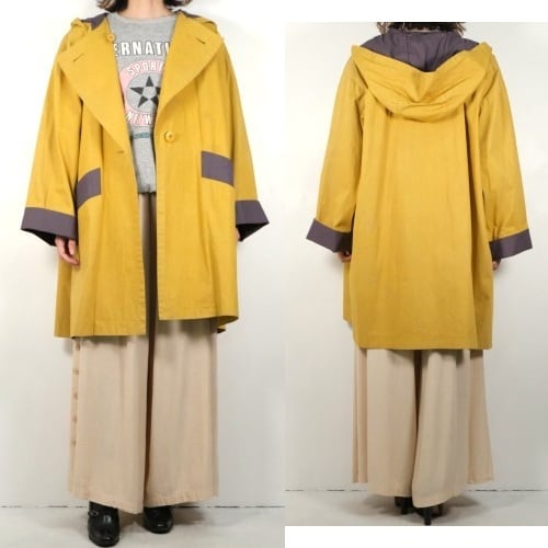 80年代"Yves Saint Laurent"バイカラーのフード付きコート。古さを感じないモダンなデザインが特徴のヴィンテージコートです。フリーサイズといったスタイルのオーバーサイズシルエットに、効果的な2色使いのデザイン。締めるとアシンメトリーな曲線を描き、開けると大きなラペルになるフロントのカットがユニークです。表がイエロー、裏がパープルのコットンダブルフェイス生地は、独特の張りのある質感と掠れたような色みがたいへん雰囲気良く、軽い着心地も魅力です。コンディションとして多少の着用感があり、ボタンに経年劣化によるクラック、左フロント腹部に点状のシミ、左袖後ろにスポットシミと線状の汚れなど見られますのでUSED品とご確認の上ご検討ください。ハイブランドの貫禄ある佇まいとカジュアル感のバランスが絶妙な、希少なヴィンテージピースです。