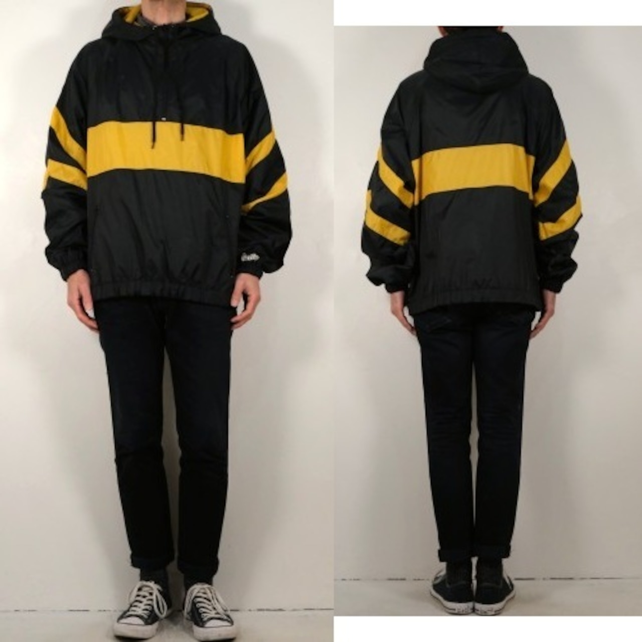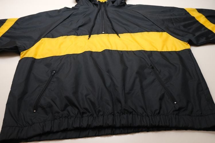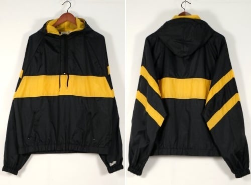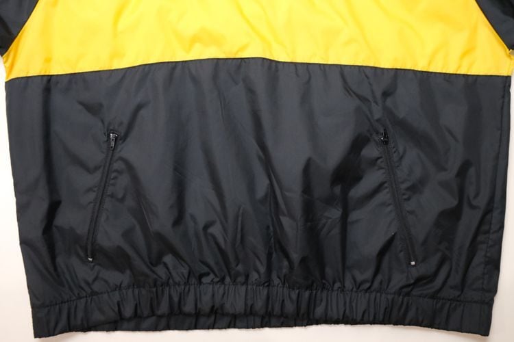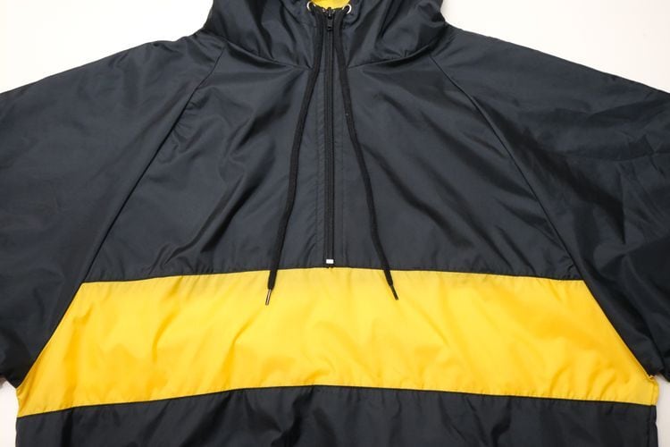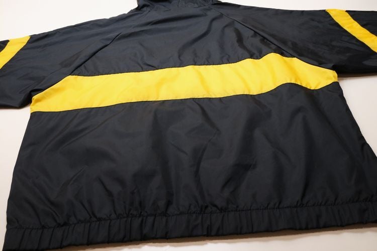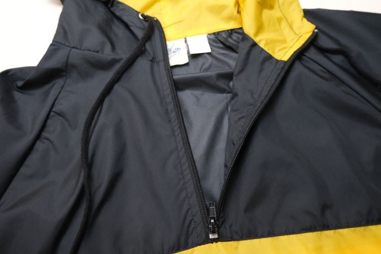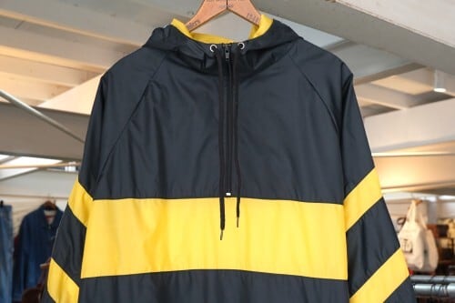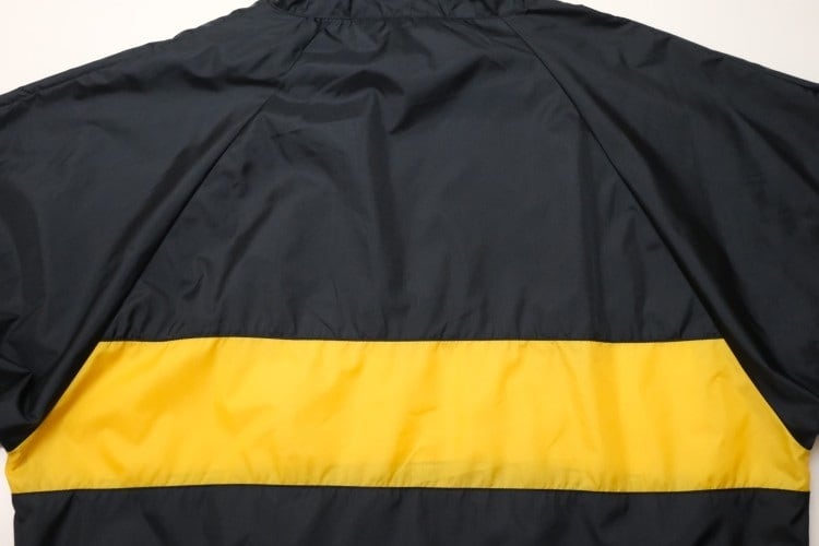 1980年にウィスコンシン州ウォーソーで設立されたスポーツウェア・ブランド"EAST BAY"から80年代後期頃と思われるプルオーバー・ジャケット。薄手でマットな光沢を持つ高密度の100%ナイロンを使用し、裏地には薄くウレタン・コーティングが施された適度な張り感と防風性に優れたアイテムです。ざっくりとした着用に適したハーフジップ・プルオーバー、すっきりとした見た目を生むラグラン・スリーブ、フード付き、ジップ付きのスラッシュ・ポケット、左袖口に刺繍で施されたブランド・ロゴ、そしてブラックをベースにイエローの大胆な切り替えが効いたコントラストが視覚的にもインパクトのある仕上がりとなっています。着用の上で問題となるダメージや汚れはございませんが、全体的に着用感のあるUSEDコンディションですのでご理解の上ご検討ください。厚手のトップの上から着用しても窮屈にならない大きめのシルエットによって合わせるもの次第でフルシーズン楽しんでいただけ、シンプルなボトムスにさらっと合わせるだけでスポーツ・ミックスの空気感を演出できる1本です
