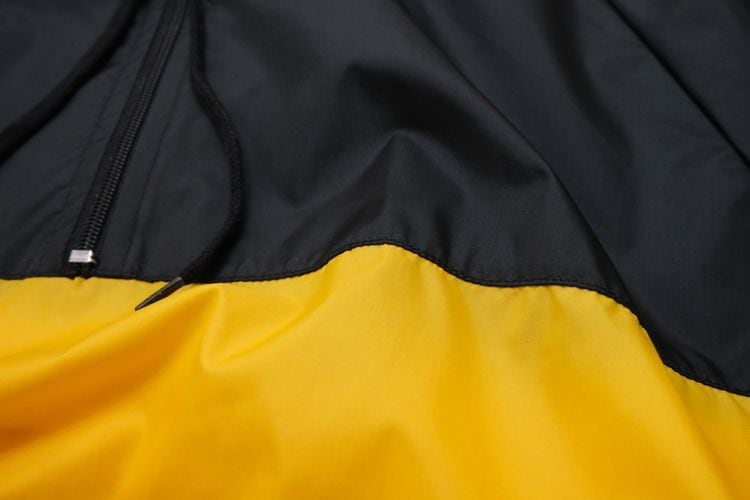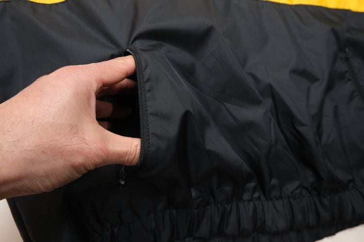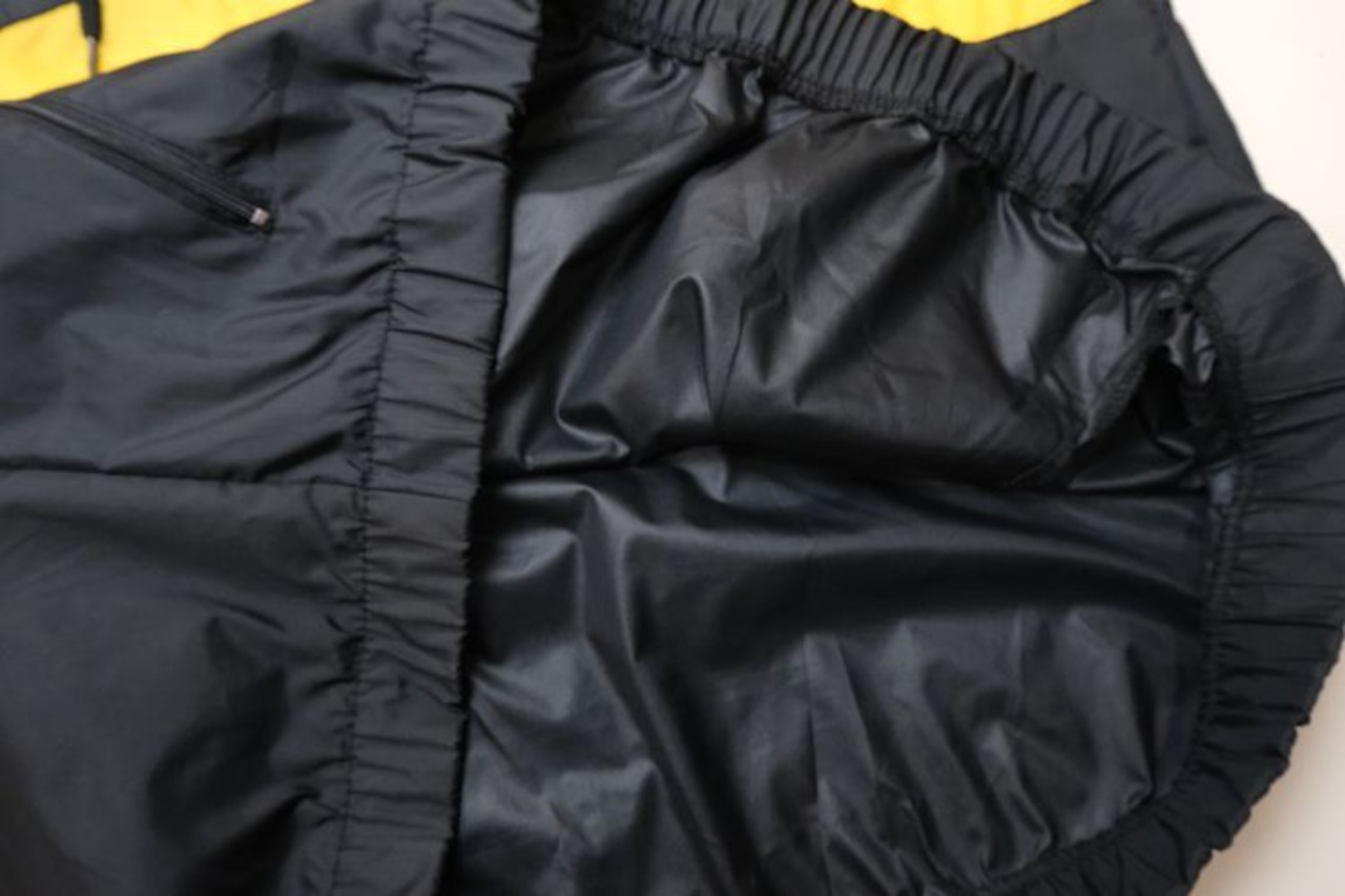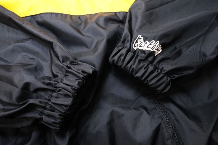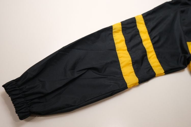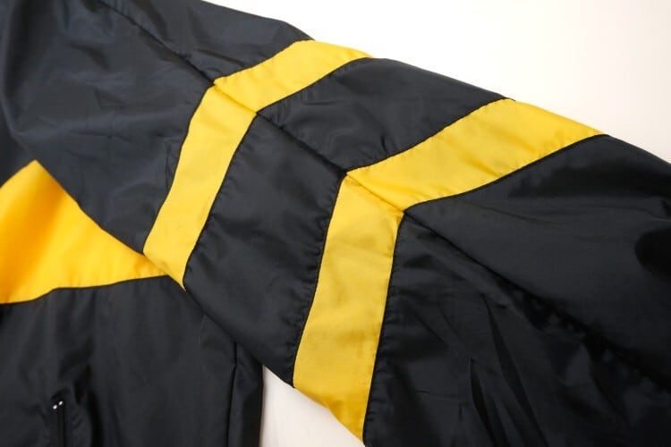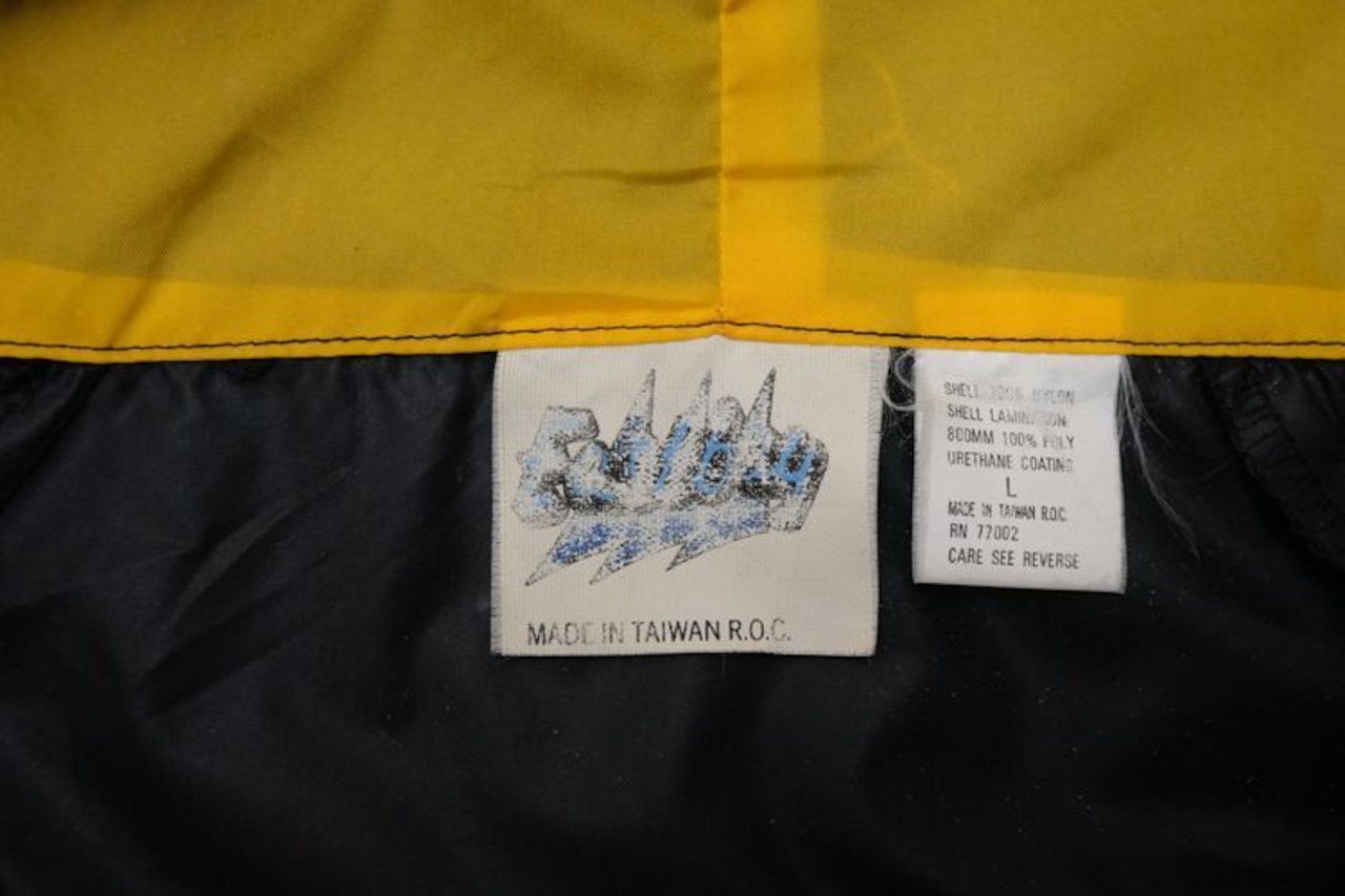 1980年にウィスコンシン州ウォーソーで設立されたスポーツウェア・ブランド"EAST BAY"から80年代後期頃と思われるプルオーバー・ジャケット。薄手でマットな光沢を持つ高密度の100%ナイロンを使用し、裏地には薄くウレタン・コーティングが施された適度な張り感と防風性に優れたアイテムです。ざっくりとした着用に適したハーフジップ・プルオーバー、すっきりとした見た目を生むラグラン・スリーブ、フード付き、ジップ付きのスラッシュ・ポケット、左袖口に刺繍で施されたブランド・ロゴ、そしてブラックをベースにイエローの大胆な切り替えが効いたコントラストが視覚的にもインパクトのある仕上がりとなっています。着用の上で問題となるダメージや汚れはございませんが、全体的に着用感のあるUSEDコンディションですのでご理解の上ご検討ください。厚手のトップの上から着用しても窮屈にならない大きめのシルエットによって合わせるもの次第でフルシーズン楽しんでいただけ、シンプルなボトムスにさらっと合わせるだけでスポーツ・ミックスの空気感を演出できる1本です