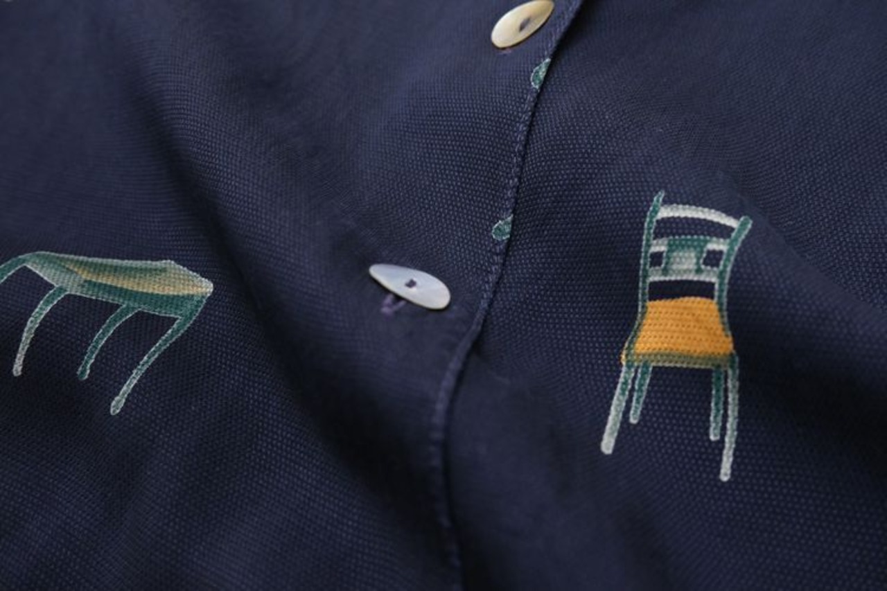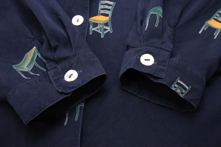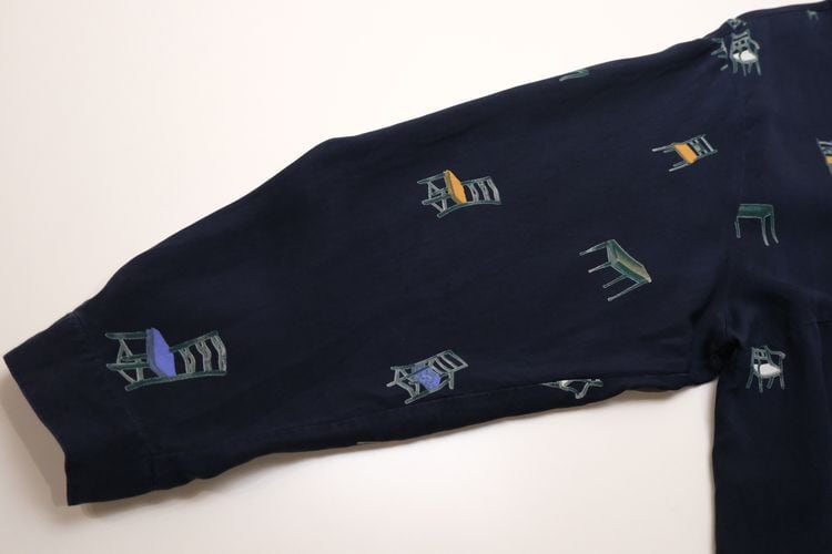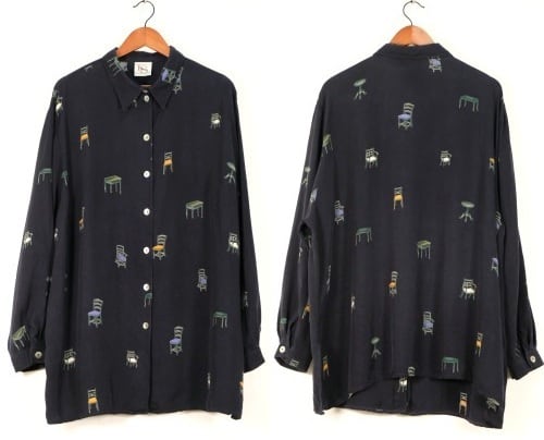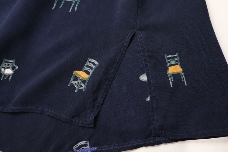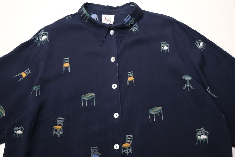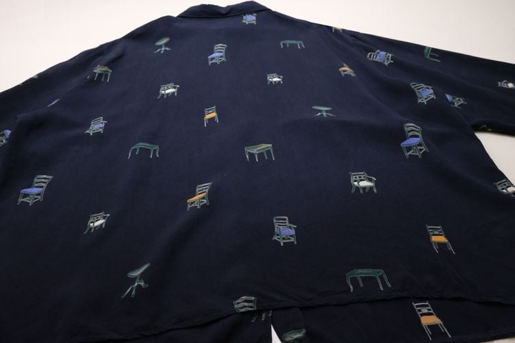 2000年代チェア&テーブル柄のレーヨンシャツ。様々なデザインの椅子やテーブルが描かれた、抜け感のあるテキスタイルが目を引くいく一品です。サイドスリット入りのボックスシャツ型に、大きめの貝ボタンがアクセントになったシンプルなデザイン。やや粗目に織り上げられた生地は、独特の風合いとくたり柔らかく肌触りの良い着心地が魅力となっています。とくに目立ったダメージはございませんが、多少の着用感が見られますのであくまでUSED品とご確認の上ご検討ください。カラーリングやスタイルにはきちんと感があり、遊び心の効いたテキスタイルは大人の外しアイテムとしてもお勧めです。