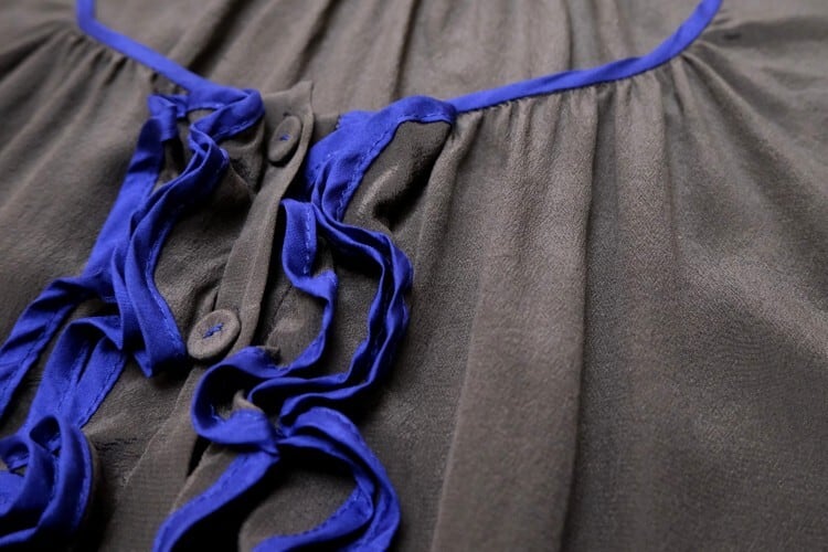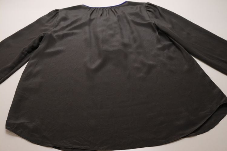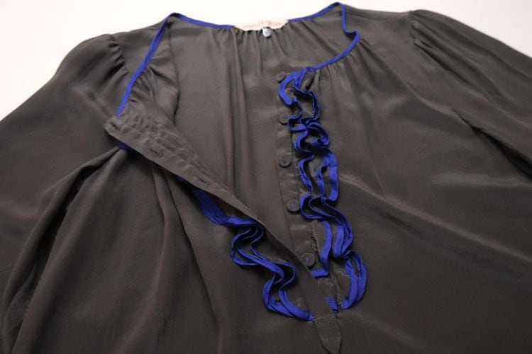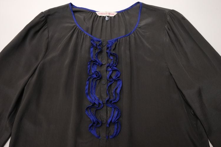 1996年ニューヨークに設立されたレディースファッションブランド"REBECCA TAYLOR"より、フリル付きのシルクブラウス。女性らしさを引き立てるデザインを得意とするブランドで、ネックラインの美しさや控えめながらもエレガントなカラーリングが目を引く一品です。U型ヘンリーネックと袖口にカラーパイピングのフリルをあしらったデザイン、首まわりのギャザーやパフスリーブがフェミニンなディテール。鈍い光沢がエレガントな薄手シルククレープ生地を使用し、美しいラインを保つ仕立ての良さも魅力となっています。コンディションとして多少の着用感が見られますのでUSED品とご確認の上ご検討ください。シルク素材のためロングシーズン、幅広いシーンに合わせて活躍してくれる一品です。