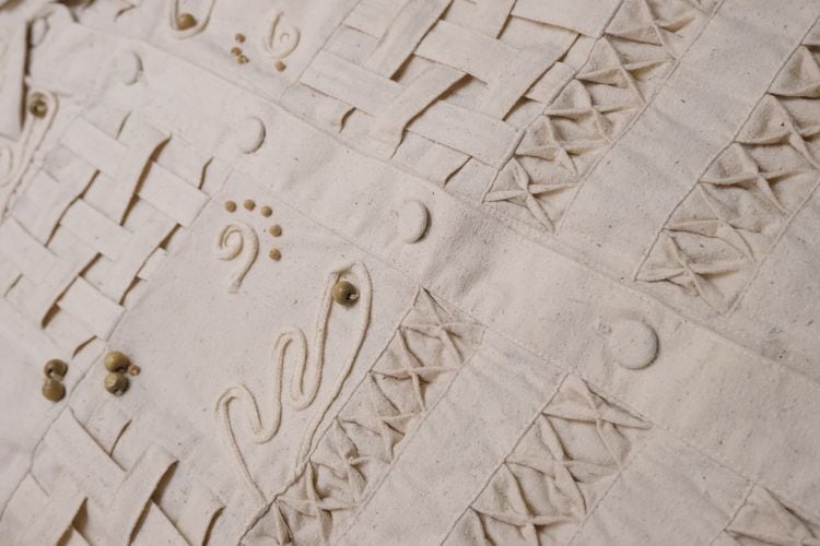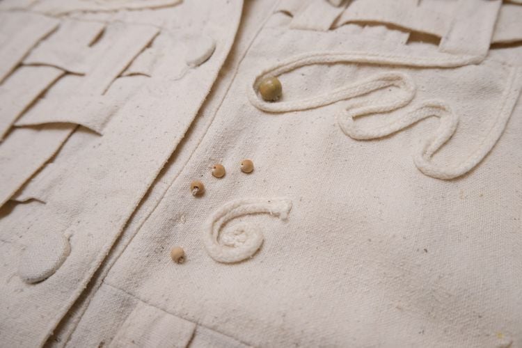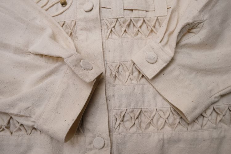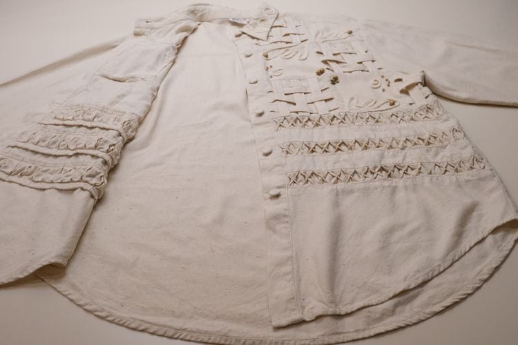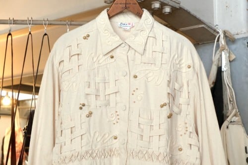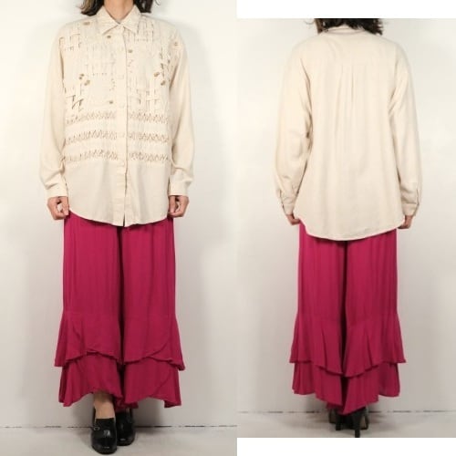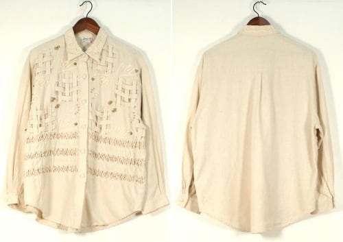 80年代"Lim's"シルクノイルのクラフトワーク・シャツ。自然素材を用いた精巧なかぎ針編みを得意とするアメリカのヴィンテージブランド"Lim's"ですが、こちらは非常に手の込んだクラフトデザインが詰まった圧巻のシャツです。ゆったりとしたオーバーサイズシルエットに、前身頃全体に施されたスモッキングやテープワークによる立体的な装飾。キャンバスのような凹凸感とネップが特徴のシルクノイル素材は吸湿性・放湿性にすぐれ、汗をかきやすい季節でも蒸れにくく、肌に優しく快適な着心地でお楽しみいただけます。コンディションは良くとくに目立ったダメージは見られません。一枚での着こなしはもちろん、羽織としてもお使いいただけ、楽しく個性のあるスタイリングをお楽しみいただけるアイテムです。