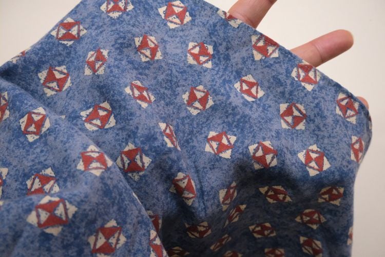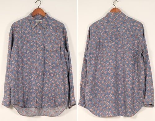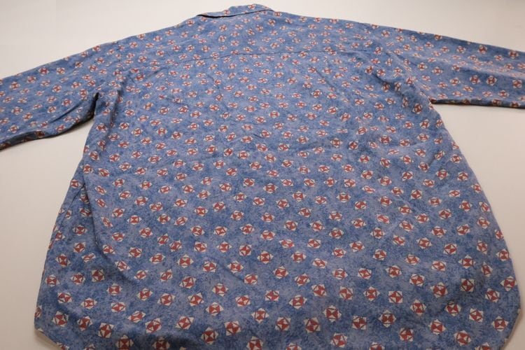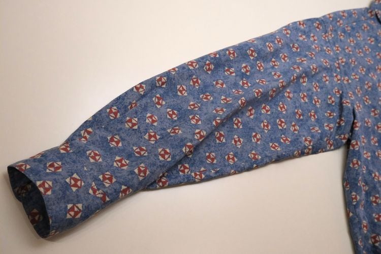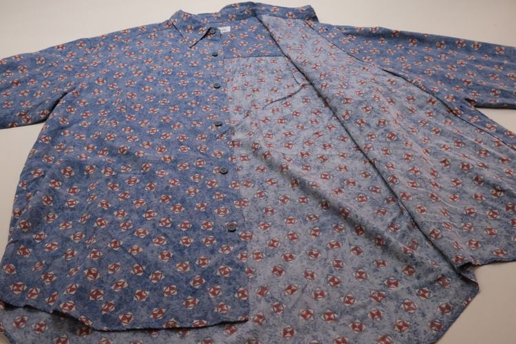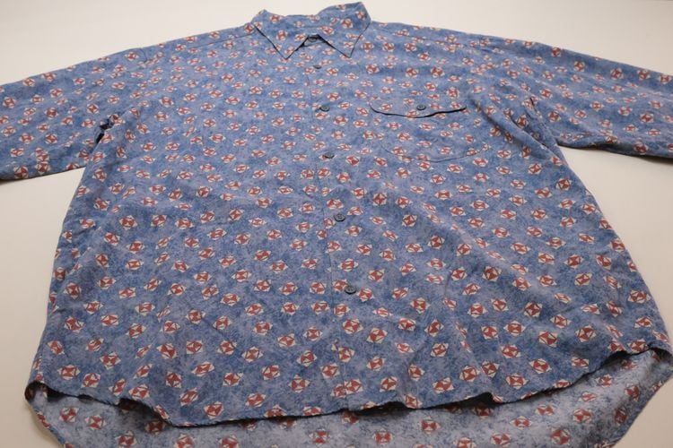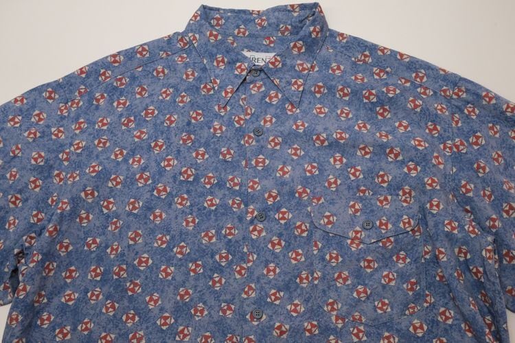 90年代初期頃と思われるローカル・ブランド"FIRENZE"のシャツ。やや薄手でしなやかな100%レーヨン(表記なし)を使用し、清涼感のあるライトブルーにブルーを溶け込ませた奥行きある色調に、レッド×ホワイトの幾何学模様を散りばめたテキスタイルがカジュアルな雰囲気のアイテムです。ざっくりとした着用に適したボリュームのあるシルエット、小ぶりな襟、フラップ付きの胸ポケットなどシンプルなディテールで仕上げられています。着用の上で問題となるダメージや汚れのない良いコンディションですが、あくまでUSED品ですのでご理解の上ご検討ください。デニムやチノ・パンツと合わせたリラックス感あるスタイリングから、スラックスで品良くまとめたスマートな着こなしまで、合わせるボトムス次第で様々な表情を楽しめる汎用性の高い1本です。