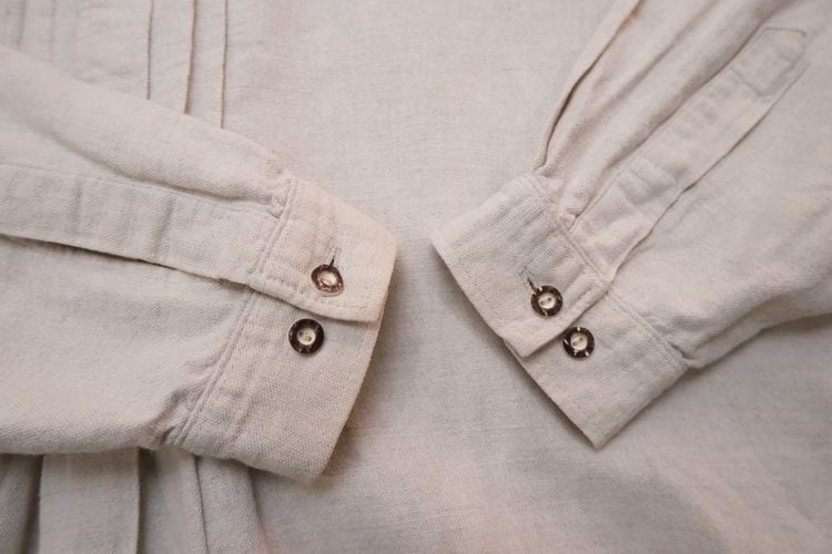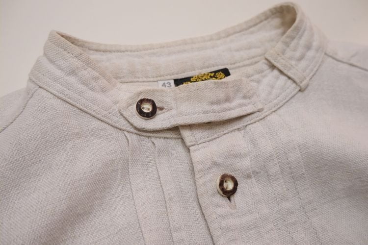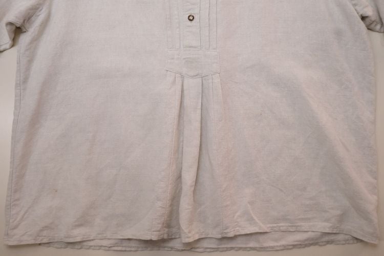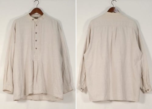 2000年代リネンのチロリアンシャツ。ざっくりとしたリネンの生地感が雰囲気の良いスモックシャツです。フロントボタン開閉のプルオーバースタイルに、チンストラップ付きのスタンドカラー、たっぷりボリュームのある袖のシルエットが特徴です。おそらく100%リネンと思われる中厚手の生地は自然な風合いと肌触りの良さが魅力です。コンディションとして多少の着用感があり、右フロント裾や右胸、左腹部あたりにそれぞれシミが点在しておりますのでUSED品とご確認の上ご検討ください。一枚で雰囲気良くリラックスした着心地で、デイリーの着こなしに活躍してくれる一品です。