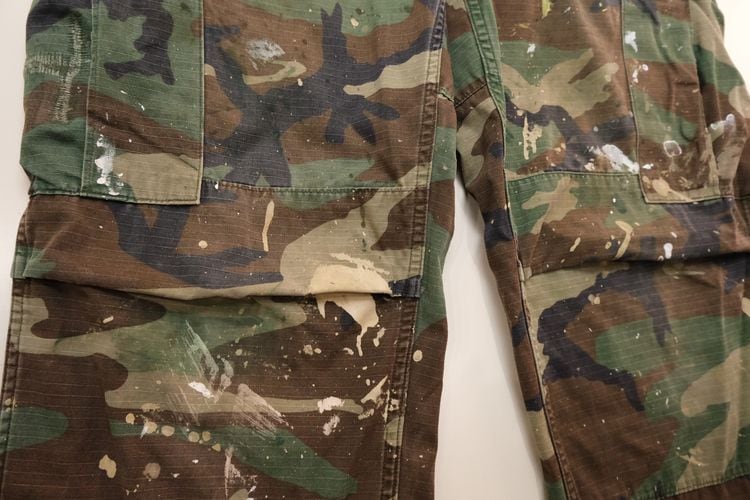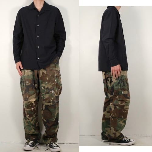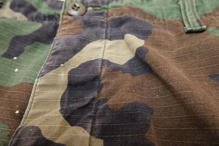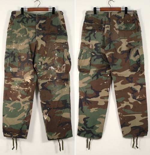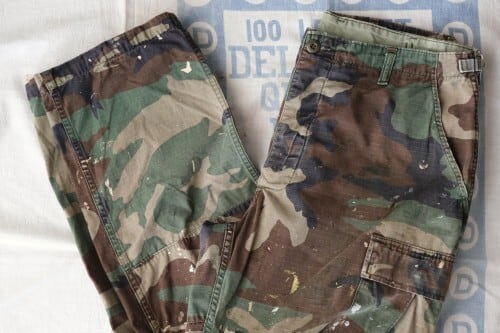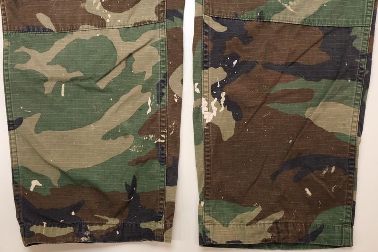1981年にアメリカ軍で正式採用された"WOODLAND CAMOUFLAGE HOT WEATHER TROUSERS"の80年代(1987年製/DLA100-87-C-0420)ウッドランド・カーゴ・パンツ。程よい厚さでしっかりとした100%コットンのリップ・ストップを使用し、カーゴ・ポケット、ウエストのアジャスター、裾口の絞りなどによるカーゴ・パンツらしい仕上がりのアイテムです。着用の上で問題となるダメージ汚れはございませんが、右のカーゴ・ポケットにダメージ補修、全体的にペンキ汚れのある着古されたコンディションですので、この1点ものらしい風合いを好まれる方におすすめ致します。幅広いトップに合わせることのできる使い勝手の良さと、リラックスした履き心地でシーズンを問わずお楽しみいただける1本です。