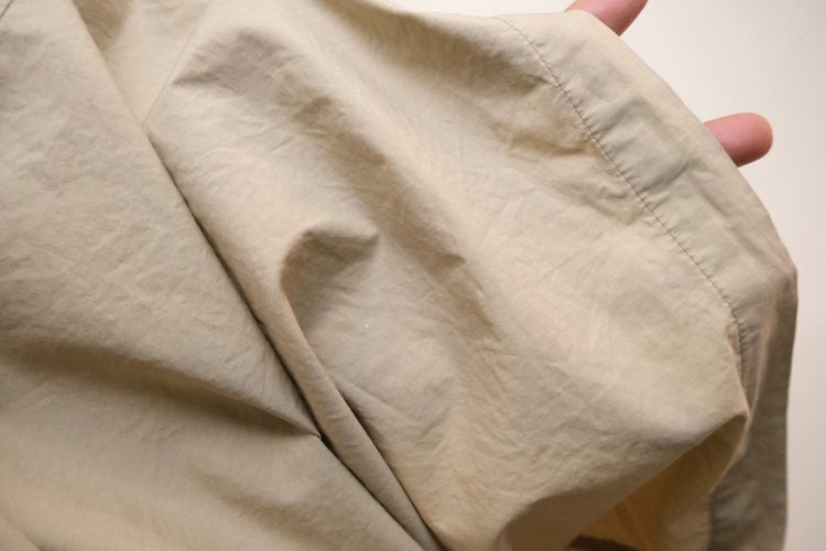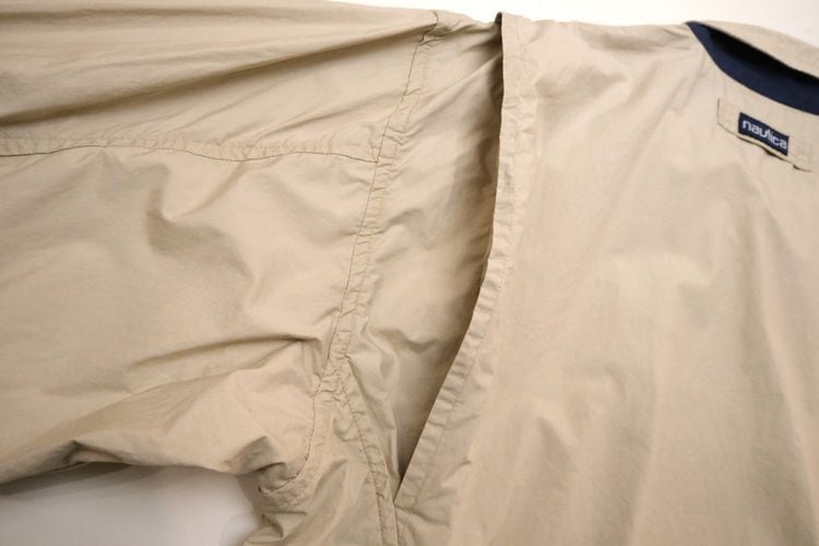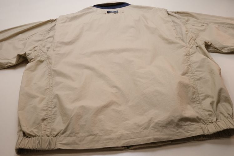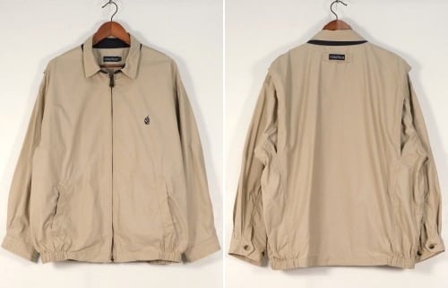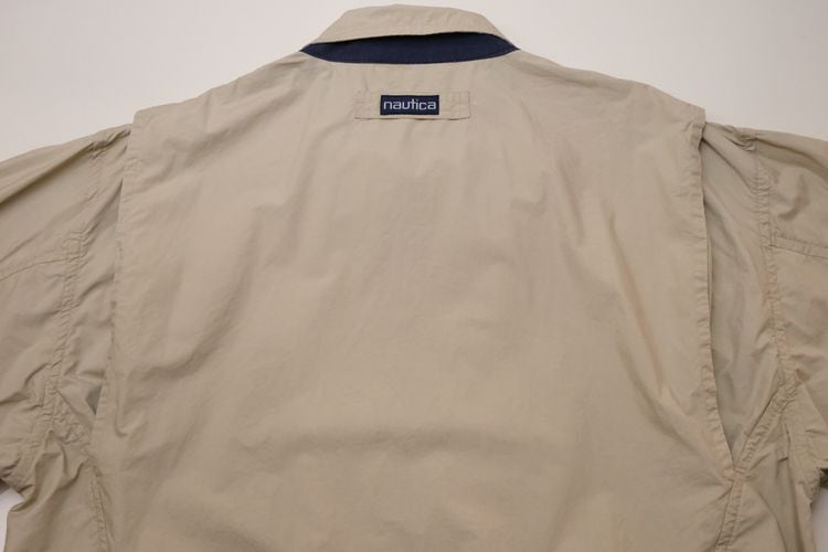 1983年にニューヨークで創業されたカジュアル・ファッション・ブランド"NAUTICA"『ノーティカ』から90年代頃と思われるジャケット。薄手でぱりっと張りのある100%コットン(表記なし)を使用し、やわらかなライトベージュの色味が爽やかな雰囲気のアイテムです。ゆったりとリラックスした着用に適したオフショルダーのボリュームあるシルエット、チン・ストラップの付く小ぶりなカラー、ジップアップ・フロント、スラッシュ・ポケット、後部のアクション・プリーツ、そしてネイビーで施されたセーリングのロゴ刺繍がアクセントとなっています。着用の上で問題となるダメージや汚れはございませんが、全体的に着用感のあるUSEDコンディションですのでご理解の上ご検討ください。シンプルなカットソーやシャツにさらっと合わせるだけで、カジュアルながら大人っぽい印象を演出することができるおすすめの1本です。